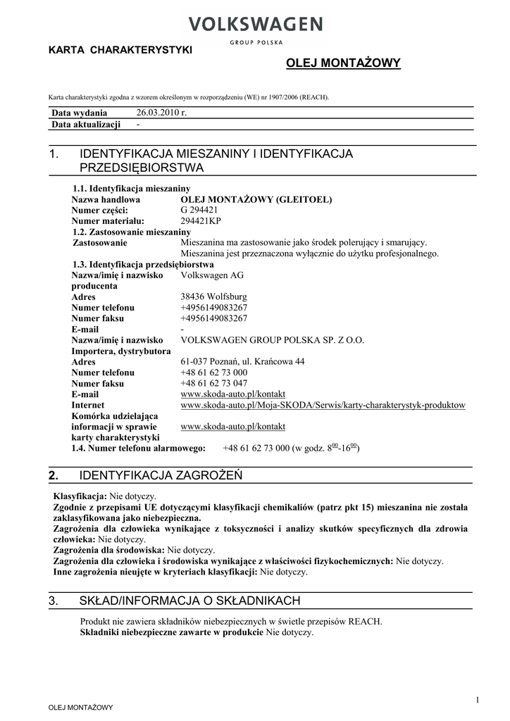 KARTA CHARAKTERYSTYKI OLEJ MONTAŻOWY Karta charakterystyki zgodna z wzorem określonym w rozporządzeniu (WE) nr 1907/2006 (REACH). Data wydania Data aktualizacji 1. 26.03.2010 r. - IDENTYFIKACJA MIESZANINY I IDENTYFIKACJA PRZEDSIĘBIORSTWA 1.1. Identyfikacja mieszaniny Nazwa handlowa OLEJ MONTAŻOWY (GLEITOEL) G 294421 Numer części: 294421KP Numer materiału: 1.2. Zastosowanie mieszaniny Mieszanina ma zastosowanie jako środek polerujący i smarujący. Zastosowanie Mieszanina jest przeznaczona wyłącznie do użytku profesjonalnego. 1.3. Identyfikacja przedsiębiorstwa Volkswagen AG Nazwa/imię i nazwisko producenta 38436 Wolfsburg Adres +4956149083267 Numer telefonu +4956149083267 Numer faksu E-mail VOLKSWAGEN GROUP POLSKA SP. Z O.O. Nazwa/imię i nazwisko Importera, dystrybutora 61-037 Poznań, ul. Krańcowa 44 Adres +48 61 62 73 000 Numer telefonu +48 61 62 73 047 Numer faksu www.skoda-auto.pl/kontakt E-mail www.skoda-auto.pl/Moja-SKODA/Serwis/karty-charakterystyk-produktow Internet Komórka udzielająca www.skoda-auto.pl/kontakt informacji w sprawie karty charakterystyki 1.4. Numer telefonu alarmowego: +48 61 62 73 000 (w godz. 800-1600) 2. IDENTYFIKACJA ZAGROŻEŃ Klasyfikacja: Nie dotyczy. Zgodnie z przepisami UE dotyczącymi klasyfikacji chemikaliów (patrz pkt 15) mieszanina nie została zaklasyfikowana jako niebezpieczna. Zagrożenia dla człowieka wynikające z toksyczności i analizy skutków specyficznych dla zdrowia człowieka: Nie dotyczy. Zagrożenia dla środowiska: Nie dotyczy. Zagrożenia dla człowieka i środowiska wynikające z właściwości fizykochemicznych: Nie dotyczy. Inne zagrożenia nieujęte w kryteriach klasyfikacji: Nie dotyczy. 3. SKŁAD/INFORMACJA O SKŁADNIKACH Produkt nie zawiera składników niebezpiecznych w świetle przepisów REACH. Składniki niebezpieczne zawarte w produkcie Nie dotyczy. 1 OLEJ MONTAŻOWY KARTA CHARAKTERYSTYKI OLEJ MONTAŻOWY 4. PIERWSZA POMOC Uwagi ogólne W przypadku wystąpienia jakichkolwiek niepokojących objawów wezwać natychmiast lekarza lub odwieźć poszkodowanego do szpitala, pokazać kartę charakterystyki, opakowanie mieszaniny lub etykietę. Objawy zatrucia Mieszanina jeżeli jest stosowana zgodnie z przepisami BHP nie stanowi zagrożenia dla człowieka. Jednak odbryzgi cieczy, które dostaną się do oczu, mogą powodować podrażnienia, łzawienie oraz nieodwracalne uszkodzenie oczu, szczególnie u osób bardzo wrażliwych lub ze skłonnością do alergii. Spożycie drogą pokarmową może wywołać podrażnienie błony śluzowej poszczególnych odcinków układu pokarmowego, nudności, wymioty, bóle brzucha (szczegółowy opis patrz pkt 11). Wdychanie Wyprowadzić lub wynieść poszkodowanego na świeże powietrze. Zapewnić poszkodowanemu ciepło i warunki do odpoczynku. W przypadku zatrzymania lub nieregularnego oddechu zastosować sztuczne oddychanie. Natychmiast wezwać lekarza. Oczy Usunąć szkła kontaktowe. Natychmiast płukać oczy, przytrzymując odchylone powieki, dużą ilością bieżącej, chłodnej wody - nie stosować zbyt silnego strumienia wody ze względu na możliwość uszkodzenia rogówki. Przemywać oczy, przez co najmniej 15 minut. W przypadku zanieczyszczenia jednego oka należy chronić w trakcie przemywania drugie oko przed zanieczyszczeniem. Skonsultować się z lekarzem okulistą. Skóra Natychmiast zdjąć skażoną odzież i buty, myć skórę dużą ilością bieżącej, chłodnej wody z mydłem. Nie stosować mydła, jeśli są zmiany na skórze. W przypadku wystąpienia zmian skórnych natychmiast wezwać lekarza. Odzież i buty dokładnie oczyścić i wyprać przed ponownym użyciem. Połknięcie Jeżeli poszkodowany jest całkowicie przytomny powinien dokładnie wypłukać wodą jamę ustną. Nie podawać do picia niczego osobie nieprzytomnej!!! Zażyć węgiel aktywny. Zapewnić poszkodowanemu ciepło i warunki do odpoczynku. Nie prowokować wymiotów. Przewieźć zatrutego do szpitala w celu obserwacji i ewentualnego leczenia. Pokazać kartę charakterystyki, opakowanie lub etykietę. UWAGA Pacjenta nieprzytomnego ułożyć w pozycji bocznej ustalonej, zapewnić zatrutemu spokój, chronić przed utratą ciepła, kontrolować oddech i puls. Nigdy nie wywoływać wymiotów ani nie podawać niczego doustnie osobie nieprzytomnej lub zamroczonej. Przewieźć zatrutego do szpitala w celu obserwacji i ewentualnego leczenia. Pokazać kartę charakterystyki, opakowanie lub etykietę. 5. POSTĘPOWANIE W PRZYPADKU POŻARU Zalecane środki gaśnicze: Mały pożar: gasić gaśnicą proszkową, śniegową, gaśnicą pianową odporną na alkohol, prądami wodnymi rozproszonymi. Duży pożar: palące się zbiorniki lub rozlewiska gasić gaśnicą pianową lub prądami wodnymi rozproszonymi. Nie używać zwartych strumieni wodnych. Zbiorniki narażone na działanie ognia lub wysokiej temperatury chłodzić wodą z bezpiecznej odległości; jeśli to możliwe, usunąć je z obszaru zagrożenia. Nie dopuścić do przedostania się wód gaśniczych do kanalizacji. Nieodpowiednie środki gaśnicze: zwarte strumienie wodne Szczególne zagrożenie ze strony produktów spalania i wydzielających się gazów: Podczas pożaru powstają niebezpieczne dla zdrowia pyły i dymy zawierające niebezpieczne dla zdrowia produkty rozkładu: tlenki węgla, tlenki azotu, tlenki siarki i inne związki zawierające siarkę. 2 OLEJ MONTAŻOWY KARTA CHARAKTERYSTYKI OLEJ MONTAŻOWY 5. POSTĘPOWANIE W PRZYPADKU POŻARU Nie wdychać dymów. Specjalne wyposażenie ochronne strażaków: Odzież ochronna z materiałów powlekanych i aparaty izolujące drogi oddechowe niezależne od otaczającego powietrza. Inne uwagi: − zawiadomić otoczenie o pożarze, usunąć z obszaru zagrożenia wszystkie osoby niebiorące udziału w likwidowaniu pożaru − jeśli jest to możliwe bez narażania zdrowia lub życia ratowników usunąć z zagrożonego obszaru zbiorniki narażone na działanie ognia lub wysokiej temperatury −