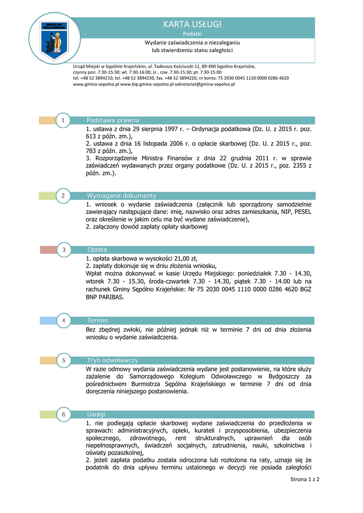KARTA USŁUGI Podatki Wydanie zaświadczenia o niezaleganiu lub stwierdzeniu stanu zaległości Urząd Miejski w Sępólnie Krajeńskim, ul. Tadeusza Kościuszki 11, 89-400 Sępólno Krajeńskie, czynny pon. 7:30-15:30; wt. 7:30-16:00; śr., czw. 7:30-15:30; pt. 7:30-15:00 tel. +48 52 3894210, tel. +48 52 3894230, fax. +48 52 3894220, nr konta: 75 2030 0045 1110 0000 0286 4620 www.gmina-sepolno.pl www.bip.gmina-sepolno.pl [email protected] 1. ustawa z dnia 29 sierpnia 1997 r. – Ordynacja podatkowa (Dz. U. z 2015 r. poz. 613 z późn. zm.), 2. ustawa z dnia 16 listopada 2006 r. o opłacie skarbowej (Dz. U. z 2015 r., poz. 783 z późn. zm.), 3. Rozporządzenie Ministra Finansów z dnia 22 grudnia 2011 r. w sprawie zaświadczeń wydawanych przez organy podatkowe (Dz. U. z 2015 r., poz. 2355 z późn. zm.). 1. wniosek o wydanie zaświadczenia (załącznik lub sporządzony samodzielnie zawierający następujące dane: imię, nazwisko oraz adres zamieszkania, NIP, PESEL oraz określenie w jakim celu ma być wydane zaświadczenie), 2. załączony dowód zapłaty opłaty skarbowej 1. opłata skarbowa w wysokości 21,00 zł, 2. zapłaty dokonuje się w dniu złożenia wniosku, Wpłat można dokonywać w kasie Urzędu Miejskiego: poniedziałek 7.30 - 14.30, wtorek 7.30 - 15.30, środa-czwartek 7.30 - 14.30, piątek 7.30 - 14.00 lub na rachunek Gminy Sępólno Krajeńskie: Nr 75 2030 0045 1110 0000 0286 4620 BGŻ BNP PARIBAS. Bez zbędnej zwłoki, nie później jednak niż w terminie 7 dni od dnia złożenia wniosku o wydanie zaświadczenia. W razie odmowy wydania zaświadczenia wydane jest postanowienie, na które służy zażalenie do Samorządowego Kolegium Odwoławczego w Bydgoszczy za pośrednictwem Burmistrza Sępólna Krajeńskiego w terminie 7 dni od dnia doręczenia niniejszego postanowienia. 1. nie podlegają opłacie skarbowej wydane zaświadczenia do przedłożenia w sprawach: administracyjnych, opieki, kurateli i przysposobienia, ubezpieczenia społecznego, zdrowotnego, rent strukturalnych, uprawnień dla osób niepełnosprawnych, świadczeń socjalnych, zatrudnienia, nauki, szkolnictwa i oświaty pozaszkolnej, 2. jeżeli zapłata podatku została odroczona lub rozłożona na raty, uznaje się że podatnik do dnia upływu terminu ustalonego w decyzji nie posiada zaległości Strona 1 z 2 KARTA USŁUGI Podatki Wydanie zaświadczenia o niezaleganiu lub stwierdzeniu stanu zaległości Urząd Miejski w Sępólnie Krajeńskim, ul. Tadeusza Kościuszki 11, 89-400 Sępólno Krajeńskie, czynny pon. 7:30-15:30; wt. 7:30-16:00; śr., czw. 7:30-15:30; pt. 7:30-15:00 tel. +48 52 3894210, tel. +48 52 3894230, fax. +48 52 3894220, nr konta: 75 2030 0045 1110 0000 0286 4620 www.gmina-sepolno.pl www.bip.gmina-sepolno.pl [email protected] podatkowych, 3. organ podatkowy określa wysokość zaległości podatkowych na dzień wydania zaświadczenia. Strona 2 z 2