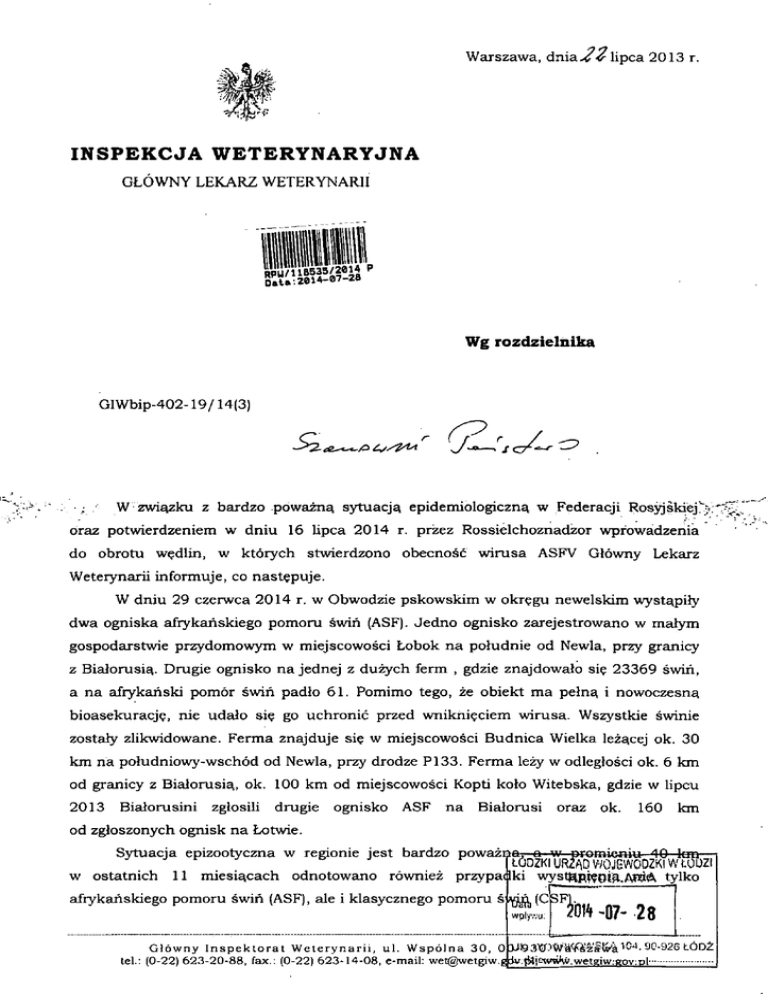 Warszawa, dnia-i?^lipca 2013 INSPEKCJA WETERYNARYJNA GLOWNY LEKARZ WETERYNARII Wg rozdzielnika GIWbip-402-19/14(3) ; W z w i ^ k u z bardzo powazn^ sytuacjsi epidemiologiczn^ w Federacji Rosyjskiej'>; oraz potAvierdzeniem w dniu 16 Upca 2014 r. przez Rossielchoznadzor wprowsidzenia do obrotu w^dlin, w ktorych stwierdzono obecnosc wirusa ASFV Glowny Lekarz Weteiynarii informuje, co nast^puje. W dniu 29 czerwca 2014 r. w Obwodzie pskowskim w okr^gu newelskim wystapily dwa ogniska afiykariskiego pomoru swiri (ASF). Jedno ognisko zarejestrowano w malyin gospodarstwie przydomowym w miejscowosci Lobok na poludnie od Newla, przy granicy z BialorusiE^. Drugie ognisko na jednej z duzych ferm , gdzie znajdowalo si? 23369 swiri, a na afrykariski pomor swiri padlo 61. Pomimo tego, ze obiekt ma peln^ i nowoczesna bioasekuracj?, nie udalo si? go uchronic przed wnikni^ciem wirusa. Wszystkie swinie zostaly zlikwidowane. Ferma znajduje si? w miejscowosci Budnica Wielka lez£(cej ok. 30 km na pohidniowy-wschdd od Newla, przy drodze P133. Ferma lezy w odleglosci ok. 6 km od granicy z Bialorusi^, ok. 100 km od miejscowosci Kopti kolo Witebska, gdzie w lipcu 2013 Bialorusini zglosili drugie ognisko ASF na Bialorusi oraz ok. 160 km od zgloszonych ognisk na Lotwie. Sytuacja epizootyczna w regionie jest bardzo powaz: w ostatnich tOOZKI UR^AD WOJEWODZkTw'totjZI 11 miesi^cach odnotowano rowniez przypacBki wystjsiR^^Oi^.ApiA tylko afrykariskiego pomoru swiri (ASF), ale i klasycznego pomoru s wply.vu: m ^07- 28 G l o w n y I n s p e k t o r a t W e t e r y n a r i i , u l . W s p o l n a 3 0 , 0pJi93Xr:'W-d<ft'^'^tv*ilC4. 9G-926 L6D2 tel.: (0-22) 623-20-88, fax.: (0-22) 623-14-08, e-mail: wet@wetgiw.| .t^jewWw.wetgiw.goviDl Zagrozenie jest tym wi^ksze, ze w przypadku drugiego ogniska, jest to najwi^ksza tego typu firma w regionie. We wrzesniu 2012 roku firma zdecydowala si? na budow? dodatkowych ferm, aby zwi^kszyc zdolnosc produkcyjna kompleksow wieprzowych do 1 mln swiri rocznie. Wybudowano cztery nowoczesne fermy na 480 000 szt. swiri i duza wytworni^ pasz. W latach 2009-2010 rozbudowano rowniez Velikoluskij Miasokombinat. Uruchomiono chlodni? na 3500 ton, zainstalowano nowe linie ubojowe, a zatrudnienie zwi^kszono o 6,5%. Produkcja roczna w 2010 roku wynosila ok. 50000 ton, CO stanowi 97% produkcji mi^snej w Obwodzie pskowskim i 3,4% produkcji mi^snej w Federacji Rosyjskiej. Produkcja roczna w 2012 roku to ok. 100 000 ton. Wyroby kombinatu sprzedawano w 480 miastach Federacji Rosjskiej. Kombinat posiadal siec 625 sklepow firmowych, z czego 149 w St. Petersburgu. Mieso z chorych lub zakazonych swiri trafilo do produkcji w Vielkolutskim Miasokombincie. Przy czym 16 lipca 2014 media rosyjskie i Rossielchoznadzor poinformowaly, ze w probkach wyrobow Vielkolutskiego Miasokombinata pobranych z sieci handlowej stwierdzono fragmenty ASFV. Probki pobrano w Obwodach: orenburskim (ok. 2000 km od Pskowa), kurskim i briariskim. W Obwodzie briariskim na pobranych 16 probek, w 13 stwierdzono obecnosc fragmentow ASFV. W zwiazku z powyzszym, przywoz produktow pochodzenia zwierz?cego w bagazu podr?cznym~stanowi~obecnie jeszcze wi^ksze ryzyko 'i~moze byc~zr6dlem iSfzehiesienia afrykariskiego pomoru swiri, na terytorium krajow nalezf^cych do Unii Europejskiej. Glowny Lekarz Weterynarii zwraca si? z prosb^ o zaostrzenie kontroli podroznych w tym zakresie na granicy zewn?trznej oraz przeprowadzenie kampanii informacyjnej, ktora trail do jak najwi?kszej grupy osob przekraczajacych granice oraz ws^stkich obj^ateli naszego kraju. Oi^WNY^EKA^JTERYN^Ii^ • March Rozdzielnik: 1. Pan Jacek Kapica, Podsekretarz Stanu, Szef Ministerstwo Finansow, 1. Pan Dominik Tracz, Komendant Glowny Strazy Granicznej, 2. Wojewodowie - wszyscy, 3. Wojewodzcy lekarze weterynarii - wszyscy, 4. Powiatowi lekarze weterynarii - wszyscy, Pirsztuk Shizby Do wiadomosci: 5. Graniczni lekarze weterynarii - wszyscy. G l o w n y I n s p e k t o r a t W e t e r y n a r i i , u l . W s p o l n a 30, 0 0 - 9 3 0 W a r s z a w a tel.: (0-22) 623-20-88, fax.: (0-22) 623-14-08, e-mail: [email protected], www.wetgiw.gov.pl Celnej,