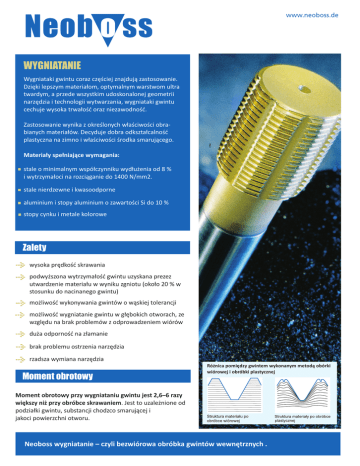 www.neoboss.de WYGNIATANIE Wygniataki gwintu coraz częściej znajdują zastosowanie. Dzięki lepszym materiałom, optymalnym warstwom ultra twardym, a przede wszystkim udoskonalonej geometrii narzędzia i technologii wytwarzania, wygniataki gwintu cechuje wysoka trwałość oraz niezawodność. Zastosowanie wynika z określonych właściwości obrabianych materiałów. Decyduje dobra odkształcalność plastyczna na zimno i właściwości środka smarującego. ł Materiały spełniające wymagania: stale o minimalnym współczynniku wydłużenia od 8 % i wytrzymałoci na rozciąganie do 1400 N/mm2. stale nierdzewne i kwasoodporne aluminium i stopy aluminium o zawartości Si do 10 % stopy cynku i metale kolorowe Zalety wysoka prędkość skrawania podwyższona wytrzymałość gwintu uzyskana prezez utwardzenie materiału w wyniku zgniotu (około 20 % w stosunku do nacinanego gwintu) możliwość wykonywania gwintów o wąskiej tolerancji możliwość wygniatanie gwintu w głębokich otworach, ze względu na brak problemów z odprowadzeniem wiórów duża odporność na złamanie brak problemu ostrzenia narzędzia rzadsza wymiana narzędzia Moment obrotowy Różnica pomiędzy gwintem wykonanym metodą obórki wiórowej i obróbki plastycznej Moment obrotowy przy wygniataniu gwintu jest 2,6–6 razy większy niż przy obróbce skrawaniem. Jest to uzależnione od podziałki gwintu, substancji chodzco smarującej i jakoci powierzchni otworu. Neoboss wygniatanie – czyli bezwiórowa obróbka gwintów wewnętrznych . ´ Srednica otworu Srednica otworu jest decydującym parametrem w procesie wygniatanie gwintu. Tolerancja wykonania średnicy otworu w przypadku wygniatania gwintu jest mniejsza ni w dla otworów wykonywanych metodą skrawania. Tolerancje są określone w normie DIN 13, część 50. Możliwość wykonywania gwintów o podziace do 3 mm. Głębokość wykonywanych gwintów uzależniona jest wymiarami wygniataka gwintu i właściwościami środka smarującego. Prędkość skrawania Prędkość skrawania przy obróbce gwintów w stali dla wygniataka pokrywanego warstwą ultra twardą powinna wynosić vc = 20–30 m/min. W przypadaku aluminium i stopów miedzi, zalecamy prędkość skrawania vc = 30–40 m/min. Program produkcji Dostarczane narzędzia są dostarczane w wersji wg DIN 371 i DIN 376. HSSE DIN 371 Materiał obrabiany Stal < 800 N/mm2 Stal < 800 N/mm2 Stal < 800 N/mm2 Alu Si Numer katalogowy 4060/80 4061/80 4063/80 4064 Wielkość nakroju Forma C Forma C Forma D Forma C Pokrycie warstwą TiN TiN TiN CrN Tolerancja 6HX 6GX 6HX 6HX PM DIN 371 Materiał obrabiany Stal Stal Stal Stal Stal 2 2 <1200N/mm2 <1200N/mm <1200N/mm2 <1200N/mm2 <1200N/mm Numer katalogowy 4065/80 4066/80 4076/80 Wielkość nakroju Forma E Forma E Forma C Forma C Forma F Pokrycie warstwą TiN TiN TiN TiN TiN Tolerancja 6HX 6GX 6HX 6GX 6HX 4077/80 4067/80 PM DIN 371 Materiał obrabiany VA-Stal VA-Stal VA-Stal VA-Stal Numer katalogowy 4072/81 4073/81 4069/81 4070/81 Wielkość nakroju Forma E Forma E Forma C Forma C Pokrycie warstwą TiCN TiCN TiCN TiCN Tolerancja 6HX 6GX 6HX 6GX Neoboss GmbH · Im Brühl 12 · D-72406 Bisingen · Od 1998 w Polsce : Jakob BOSS Polska Sp. z o.o. · Tel./Fax (22) 625 46 44 · [email protected] arc0111