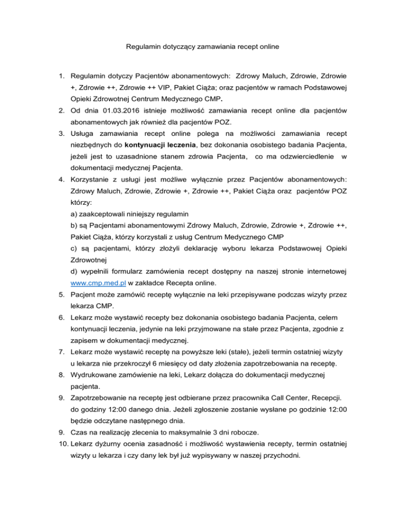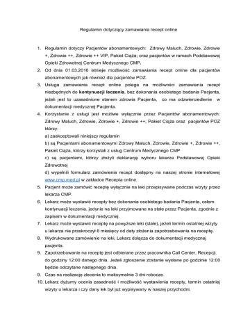 Regulamin dotyczący zamawiania recept online 1. Regulamin dotyczy Pacjentów abonamentowych: Zdrowy Maluch, Zdrowie, Zdrowie +, Zdrowie ++, Zdrowie ++ VIP, Pakiet Ciąża; oraz pacjentów w ramach Podstawowej Opieki Zdrowotnej Centrum Medycznego CMP. 2. Od dnia 01.03.2016 istnieje możliwość zamawiania recept online dla pacjentów abonamentowych jak również dla pacjentów POZ. 3. Usługa zamawiania recept online polega na możliwości zamawiania recept niezbędnych do kontynuacji leczenia, bez dokonania osobistego badania Pacjenta, jeżeli jest to uzasadnione stanem zdrowia Pacjenta, co ma odzwierciedlenie w dokumentacji medycznej Pacjenta. 4. Korzystanie z usługi jest możliwe wyłącznie przez Pacjentów abonamentowych: Zdrowy Maluch, Zdrowie, Zdrowie +, Zdrowie ++, Pakiet Ciąża oraz pacjentów POZ którzy: a) zaakceptowali niniejszy regulamin b) są Pacjentami abonamentowymi Zdrowy Maluch, Zdrowie, Zdrowie +, Zdrowie ++, Pakiet Ciąża, którzy korzystali z usług Centrum Medycznego CMP c) są pacjentami, którzy złożyli deklarację wyboru lekarza Podstawowej Opieki Zdrowotnej d) wypełnili formularz zamówienia recept dostępny na naszej stronie internetowej www.cmp.med.pl w zakładce Recepta online. 5. Pacjent może zamówić receptę wyłącznie na leki przepisywane podczas wizyty przez lekarza CMP. 6. Lekarz może wystawić recepty bez dokonania osobistego badania Pacjenta, celem kontynuacji leczenia, jedynie na leki przyjmowane na stałe przez Pacjenta, zgodnie z zapisem w dokumentacji medycznej. 7. Lekarz może wystawić receptę na powyższe leki (stałe), jeżeli termin ostatniej wizyty u lekarza nie przekroczył 6 miesięcy od daty złożenia zapotrzebowania na receptę. 8. Wydrukowane zamówienie na leki, Lekarz dołącza do dokumentacji medycznej pacjenta. 9. Zapotrzebowanie na receptę jest odbierane przez pracownika Call Center, Recepcji. do godziny 12:00 danego dnia. Jeżeli zgłoszenie zostanie wysłane po godzinie 12:00 będzie odczytane następnego dnia. 9. Czas na realizację zlecenia to maksymalnie 3 dni robocze. 10. Lekarz dyżurny ocenia zasadność i możliwość wystawienia recepty, termin ostatniej wizyty u lekarza i czy dany lek był już wypisywany w naszej przychodni. 11. W przypadku odmowy wypisania recepty lekarz uzasadnia swoją odmowę np. brak wcześniej wypisywanego leku, brak w ostatnich 6 miesiącach wizyty u lekarza, lek psychotropowy, który powinien być wypisywany w obecności pacjenta; czy lek w przypadku, którego (np. antykoncepcja) wskazane jest każdorazowe badanie u lekarza. 12. Pacjent odbiera receptę osobiście bezpośrednio w rejestracji CMP i kwituje odbiór w rejestrze wydawanych recept po okazaniu dokumentu tożsamości lub możliwy jest odbiór przez osobę upoważnioną do odbioru recepty, która również przedstawia swój dokument tożsamości i kwituje podpisem odbiór recepty. 13. Recepta będzie uwzględniała refundację, jeżeli w dniu wypisywania recepty pacjent zostanie pozytywnie zweryfikowany w systemie eWuś. 14. W przypadku odmowy telefonicznie bądź mailowo. wypisania recepty Pacjent zostanie poinformowany