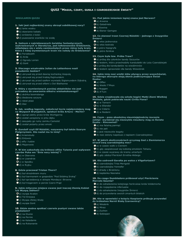 QUIZ "MAGIA, CZARY, GUSŁA I CZARODZIEJSKIE ŚWIATY" REGULAMIN QUIZU 11. Pod jakim imieniem lepiej znana jest Nerwen? a) Arwena 1. Jaki jest najbardziej znany obrzęd sobótkowej nocy? b) Galadriela a) lanie wosku c) Eowina b) stawianie kabały d) Elanor Gamgee c) wróżenie z kości d) puszczanie wianków na wodę 2. Jednym z najciekawszych światów fantastycznych, wykreowanych w literaturze, jest tolkienowskie Śródziemie, składające się z wielu zamieszkałych przez różne ludy krain. Która z niżej wymienionych krain nie należy do Śródziemia? 12. Co stanowi trzon Czarnej Różdżki - jednego z Insygniów Śmierci a) włos jednorożca b) włos testrala c) pióro hipogryfa d) pióro feniksa a) Forodwaith b) Arda 13. Czym była tzw. Próba Traw? c) Ogrody Lorien a) próbą dla członków bandy Szczurów d) Gont b) testem, który przechodziły kandydatki do Loży Czarodziejek c) próbą dla kandydatów na wiedźminów 3. Dlaczego wicehrabia Julian de Lettenhove nosił pseudonim Jaskier? a) ukrywał się przed dawną kochanką Vespulą b) ukrywał się przed hrabią Rajmundem c) ukrywał się przed szefem wywiadu Sigismundem Dijkstrą d) ukrywał się przed elfami z Dol Blathanna 4. Który z wymienionych poniżej składników nie jest potrzebny do uwarzenia eliksiru wieloskokowego? d) testem sprawności dla bandy Wiewiórek 14. Jakie imię nosi wielki żółw płynący przez wszechświat, na którego skorupie stoją słonie podtrzymujące Świat Dysku: a) Offler b) Wielki T'Phon c) Nuggan d) A'Tuin a) skórka boomslanga b) śledziona szczura c) rdest ptasi d) ślaz 5. Jak, według legendy, zakończył życie najsłynniejszy mag na Wyspach Brytyjskich, opiekun króla Artura - Merlin? 15. Gdzie znajdowała się szkoła bogini Matki Ziemi Wielkiej Melitele, gdzie pobierała nauki Cirilla Fiona? a) w Temerii b) w Ellander c) w Cidaris d) w Redanii a) zginął zabity przez króla Wortigerna b) został uwięziony w pniu dębu c) zasypały go ruiny zamku Camelot d) został pożarty przez smoki 6. Gandalf czyli Elf Różdżki, nazywany był także Szarym Pielgrzymem. Kto nadał mu to imię? a) krasnoludy b) Entowie c) elfy i ludzie d) Majorowie 7. W kim zakochała się królowa elfów Tytania pod wpływem czarów Puka we "Śnie nocy letniej"? a) w Oberonie b) w Lizandrze c) w Spodku d) w Ryjku 8. Gdzie pracował Tristan Thorn? a) był strażnikiem muru b) był barmanem w gospodzie "Pod Siódmą Sroką" c) był sprzedawcą w sklepie Mondaya i Browna d) był tragarzem w porcie Czarci Prąd 9. Jakie mityczne miejsce zwane jest inaczej Ziemią Kobiet lub Wyspą Jabłoni? a) wyspa Avalon b) Tol Eressea c) Wyspa Złotej Wody d) wyspa Gont 10. Gdzie można spotkać czerwie pustyni zwane także piaskalami? a) na Diunie b) na Pernie c) na Kaladanie d) na Rokananie 16. Czym - poza absolutną nieumiejętnością rzucania zaklęć- wyróżniał się niezwykle nieudany mag ze Świata Dysku - Rincewind? a) ma fatalną pamięć b) nie pali c) jest niezwykle bogaty d) nosi zielony kapelusz z napisem Czarodziejstwo 17. W jakich okolicznościach arcymag Ged z Ziemiomorza stracił swą czarodziejską moc? a) w czasie walki z Cieniem b) gdy zaopiekował się kobietą-smokiem Tehanu c) w czasie wyprawy do krainy umarłych d) gdy zdobył Pierścień Erretha-Akbego 18. Kto uzdrowił Geralta po walce z Vilgefortzem? a) czarodziejka Triss Merigold b) czarodziejka Yennefer c) driady z Brokilonu d) kapłanka Neeneke 19. Do czego Dumbledore próbował użyć Pierścienia Marvolo Gaunta? a) do odnalezienia kolejnego horkruksa lorda Voldemorta b) do rozpędzenia inferiusów c) do odnalezienia Insygniów Śmierci d) do przywołania swoich zmarłych bliskich 20. Kto w opowieści o księciu Kaspianie próbuje przywołać do królestwa Narnii Białą Czarownicę? a) Nikabrik b) Miraz c) Zuchon d) Sobiepan