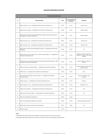 BADANIA MIKROBIOLOGICZNE PRACOWNIA MIKROBIOLOGII Lp. NAZWA BADANIA CENA CZAS OCZEKIWANIA NA WYNIK MATERIAŁ 1 Badanie wymazu z nosa - z antybiogramem dla bakterii chorobotwórczych 45,00 1-2 dni materiał z nosa 2 Badanie wymazu z gardła - z antybiogramem dla bakterii chorobotwórczych 45,00 1-2 dni materiał z gardła 3 Badanie wymazu z gardła w kierunku Streptococcus pyogenes (paciorkowca grupy A) - z antybiogramem dla wyniku dodatniego 40,00 2-3 dni materiał z gardła 4 Badanie wymazu z oka - z antybiogramem dla bakterii chorobotwórczych 65,00 2-4 dni materiał z oka 5 Badanie wymazu z ucha - z antybiogramem dla bakterii chorobotwórczych 65,00 2-4 dni materiał z ucha 6 Badanie kału w kierunku Salmonella/Shigella (3-krotne) - z antybiogramem dla wyniku dodatniego 65,00 3-4 dni kał 7 Badanie wymazu z kanału szyjki macicy, z pochwy lub spod napletka - z antybiogramem dla bakterii chorobotwórczych 45,00 1-3 dni wydzielina z kanału szyjki macicy, wydzielina z pochwy, materiał spod napletka 8 Badanie w kierunku nosicielstwa Streptococcus agalactiae (paciorkowca grupy B - GBS) - z antybiogramem dla wyniku dodatniego 55,00 2-4 dni materiał z odbytu + wydzielina z pochwy 9 Badanie w kierunku nosicielstwa MRSA - z antybiogramem dla wyniku dodatniego 40,00 1-2 dni materiał z gardła, materiał z nosa, materiał ze skóry 10 Badanie moczu - z antybiogramem dla bakterii chorobotwórczych 45,00 1-3 dni mocz 11 Badanie nasienia lub wymazu z cewki moczowej - z antybiogramem dla bakterii chorobotwórczych 65,00 2-4 dni nasienie, wydzielina z cewki moczowej 12 Badanie plwociny - z antybiogramem dla bakterii chorobotwórczych 45,00 1-2 dni plwocina 13 Badanie wymazu z rany - z antybiogramem dla bakterii chorobotwórczych 65,00 2-4 dni wydzielina z rany 14 Badanie krwi (1 butelka) - z antybiogramem dla bakterii chorobotwórczych 60,00 5-7 dni krew 15 Badanie kału w kierunku Candida - z antymykogramem dla wyniku dodatniego 55,00 2-4 dni kał 16 Wykonanie dodatkowego antybiogramu 20,00 1 doba - 17 Kontrola mikrobiologiczna (badanie czystościowe) 45,00 2-3 dni materiał z badanej powierzchni 18 Badanie kału w kierunku rotawirusów i adenowirusów 35,00 1 doba kał 19 Pobranie wymazu 3,00 - - Uwagi: 1) W przypadku gdy usługa medyczna służy profilaktyce i poprawie zdrowia w/w ceny są cenami brutto. 2) W przypadku gdy usługa medyczna służy do celów orzeczniczych do w/w cen należy doliczyć 23% podatek VAT. Cennik Usług Głogowskiego Szpitala Powiatowego spółka z o.o. na rok 2014
