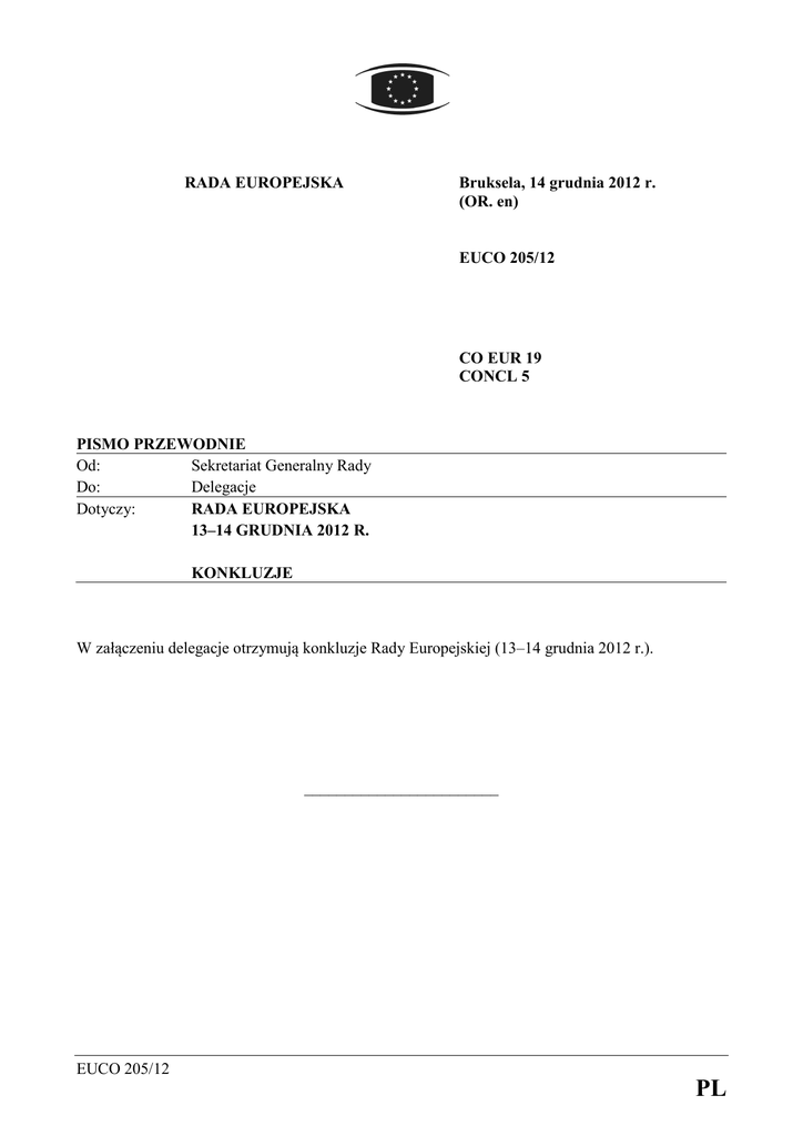 RADA EUROPEJSKA Bruksela, 14 grudnia 2012 r. (OR. en) EUCO 205/12 CO EUR 19 CO%CL 5 PISMO PRZEWOD%IE Od: Sekretariat Generalny Rady Do: Delegacje Dotyczy: RADA EUROPEJSKA 13–14 GRUD%IA 2012 R. KO%KLUZJE W załączeniu delegacje otrzymują konkluzje Rady Europejskiej (13–14 grudnia 2012 r.). ________________________ EUCO 205/12 PL Konkluzje –13–14 grudnia 2012 r. Rada Europejska uzgodniła plan działania na rzecz ukończenia tworzenia unii gospodarczej i walutowej, w oparciu o pogłębioną integrację i większą solidarność. Początkowym etapem tego procesu będzie ukończenie, skonsolidowanie i wdrożenie nowego wzmocnionego zarządzania gospodarczego, a także przyjęcie jednolitego mechanizmu nadzorczego i nowych przepisów w sprawie naprawy oraz restrukturyzacji i uporządkowanej likwidacji, a także w sprawie gwarantowania depozytów. Proces ten zostanie uzupełniony poprzez utworzenie jednolitego mechanizmu restrukturyzacji i uporządkowanej likwidacji. ,a posiedzeniu Rady Europejskiej w czerwcu 2013 r. zostanie dokładniej przeanalizowanych kilka innych istotnych kwestii dotyczących koordynacji reform krajowych, społecznego wymiaru UGW, wykonalności i warunków wzajemnie uzgodnionych umów na rzecz konkurencyjności i wzrostu gospodarczego oraz mechanizmów solidarności, a także środków służących propagowaniu pogłębienia jednolitego rynku i ochronie jego integralności. ,a wszystkich etapach tego procesu zapewniona będzie demokratyczna legitymacja i rozliczalność. W oparciu o przygotowaną przez Komisję roczną analizę wzrostu gospodarczego Rada Europejska rozpoczęła prace nad europejskim semestrem 2013. Postanowiła rozpocząć działania służące dalszemu rozwijaniu wspólnej polityki bezpieczeństwa i obrony UE i powróci do tego zagadnienia w grudniu 2013 r. I. POLITYKA GOSPODARCZA Plan działania na rzecz ukończenia tworzenia UGW 1. Fundamentalne wyzwania, przed którymi stoi dziś unia gospodarcza i walutowa, powodują, że należy ją wzmocnić, aby zapewnić dobrobyt gospodarczy i społeczny, a także stabilność i trwałą dobrą koniunkturę. Polityki gospodarcze muszą być w pełni ukierunkowane na promowanie silnego i trwałego wzrostu gospodarczego sprzyjającego włączeniu społecznemu, zagwarantowanie dyscypliny fiskalnej, zwiększanie konkurencyjności i stymulowanie zatrudnienia, w szczególności zatrudnienia młodzieży, tak by Europa pozostała wysoce konkurencyjną społeczną gospodarką rynkową i by utrzymany został europejski model społeczny. 2. Konsolidacja UGW polega nie tylko na ukończeniu tworzenia jej struktury, ale również na prowadzeniu zróżnicowanych i rozważnych polityk fiskalnych sprzyjających wzrostowi. Możliwości, jakie w zakresie równoważenia potrzeb dotyczących efektywnych inwestycji publicznych z celami dyscypliny fiskalnej oferują istniejące unijne ramy fiskalne, mogą być wykorzystywane w ramach funkcji zapobiegawczej paktu stabilności i wzrostu, przy pełnym poszanowaniu tego paktu. EUCO 205/12 1 PL Konkluzje –13–14 grudnia 2012 r. 3. W następstwie przedstawionego w październiku 2012 r. sprawozdania okresowego przewodniczący Rady Europejskiej sporządził – w ścisłej współpracy z przewodniczącym Komisji, prezesem Europejskiego Banku Centralnego i przewodniczącym Eurogrupy – konkretny harmonogram działań prowadzących do urzeczywistnienia prawdziwej unii gospodarczej i walutowej. Rada Europejska odnotowuje przedstawiony przez Komisję plan działania na rzecz UGW, w którym zawarto kompleksową analizę odnośnych zagadnień oraz ocenę ich aspektów prawnych. Odnotowuje również wkład Parlamentu Europejskiego. Rada Europejska określa kolejne kroki na drodze do ukończenia tworzenia UGW, w oparciu o pogłębioną integrację i większą solidarność państw członkowskich strefy euro. 4. Proces ukończenia tworzenia UGW będzie się opierał na ramach instytucjonalnych i prawnych UE. Będzie charakteryzował się otwartością i przejrzystością względem państw członkowskich, które nie używają jednej waluty. Na wszystkich etapach proces ten cechować będzie pełne poszanowanie integralności jednolitego rynku, w tym w poszczególnych wnioskach ustawodawczych, które zostaną przedstawione. Istotne jest również, by zapewnić równe szanse tym państwom członkowskim, które uczestniczą w jednolitym mechanizmie nadzorczym, i tym, które w nim nie uczestniczą. 5. Najpilniejszym priorytetem jest ukończenie prac nad ramami na rzecz wzmocnionego zarządzania gospodarczego i wdrożenie tych ram, które obejmują: „sześciopak”, traktat o stabilności, koordynacji i zarządzaniu oraz „dwupak”. W związku ze znacznymi postępami, jakie poczyniono w odniesieniu do głównych elementów „dwupaku”, Rada Europejska wzywa do jego szybkiego przyjęcia przez współprawodawców. 6. Równie pilna jest potrzeba poczynienia postępów w kierunku bardziej zintegrowanych ram finansowych, które pomogą przywrócić normalne kredytowanie, zwiększyć konkurencyjność i ułatwić wprowadzenie niezbędnych korekt w naszych gospodarkach. EUCO 205/12 2 PL Konkluzje –13–14 grudnia 2012 r. 7. Jednolity mechanizm nadzorczy stanowi istotny krok jakościowy w kierunku bardziej zintegrowanych ram finansowych. Rada Europejska z zadowoleniem przyjmuje porozumienie wypracowane przez Radę w dniu 13 grudnia i wzywa współprawodawców do szybkiego osiągnięcia porozumienia, tak by mechanizm ten mógł zostać wdrożony możliwie najszybciej. Ponownie podkreśla również znaczenie nowych przepisów – stanowiących najwyższy priorytet w kontekście opracowania jednolitego zbioru przepisów – dotyczących wymogów kapitałowych dla banków (rozporządzenie w sprawie wymogów kapitałowych i dyrektywa w sprawie wymogów kapitałowych) oraz wzywa wszystkie strony do wypracowania porozumienia w sprawie tych przepisów i ich szybkiego przyjęcia. 8. Rada Europejska wzy