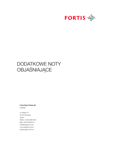 !" #!$ ! !%& ' '( % ) *+ , !/ ) *+ , - . . 0%( 1 ( " 0 2!%/ 3 4 $ $ $ ( " 0 2!%/ 3 4 %( 0%0! , + -5 +* Fortis Bank Polska SA Dodatkowe Noty Obja niaj ce SAB_P2006 1. Informacje z zakresu struktury koncentracji zaanga owania banku w poszczególne jednostki, grupy kapitałowe, segmenty rynku bran owe i geograficzne, wraz z ocen ryzyka zwi zanego z tym zaanga owaniem. 1.1. Informacje z zakresu zaanga owania Banku w poszczególne bran e przedstawia poni sza tabela. Dane nie zawieraj nale no ci od banków, odsetek oraz korekty warto ci z tytułu efektywnego rozliczania prowizji: Podział bran owy Nale no ci brutto 30.06.2006 r. tys. PLN Nale no ci brutto 30.06.2005 r. tys. PLN Osoby prywatne 1 342 838 520 126 Handel hurtowy 890 994 709 046 Pozostała produkcja 436 501 214 239 Produkcja ywno ci i napojów 248 156 154 672 Produkcja wyrobów metalowych 210 386 161 420 Usługi komunalne i mieszkaniowe 204 534 157 744 Drewno i wyroby drewniane 187 598 124 638 Usługi budowlane 179 266 266 025 Po rednictwo handlowe 115 334 4 314 Handel detaliczny artykułami przemysłowymi 105 111 88 264 Hotele i motele 104 157 49 509 Niebankowe usługi finansowe 98 751 42 009 Handel detaliczny artykułami ywno ciowymi 98 458 97 219 Papier i wyroby papiernicze 90 747 37 880 Usługi w zakresie u yteczno ci publicznej 88 951 27 027 Wyroby gumowe i plastikowe 78 983 42 966 Transport l dowy 78 735 65 834 Ceramika i szkło 67 957 35 921 Produkcja tekstyliów i tkanin 62 656 65 537 Pojazdy mechaniczne 56 723 42 500 Drukarnie i wydawnictwa 56 507 50 542 Produkty elektryczne 53 606 49 151 Meble i dodatki 49 879 33 404 Handel rodkami transportu 39 754 35 730 Usługi w zakresie nauki i techniki 39 459 36 156 Działalno 38 913 17 086 Wyroby z w gla i ropy naftowej 34 381 33 591 Pozostałe wyroby chemiczne 31 901 37 520 Inne usługi 657 767 591 453 Pozostałe bran e 104 640 48 832 5 853 643 3 840 355 developerska Razem 1.2. Dane o zaanga owaniu Banku z uwzgl dnieniem głównych regionów geograficznych kraju przedstawia poni sza tabela. Dane nie zawieraj odsetek, nale no ci od banków oraz korekty warto ci z tytułu efektywnego rozliczania prowizji. 2 Fortis Bank Polska SA Dodatkowe Noty Obja niaj ce SAB_P2006 Nale no ci brutto 30.06.2006 r. tys. PLN Nale no ci brutto 30.06.2005 r. tys. PLN Region Wschodni 2 465 499 1 825 984 Region Małopolski 1 091 803 602 473 Region Zachodni 834 293 506 935 Region l ski 798 968 491 126 Regiony geograficzne kraju Region Północny Razem 663 080 413 837 5 853 643 3 840 355 Dla celów tego zestawienia w skład Regionu Małopolskiego wchodz nast puj ce województwa: małopolskie, podkarpackie, wi tokrzyskie; w skład Regionu l skiego wchodz nast puj ce województwa: l skie, opolskie; w skład Regionu Wschodniego wchodz warmi sko-mazurskie, podlaskie; w skład Regionu Zachodniego wchodz dolno l skie, lubuskie; nast puj ce województwa: mazowieckie, lubelskie, łódzkie, nast puj ce województwa: wielkopolskie, zachodnio-pomorskie, w skład Regionu Północnego wchodz nast puj ce województwa: pomorskie, kujawsko-pomorskie. 1.3. Dane z zakresu koncentracji zaanga owania Banku w poszczególne sektory gospodarki przedstawia poni sza tabela. Dane nie zawieraj odsetek oraz korekty warto ci z tytułu efektywnego rozliczania prowizji. Nale no ci brutto 30.06.2006 r. tys. PLN Nale no ci brutto 30.06.2005 r. tys. PLN 100 591 42 397 29 64 -pozostałe instytucje po rednictwa finansowego 97 676 40 827 -pomocnicze instytucje finansowe 2 638 1 339 248 167 5 752 536 3 797 353 29 323 31 070 4 061 064 3 010 774 304 844 226 635 1 339 402 511 493 832 848 -instytucje niekomercyjne działaj ce na rzecz gospodarstw domowych 6 925 3 077 -rozrachunki z tytułu rozlicze kart VISA i pozostałe 10 146 13 456 Sektor bud etowy 516 605 - bud ety terenowe 516 598 Rodzaj podmiotu Sektor finansowy -instytucje ubezpieczeniowe i fundusze emerytalne -rozrachunki z tytułu rozlicze kart VISA i pozostałe Sektor niefinansowy -przedsi biorstwa i spółki pa stwowe -przedsi biorstwa i spółki prywatne oraz spółdzielnie -przedsi biorcy indywidualni -osoby prywatne -rolnicy indywidualni -rozrachunki z tytułu rozlicze kart VISA i pozostałe 7 Razem 5 853 643 3 840 355 W punktach 1.1, 1.2 oraz 1.3 zaprezentowano nale no ci od sektorów: finansowego, niefinansowego i bud etowego z wył czeniem operacji z bankami. 1.4. Dane z zakresu koncentracji zaanga owania Banku w poszczególne jednostki i grupy kapitałowe. Na 30 czerwca 2006 roku nie został przekroczony limit maksymalnego zaanga owania w stosunku do adnego klienta lub grupy kapitałowej okre lony w ustawie Prawo Bankowe. W stosunku do 13 klientów/grup 3 Fortis Bank Polska SA Dodatkowe Noty Obja niaj ce SAB_P2006 kapitałowych zaanga owanie Banku przekraczało 10% funduszy własnych i wyniosło ł cznie 1 249 mln PLN. Porównywalnie na 30.06.2005 r. zaanga owanie Banku w stosunku do 18 klientów/grup kapitałowych przekraczało 10% funduszy własnych i wynosiło ł cznie 1 355 mln PLN. Zaanga owanie Banku przekroczyło 10% funduszy własnych (branych do wyliczenia współczynnika wypłacalno ci), w stosunku do 10 grup kapitałowych i 3 pojedynczych podmiotów i wyniosło ł cznie 1 144 mln PLN. Wysoko zaanga owania oraz bran e poszczególnych grup zaprezentowano w poni szej tabeli: nr grupa/podmiot Zaanga owanie ł czne Banku w tys. PLN bran a 30.06.2006 r. 30.06.2005 r. grupa kapitałowa A Usługi w zakresie budownictwa mieszkaniowego 135 461 58 182 2 grupa kapitałowa B Produkcja ywno ci i napojów 105 155 88 208 3 grupa kapitałowa C Usługi finansowe 105 132 89 630 4 grupa kapitałowa D Produkcja tekstyliów i tkanin 103 197 100 981 5 klient indywidualny E Po rednictwo handlowe 82 351 103 667 6 klient indywidualny F Usługi komunalne i mieszkaniowe 81 327 84 893 grupa kapitałowa G Wyroby drewniane i usługi w zakresie u yteczno ci publicznej 81 246 33 018 8 grupa kapitałowa H Handel hurtowy 80 639 93 270 9 grupa kapitałowa I Produkcja wyrobów drewnianych 77 843 62 376 10 