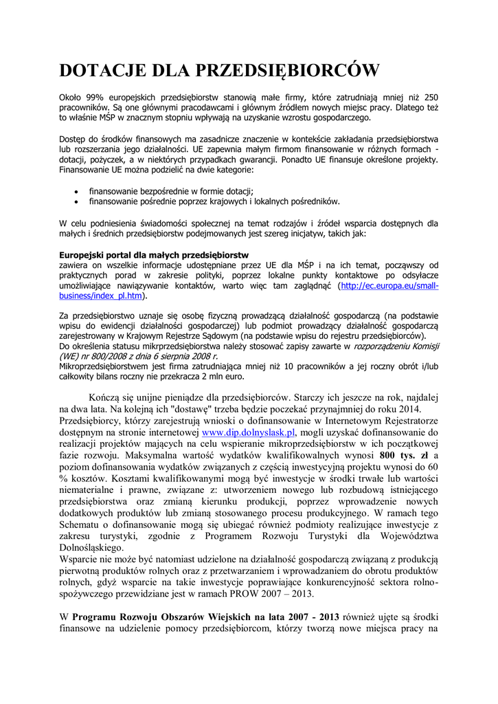 DOTACJE DLA PRZEDSIĘBIORCÓW Około 99% europejskich przedsiębiorstw stanowią małe firmy, które zatrudniają mniej niż 250 pracowników. Są one głównymi pracodawcami i głównym źródłem nowych miejsc pracy. Dlatego też to właśnie MŚP w znacznym stopniu wpływają na uzyskanie wzrostu gospodarczego. Dostęp do środków finansowych ma zasadnicze znaczenie w kontekście zakładania przedsiębiorstwa lub rozszerzania jego działalności. UE zapewnia małym firmom finansowanie w różnych formach dotacji, pożyczek, a w niektórych przypadkach gwarancji. Ponadto UE finansuje określone projekty. Finansowanie UE można podzielić na dwie kategorie: finansowanie bezpośrednie w formie dotacji; finansowanie pośrednie poprzez krajowych i lokalnych pośredników. W celu podniesienia świadomości społecznej na temat rodzajów i źródeł wsparcia dostępnych dla małych i średnich przedsiębiorstw podejmowanych jest szereg inicjatyw, takich jak: Europejski portal dla małych przedsiębiorstw zawiera on wszelkie informacje udostępniane przez UE dla MŚP i na ich temat, począwszy od praktycznych porad w zakresie polityki, poprzez lokalne punkty kontaktowe po odsyłacze umożliwiające nawiązywanie kontaktów, warto więc tam zaglądnąć (http://ec.europa.eu/smallbusiness/index_pl.htm). Za przedsiębiorstwo uznaje się osobę fizyczną prowadzącą działalność gospodarczą (na podstawie wpisu do ewidencji działalności gospodarczej) lub podmiot prowadzący działalność gospodarczą zarejestrowany w Krajowym Rejestrze Sądowym (na podstawie wpisu do rejestru przedsiębiorców). Do określenia statusu mikrprzedsiębiorstwa należy stosować zapisy zawarte w rozporządzeniu Komisji (WE) nr 800/2008 z dnia 6 sierpnia 2008 r. Mikroprzedsiębiorstwem jest firma zatrudniająca mniej niż 10 pracowników a jej roczny obrót i/lub całkowity bilans roczny nie przekracza 2 mln euro. Kończą się unijne pieniądze dla przedsiębiorców. Starczy ich jeszcze na rok, najdalej na dwa lata. Na kolejną ich "dostawę" trzeba będzie poczekać przynajmniej do roku 2014. Przedsiębiorcy, którzy zarejestrują wnioski o dofinansowanie w Internetowym Rejestratorze dostępnym na stronie internetowej www.dip.dolnyslask.pl, mogli uzyskać dofinansowanie do realizacji projektów mających na celu wspieranie mikroprzedsiębiorstw w ich początkowej fazie rozwoju. Maksymalna wartość wydatków kwalifikowalnych wynosi 800 tys. zł a poziom dofinansowania wydatków związanych z częścią inwestycyjną projektu wynosi do 60 % kosztów. Kosztami kwalifikowanymi mogą być inwestycje w środki trwałe lub wartości niematerialne i prawne, związane z: utworzeniem nowego lub rozbudową istniejącego przedsiębiorstwa oraz zmianą kierunku produkcji, poprzez wprowadzenie nowych dodatkowych produktów lub zmianą stosowanego procesu produkcyjnego . W ramach tego Schematu o dofinansowanie mogą się ubiegać również podmioty realizujące inwestycje z zakresu turystyki, zgodnie z Programem Rozwoju Turystyki dla Województwa Dolnośląskiego. Wsparcie nie może być natomiast udzielone na działalność gospodarczą związaną z produkcją pierwotną produktów rolnych oraz z przetwarzaniem i wprowadzaniem do obrotu produktów rolnych, gdyż wsparcie na takie inwestycje poprawiające konkurencyjność sektora rolnospożywczego przewidziane jest w ramach PROW 2007 – 2013. W Programu Rozwoju Obszarów Wiejskich na lata 2007 - 2013 również ujęte są środki finansowe na udzielenie pomocy przedsiębiorcom, którzy tworzą nowe miejsca pracy na obszarach wiejskich. W ramach działania „Tworzenie i rozwój mikroprzedsiębiorstw” dofinansowanie mogą otrzymać osoby, które nie są ubezpieczone w KRUS i prowadzą działalność jako mikroprzedsiębiorstwa. Siedziba/oddział a w przypadku osób fizycznych i wspólników spółek cywilnych, adres zamieszkania oraz lokalizacja inwestycji realizowana jest w miejscowościach do 5 tys. mieszkańców (wyjątkiem jest świadczenie usług dla rolnictwa i leśnictwa do 20 tys. mieszkańców). Wnioski mogą dotyczyć następujących branż: usługi dla gospodarstw rolnych lub leśnictwa, usługi dla ludności, sprzedaż hurtowa i detaliczna, rzemiosło lub rękodzielnictwo, roboty i usługi budowlane oraz instalacyjne, usługi turystyczne oraz związane ze sportem, rekreacją i wypoczynkiem, usługi transportowe, usługi komunalne, przetwórstwo produktów rolnych lub jadalnych produktów leśnych, magazynowanie lub przechowywanie towarów, wytwarzanie produktów energetycznych z biomasy, rachunkowość, doradztwo lub usługi informatyczne. Kosztem inwestycyjnym, na który można uzyskać dofinansowanie może być: budowa, przebudowa lub remont połączony z modernizacją niemieszkalnych obiektów budowlanych oraz nadbudowa, przebudowa lub remontu połączony z modernizacją istniejących budynków mieszkalnych wraz z zakupem instalacji technicznej oraz koszty rozbiórki i utylizacji materiałów szkodliwych pochodzących z rozbiórki, zagospodarowanie terenu, zakup maszyn, urządzeń, narzędzi, wyposażenia i sprzętu, zakup sprzętu komputerowego i oprogramowania służącego wsparciu podejmowanej lub rozwijanej działalności nierolniczej, zakup środków transportu, z wyłączeniem zakupu samochodów osobowych przeznaczonych do przewozu mniej niż 8 osób (łącznie z kierowcą). Warunkiem uzyskania dofinansowania jest utworzenie przynajmniej 1 miejsca pracy (w przeliczeniu na pełny etat). Liczba utworzonych w wyniku realizacji inwestycji miejsc pracy ma wpływ na limit wysokości dofinansowania i wynosi odpowiednio od 100 do 300 tys. zł. Dofinansowanie wypłacane jest jako refundacja poniesionych kosztów do wysokości 50% kosztów kwalifikowanych. Istnieje możliwość wystąpienia do ARiMR o zaliczkę na realizację operacji, która może być wypłacona 30 dni po podpisaniu umowy o dofinansowanie projektu. Minimalnie wysokość kosztów kwalifikowany