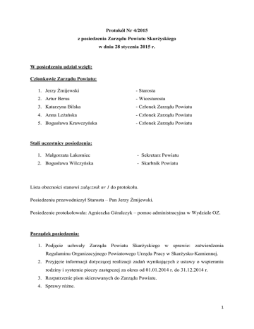 Protokół Nr 4/2015 z posiedzenia Zarządu Powiatu Skarżyskiego w dniu 28 stycznia 2015 r. W posiedzeniu udział wzięli: Członkowie Zarządu Powiatu: 1. Jerzy Żmijewski - Starosta 2. Artur Berus - Wicestarosta 3. Katarzyna Bilska - Członek Zarządu Powiatu 4. Anna Leżańska - Członek Zarządu Powiatu 5. Bogusława Krawczyńska - Członek Zarządu Powiatu Stali uczestnicy posiedzenia: 1. Małgorzata Łakomiec - Sekretarz Powiatu 2. Bogusława Wilczyńska - Skarbnik Powiatu Lista obecności stanowi załącznik nr 1 do protokołu. Posiedzeniu przewodniczył Starosta – Pan Jerzy Żmijewski. Posiedzenie protokołowała: Agnieszka Góralczyk – pomoc administracyjna w Wydziale OZ. Porządek posiedzenia: 1. Podjęcie uchwały Zarządu Powiatu Skarżyskiego w sprawie: zatwierdzenia Regulaminu Organizacyjnego Powiatowego Urzędu Pracy w Skarżysku-Kamiennej. 2. Przyjęcie informacji dotyczącej realizacji zadań wynikających z ustawy o wspieraniu rodziny i systemie pieczy zastępczej za okres od 01.01.2014 r. do 31.12.2014 r. 3. Rozpatrzenie pism skierowanych do Zarządu Powiatu. 4. Sprawy różne. 1 Starosta – Pan Jerzy Żmijewski przedstawił proponowany porządek posiedzenia oraz zapytał o uwagi. Zarząd Powiatu do przedstawionego porządku nie wniósł uwag oraz przyjął go jednogłośnie. Streszczenie posiedzenia: Ad. pkt 1. Podjęcie uchwały Zarządu Powiatu Skarżyskiego w sprawie: zatwierdzenia Regulaminu Organizacyjnego Powiatowego Urzędu Pracy w Skarżysku-Kamiennej. (załącznik nr 2) Z uchwałą w powyższej sprawie zapoznała zebranych Sekretarz – Pani Małgorzata Łakomiec. Wyjaśniła, że konieczność wprowadzenia zmian wynika z potrzeby dostosowania struktury organizacyjnej Powiatowego Urzędu Pracy do wykonywanych przez PUP nowych zadań związanych z nowelizacją ustawy o promocji zatrudnienia i instytucjach rynku pracy oraz wynikającym z tego tytułu zwiększeniem obowiązków pracowników. Zmiany podyktowane są również zmianą ustawy o ochronie danych osobowych. Zarząd Powiatu jednogłośnie podjął uchwałę w powyższej sprawie. Ad. pkt 2. Przyjęcie informacji dotyczącej realizacji zadań wynikających z ustawy o wspieraniu rodziny i systemie pieczy zastępczej za okres od 01.01.2014 r. do 31.12.2014 r. (załącznik nr 3) Przedmiotowe sprawozdanie przedstawił Wicestarosta – Pan Artur Berus. Członek Zarządu Powiatu – Pani Katarzyna Bilska poprosiła o szczegółową informację na temat dzieci przebywających w Zespole Placówek Opieki, Wychowania i Interwencji Kryzysowej „Przystań” oraz ilości dzieci z powiatu skarżyskiego przebywających poza jego terenem (stan na dzień 31.12.2014 r. z podaniem daty przyjęcia oraz daty skierowania). Zarząd Powiatu przyjął przedmiotowe sprawozdanie. 2 Ad. pkt 3. Rozpatrzenie pism skierowanych do Zarządu Powiatu. Członek Zarządu Powiatu – Pani Katarzyna Bilska przedstawiła zebranym pismo Dyrektora Zespołu Szkół Transportowo-Mechatronicznych (załącznik nr 4) zawierające prośbę o wyrażenie zgody na użyczenie auli szkolnej w dniu 22 marca br. w godzinach dopołudniowych w celu zorganizowania turnieju tańca „I Mistrzostwa RESPECT DANCE”. Następnie wyjaśniła, że mistrzostwa zostaną zorganizowane dla dzieci trenujących w szkole tańca „RESPEKT” oraz uczniów ZSTM. Zarząd Powiatu wyraził zgodę na prośbę Dyrektora Zespołu Szkół TransportowoMechatronicznych. Członek Zarządu Powiatu – Pani Katarzyna Bilska zapoznała zebranych z pismem Prezesa Oddziału Związku Nauczycielstwa Polskiego oraz Przewodniczącej Międzyzakładowej Komisji NSZZ „Solidarność” (załącznik nr 5) zawierającym prośbę o podpisanie porozumienia dotyczącego partycypowania w kosztach funkcjonowania obu związków w budynku „Domu Nauczyciela” przy ul. Słowackiego 40. Zarząd Powiatu nie wyraził zgody na partycypowanie w kosztach funkcjonowania w/w związków. Jednocześnie podkreślono, że istnieje możliwość udostępnienia pomieszczenia. Starosta – Pan Jerzy Żmijewski przedstawił ofertę telewizji DAMI Skarżysko (załącznik nr 6) dotyczącą wznowienia współpracy polegającej na realizacji informatora samorządowego powiatu pt. „Skarżyski Powiat z widokiem nie tylko na góry”. Koszt pakietu, który zawiera: Emisję w TV Dami Informatora Samorządowego, czas do 10 minut, emisja premierowa + powtórka (2 dni, 20 odtworzeń) + emisja w portalu www.tvskarzysko.pl (stały baner dedykowany) wynosi 1 500 zł. netto / 1 odcinek w miesiącu (11 miesięcy). 3 Zarząd Powiatu uznał ofertę TV Dami za korzystną oraz postanowił zawrzeć stosowną umowę. Środki na ten cel zostaną przekazane z dz. 750 rozdz. 75075 § 4300. Starosta – Pan Jerzy Żmijewski przedstawił pismo mieszkańca SkarżyskaKamiennej (załącznik nr 7) zawierające propozycję organizacji przez Starostwo Powiatowe oraz Urząd Miasta, okolicznościowej konferencji historycznej na temat operacji WHISKEY w której poległ skarżyszczanin – kapitan pilot Ryszard Zygmuntowicz. Ze swojej strony wnioskodawca oferuje udostępnienie do druku okolicznościowej broszurki z opracowaniem biograficznym Zygmuntowicza oraz osobiste poprowadzenie konferencji połączonej z emisją filmu nakręconego przez zaproszonego do udziału w konferencji dr Michaela Heima – dziennikarza oraz historyka z Monachium, zajmującego się od lat zbieraniem materiałów nt. operajcji WHISKEY. Starosta dodał, że wnioskodawca zasugerował również sfinansowanie przylotu oraz pobytu dr Heima, a całkowity koszt organizacji tego przedsięwzięcia określił kwotą ok. 12 tys. zł. W związku z powyższym Starosta zaproponował, aby pracownik Starostwa Powiatowego odbył spotkanie z przedstawicielem Urzędu Miasta w celu przedyskutowania możliwości organizacji konferencji, a następnie przedstawił konkretną informację dla Zarządu. Zarząd Powiatu przychylił się do propozycji Starosty. Członek Zarządu Powiatu – Pani Ka