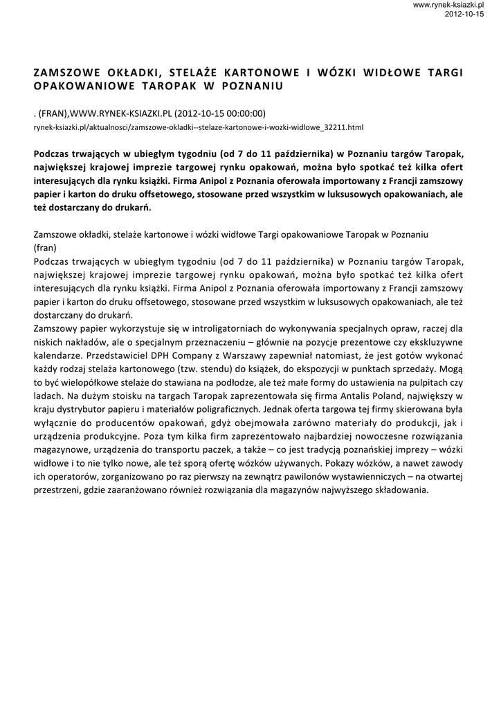 www.rynek-ksiazki.pl 2012-10-15 ZAMSZOWE OKŁADKI, STELAŻE KARTONOWE I WÓZKI WIDŁOWE TARGI OPAKOWANIOWE TAROPAK W POZNANIU . (FRAN),WWW.RYNEK-KSIAZKI.PL (2012-10-15 00:00:00) rynek-ksiazki.pl/aktualnosci/zamszowe-okladki--stelaze-kartonowe-i-wozki-widlowe_32211.html Podczas trwających w ubiegłym tygodniu (od 7 do 11 października) w Poznaniu targów Taropak, największej krajowej imprezie targowej rynku opakowań, można było spotkać też kilka ofert interesujących dla rynku książki. Firma Anipol z Poznania oferowała importowany z Francji zamszowy papier i karton do druku offsetowego, stosowane przed wszystkim w luksusowych opakowaniach, ale też dostarczany do drukarń. Zamszowe okładki, stelaże kartonowe i wózki widłowe Targi opakowaniowe Taropak w Poznaniu (fran) Podczas trwających w ubiegłym tygodniu (od 7 do 11 października) w Poznaniu targów Taropak, największej krajowej imprezie targowej rynku opakowań, można było spotkać też kilka ofert interesujących dla rynku książki. Firma Anipol z Poznania oferowała importowany z Francji zamszowy papier i karton do druku offsetowego, stosowane przed wszystkim w luksusowych opakowaniach, ale też dostarczany do drukarń. Zamszowy papier wykorzystuje się w introligatorniach do wykonywania specjalnych opraw, raczej dla niskich nakładów, ale o specjalnym przeznaczeniu – głównie na pozycje prezentowe czy ekskluzywne kalendarze. Przedstawiciel DPH Company z Warszawy zapewniał natomiast, że jest gotów wykonać każdy rodzaj stelaża kartonowego (tzw. stendu) do książek, do ekspozycji w punktach sprzedaży. Mogą to być wielopółkowe stelaże do stawiana na podłodze, ale też małe formy do ustawienia na pulpitach czy ladach. Na dużym stoisku na targach Taropak zaprezentowała się firma Antalis Poland, największy w kraju dystrybutor papieru i materiałów poligraficznych. Jednak oferta targowa tej firmy skierowana była wyłącznie do producentów opakowań, gdyż obejmowała zarówno materiały do produkcji, jak i urządzenia produkcyjne. Poza tym kilka firm zaprezentowało najbardziej nowoczesne rozwiązania magazynowe, urządzenia do transportu paczek, a także – co jest tradycją poznańskiej imprezy – wózki widłowe i to nie tylko nowe, ale też sporą ofertę wózków używanych. Pokazy wózków, a nawet zawody ich operatorów, zorganizowano po raz pierwszy na zewnątrz pawilonów wystawienniczych – na otwartej przestrzeni, gdzie zaaranżowano również rozwiązania dla magazynów najwyższego składowania.