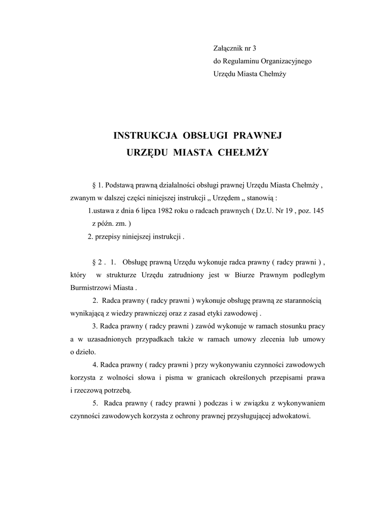 Załącznik nr 3 do Regulaminu Organizacyjnego Urzędu Miasta ChełmŜy INSTRUKCJA OBSŁUGI PRAWNEJ URZĘDU MIASTA CHEŁMśY § 1. Podstawą prawną działalności obsługi prawnej Urzędu Miasta ChełmŜy , zwanym w dalszej części niniejszej instrukcji „ Urzędem „ stanowią : 1.ustawa z dnia 6 lipca 1982 roku o radcach prawnych ( Dz.U. Nr 19 , poz. 145 z późn. zm. ) 2. przepisy niniejszej instrukcji . § 2 . 1. Obsługę prawną Urzędu wykonuje radca prawny ( radcy prawni ) , który w strukturze Urzędu zatrudniony jest w Biurze Prawnym podległym Burmistrzowi Miasta . 2. Radca prawny ( radcy prawni ) wykonuje obsługę prawną ze starannością wynikającą z wiedzy prawniczej oraz z zasad etyki zawodowej . 3. Radca prawny ( radcy prawni ) zawód wykonuje w ramach stosunku pracy a w uzasadnionych przypadkach takŜe w ramach umowy zlecenia lub umowy o dzieło. 4. Radca prawny ( radcy prawni ) przy wykonywaniu czynności zawodowych korzysta z wolności słowa i pisma w granicach określonych przepisami prawa i rzeczową potrzebą. 5. Radca prawny ( radcy prawni ) podczas i w związku z wykonywaniem czynności zawodowych korzysta z ochrony prawnej przysługującej adwokatowi. - 2 - § 3. Do zadań radcy prawnego ( radców prawnych ) naleŜy : 1) udzielanie opinii i porad prawnych : a) Burmistrzowi Miasta , b) Sekretarzowi Miasta , c) Skarbnikowi Miasta , d) Naczelnikom , e) Przewodniczącemu Rady Miejskiej , f) stronom , uczestnikom postępowania administracyjnego prowadzonego przez organy Gminy – Miasta ChełmŜa. 2) informowanie burmistrza o : a) zmianach w obowiązującym stanie prawnym w zakresie działalności Urzędu – na piśmie , w okresach dwutygodniowych , b)uchybieniach w działalności Urzędu w zakresie przestrzegania prawa i skutkach tych uchybień , 3) uczestniczenie w prowadzonych przez Urząd rokowaniach , których celem jest nawiązanie , zmiana lub rozwiązanie stosunku prawnego , w tym zwłaszcza zawarcia umowy długoterminowej lub nietypowej albo dotyczącej przedmiotu o znacznej wartości , 4) nadzór prawny nad egzekucją naleŜności Urzędu , 5) występowanie w charakterze pełnomocnika Urzędu w postępowaniu sądowym , administracyjnym oraz przed innymi organami orzekającymi , 6) opiniowanie pod względem prawnym projektów uchwał Rady Miejskiej , 7) inicjowanie i dokonywanie ocen skuteczności funkcjonowania prawa w Urzędzie oraz opracowywanie informacji i wniosków wynikających z tych ocen , 8) prowadzenie i aktualizacja rejestru prawa miejscowego , 9) prowadzenie szkolenia dla pracowników Urzędu z zakresu stosowania przepisów prawnych , 10) prowadzenie zbioru dzienników promulgacyjnych , periodyków , wydawnictw prawniczych , lektury fachowej ( zawodowej ) . - 3 - § 4. 1. Radca prawny ( radcy prawni ) wydaje opinie i udziela porad w sprawach nasuwających wątpliwości prawne na Ŝądanie osób wymienionych w części III pkt 1 niniejszej instrukcji . 2. Przy zwracaniu się o wydanie opinii prawnej lub porady prawnej naleŜy przestrzegać zasady : 1) zapytania winny być konkretne i zwięźle precyzować zagadnienia oraz zawierać ewentualne propozycje rozwiązania sprawy , 2) materiały sprawy winny być naleŜycie skompletowane oraz zawierać dane pozwalające na ustalenie terminu przedawnienia , 3) wnioski i skierowanie sprawy na drogę sporu winny być przekazane radcy prawnemu najpóźniej w terminie : - w sprawach , w których obowiązuje trzyletni termin przedawnienia dwóch miesięcy od daty wymagalności roszczenia , - w sprawach , w których obowiązuje krótszy niŜ trzyletni termin przedawnienia – jeden miesiąc od daty wymagalności roszczenia. 3. Skarbnik gminy obowiązany jest do przedstawienia radcy prawnemu : 1) wykazu sald naleŜności , w których istnieją wątpliwości co do zasadności i terminu przedawnienia roszczenia , 2) wezwań do zapłaty przychodzących i wychodzących z Urzędu celem podjęcia decyzji co do zasadności i formy terminowego załatwienia sprawy , 3) okresowego wykazu dłuŜników zalegających w spłacie naleŜności w celu podjęcia stosownych czynności w ramach nadzoru prawnego nad przebiegiem egzekucji, 4) sprawy przed odmową uznania Ŝądania lub doprowadzenia swoim działaniem do rozpoznania sprawy przez sąd lub inny organ orzekający. 4. Sprawy w postępowaniu sądowym o roszczenia finansowe wszczyna radca prawny na pisemny wniosek skarbnika gminy w oparciu o przedłoŜone mu dokumenty . 5.Radca prawny prowadzi repetorium spraw sądowych oraz zbiór akt podręcznych prowadzonych spraw. 6. Po zakończeniu sprawy sądowej i po uzyskaniu tytułu wykonalności ( klauzuli wykonalności ) , tytuł ten wraz z opinią radca prawny przekazuje skarbnikowi gminy do weryfikacji . W przypadku nieuzyskania zaspokojenia - 4 roszczenia , naleŜy sprawę ponownie przedłoŜyć radcy prawnemu , celem wdroŜenia postępowania egzekucyjnego . 7. Burmistrz przed podjęciem decyzji o zawiadomieniu organu powołanego do ścigania przestępstw , o stwierdzenie przestępstwa ściganego z urzędu – zasięga opinii radcy prawnego . 8. Burmistrz moŜe wydać polecenie załatwienia sprawy w sposób odmienny niŜ wynika to z opinii radcy prawnego – polecenie takie winno być wydane na piśmie. 9. Burmistrz podejmuje decyzje o skierowaniu sprawy na drogę sporu , po zaopiniowaniu przez radcę prawnego . § 5. 1. Przed podpisaniem umów nietypowych oraz przy opracowaniu wzorców typowych , konieczne jest zasięgnięcie opinii radcy prawnego . Radca prawny parafuje ich zgodność z obowiązującymi przepisami i stwierdza czy w naleŜny sposób zabezpieczone zostały interesy Urzędu . 2. Radcy prawnemu naleŜy przedkładać umowy wymienione w ust.1 po ich uprzednim parafowaniu przez naczelników Wydziałów i po stwierdzeniu przez nich gospodarczej celowości umowy. 3. Nie naleŜy przedkładać radcy prawnemu do opiniowania umów juŜ zawartych bądź wykonanych . 4. W przypadku zastrzeŜeń co do treści umowy