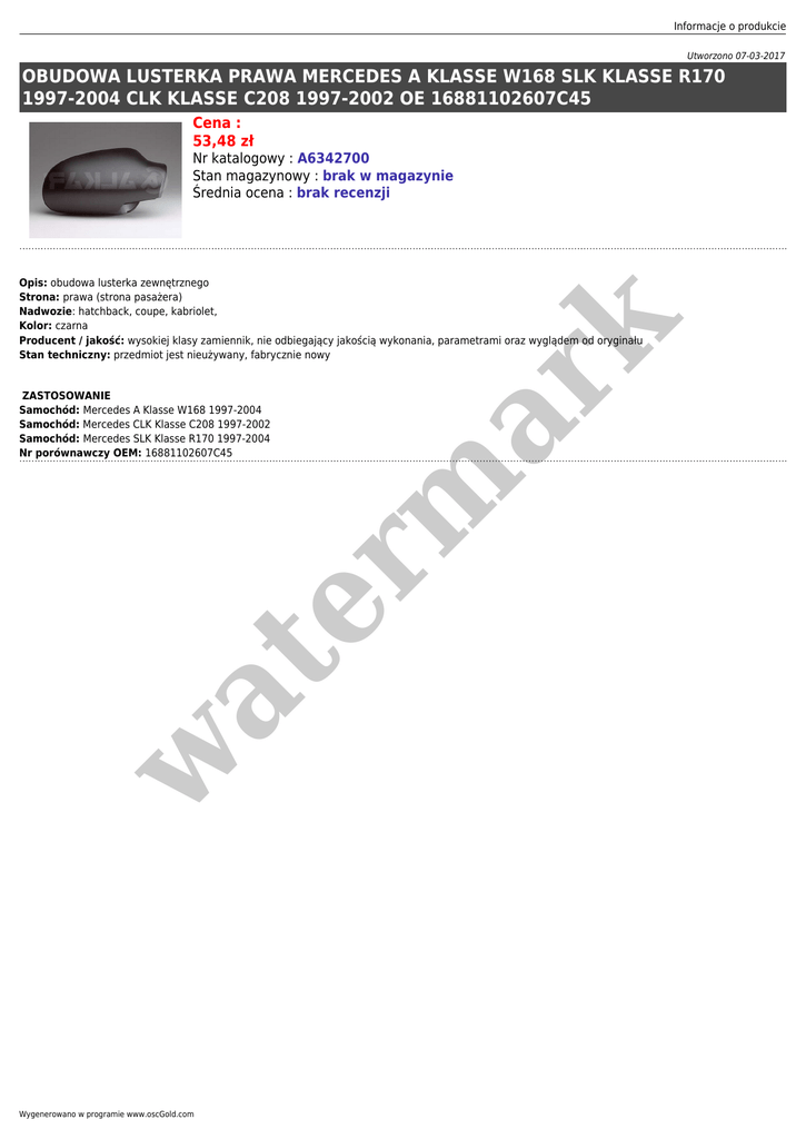 Informacje o produkcie Utworzono 07-03-2017 OBUDOWA LUSTERKA PRAWA MERCEDES A KLASSE W168 SLK KLASSE R170 1997-2004 CLK KLASSE C208 1997-2002 OE 16881102607C45 Cena : 53,48 zł Nr katalogowy : A6342700 Stan magazynowy : brak w magazynie Średnia ocena : brak recenzji er m ar k Opis: obudowa lusterka zewnętrznego Strona: prawa (strona pasażera) Nadwozie: hatchback, coupe, kabriolet, Kolor: czarna Producent / jakość: wysokiej klasy zamiennik, nie odbiegający jakością wykonania, parametrami oraz wyglądem od oryginału Stan techniczny: przedmiot jest nieużywany, fabrycznie nowy w at ZASTOSOWANIE Samochód: Mercedes A Klasse W168 1997-2004 Samochód: Mercedes CLK Klasse C208 1997-2002 Samochód: Mercedes SLK Klasse R170 1997-2004 Nr porównawczy OEM: 16881102607C45 Wygenerowano w programie www.oscGold.com