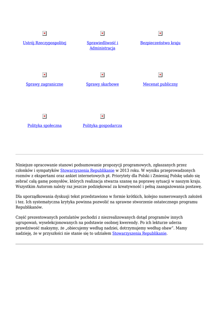 Ustrój Rzeczypospolitej Sprawiedliwość i Administracja Bezpieczeństwo kraju Sprawy zagraniczne Sprawy skarbowe Mecenat publiczny Polityka społeczna Polityka gospodarcza Niniejsze opracowanie stanowi podsumowanie propozycji programowych, zgłaszanych przez członków i sympatyków Stowarzyszenia Republikanie w 2013 roku. W wyniku przeprowadzonych rozmów z ekspertami oraz ankiet internetowych pt. Priorytety dla Polski i Zmieniaj Polskę udało się zebrać całą gamę pomysłów, których realizacja stwarza szansę na poprawę sytuacji w naszym kraju. Wszystkim Autorom należy raz jeszcze podziękować za kreatywność i pełną zaangażowania postawę. Dla uporządkowania dyskusji tekst przedstawiono w formie krótkich, kolejno numerowanych założeń i tez. Ich systematyczna krytyka powinna pozwolić na sprawne stworzenie ostatecznego programu Republikanów. Część prezentowanych postulatów pochodzi z niezrealizowanych dotąd programów innych ugrupowań, wyselekcjonowanych na podstawie osobnej kwerendy. Po ich lekturze uderza prawdziwość maksymy, że „obiecujemy według nadziei, dotrzymujemy według obaw”. Mamy nadzieję, że w przyszłości nie stanie się to udziałem Stowarzyszenia Republikanie.