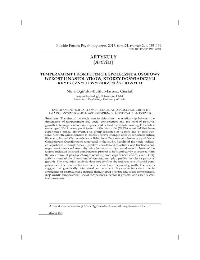 Polskie Forum Psychologiczne, 2016, tom 21, numer 2, s. 155-169 DZȱŗŖǯŗŚŜśŜȦŘŖŗŜŖŘŖŗ R [Articles] ȱȱȱRȱȱȱ ȱȱXǰȱXȱgȱ ȱSȱ ȱÚȬǰȱ£ȱï ¢ȱ¢ǰȱ ¢ȱR࣠Institute of Psychology, University of Lodz TEMPERAMENT, SOCIAL COMPETENCES AND PERSONAL GROWTH IN ADOLESCENTS WHO HAVE EXPERIENCED CRITICAL LIFE EVENTS Summaryǯȱ ȱ ȱ ȱ ȱ ¢ȱ ȱ ȱ ȱ ȱ ȱ ȱ ȱ dimensions of temperament and social competences and the level of personal ȱȱȱ ȱȱ¡ȱȱȱǯȱȱŗŗŖȱǰȱȱŗŜȬŗŝȱ¢ǰȱȱȱȱ¢ǰȱŞŜȱǻŝŞǯŘƖǼȱĴȱȱȱ ¡ȱȱȱǯȱȱȱȱȱŚŘȱ¢ȱȱŚŚȱǯȱȱ ȱ ȱ ȱ ȱ ȱ ȱ ȱ ¡ȱ ȱ life event, Formal Characteristics of Behavior – Temperament Inventory and Social Competences Questionnaire were used in the study. Results of the study indicatȱęȱȮȱȱ ȱȮȱȱȱȱ¢ȱȱȱȱ negative of emotional reactivity with the severity of personal growth. None of the ȱȱȱȱȱȱȱȱę¢ȱȱ ȱ ȱȱȱȱȱȱȱ¡ȱȱǯȱ¢ȱ activity – one of the dimensions of temperament play predictive role for personal ǯȱȱȱ¢ȱȱȱęȱȱȱȱȱȱȱȱȱȱ ȱȱȱȱ ǯȱȱȱ suggest that genetically determined temperament plays more important role in ȱȱĴȱȱǰȱȱȱȱǰȱȱǯ Key wordsDZȱǰȱȱǰȱȱ ǰȱǰȱical life events ȱȱDZȱȱÚȬǰȱȬǰȱÚȓǯ£ǯ strona 155 Wprowadzenie ¢¿ ȱ££Úȱ¢£¢ȱȱȱ¿ ¢¿ ȱ ¢£Úȱ ȱ £ȱ ¢£¢ȱ ȱ àÙ£¢ȱ ï ȱȱï°ȱ £ǯȱȱ¢Úȱ ¢£Ù¢ǰȱČȱŜŖǰŝƖȱ¿Č£¢£ȱ ȱśŗǰŘƖȱȱï £¢Ùȱ ȱ ȱČ¢ȱȱȱȱȱ ¢£ȱǻ£DZȱȬǰȱŘŖŖşǼǯȱȱÚȱ£ £¢ȱ££ȱȬȱǻŘŖŖşǼȱ ïàȱà ȱȱ £ ȱ£ȱ ¢Č£¢ȱ ¢ǰȱČȱŝśǰŜƖȱ¢ȱï £¢Ùȱȱȱȱ ¢£ȱȱ£ȱ¢£¢ǰȱ ȱŗŜǰśƖȱàȱ Ùȱ£¢ȱȱ ¿ȱȱ ¢£Úǯȱ¢ȱ£¿ïȱ Ù¢ȱ ȱ ȱ ïȱ ǰȱ £¢ȱ 棢£ȱ £ ȱ ȱ £Ú ǰȱ ¢ȱ£Č¢ȱČ¢ȱ£ȱ ȱȱȱ£à ǯȱ ȱ£¢ȱ¿Č£¢£ǰȱȱ¢£¢Ù¢ȱ£ȱȱ£¢ȱ£ǰȱ£¢ȱ棢£ȱ£ȱ ȱȱ£¢ȱ£à ǯȱ ¢£ȱ ȱ £ȱ ¢£¢ȱ ¢¿ȱ à Čȱ ïàȱ £ȱ ȱ Ù£Č¢ǯȱ ¢ȱ ȱ £¿ȱ ȱ ¿ȱ ęȱ £¿ ǰȱ ï £ȱ ¢à ȱ ¢¢ǰȱ ȱ ¢ȱ £ȱ ǰȱ àȱ ȱ £ȱ£¢£¢ȱ£Ù ǯȱ£ȱȱÙ£Čȱ£ȱà Čȱ£¢ȱȱ£ȱ 棢£¢ȱȱ¢£¢ȱ£ȱȱï ȱ¿Čȱàȱ ȱČ£¢ǰȱ ȱȱà ČȱȱïȱǻȱȱǯǰȱŘŖŖŞǼǯȱ£¿ ï°ȱ ¢¿ ȱ ¢£Úȱ ȱ £ȱ ¢£¢ȱ ïàȱ £ȱ ȱ Ù£Č¢ȱ ȱ ï°ȱ ¢ȱ ȱ ¿ȱ ȱŝŖǰŖƖȱǻ ǰȱŘŖŖŜǼǯȱȱÚȬȱǻŘŖŗŖǼȱ£ £ȱ ȱȱÙ£Č¢ȱ ȱ ȱŗŚȬŗŞȱȱ £Ù¢ǰȱČȱŝŘǰŖƖȱïàȱàȱ¢ȱ ï £¢Ùȱ ȱ ȱ Č¢ȱ ¢ ȱ ¢£ȱ Č¢ ǯȱ £¿ïȱ ¢Ùȱȱȱȱ¢ǰȱ¿ȱ£ Ùȱȱȱǰȱ ¢ȱ ȱ£ȱ£ȱ Čȱïȱę ǯ ¢£ȱȱ£ȱ¢£¢ȱȱ £°ȱȱ ¢¿ ȱ ¢ ¢ȱà ȱ ȱ£ȱ ȱ¢£ǯȱ Č£ȱ ȱ¢ȱï £Úȱȱ£àÙȱȱ£ ȱǻǼǯȱÙȱ Úȱȱ ¢¿ ȱ ïàȱȱ£ȱ¿ȱȱŗśǰŖȬŘśǰŖƖȱǻ ȱ ŘŖŖŘǼǯȱȱȱȱ£ ȱ¿ȱ ¿ǰȱČȱ£Č¢ȱȱČȱà Čȱ°ȱ£ȱȱ ¢ȱ£¢¢ ¢ȱ£ǰȱ ¢ȱ ȱȱ¢£Ȧ ȱ £ǯ ¢£¢ȱ £ȱ¢£¢ȱ ¢¿ ȱ£¢¢ ¢ȱ£ǰȱ ¢ȱ ¿ȱ ȱ £ȱ ȱ ¢ȱ ¢ȱ ££ȱ ȱ àȱ £ȱ ȱ £ȱ ¿ ȱ ¢£¢ȱ ¢£Úȱ ǻǰȱ ǰȱ ŗşşŜǰȱ ŘŖŖŚǰȱ ŘŖŖŝDzȱ ǯȱ Čȱ ÚȬȱ ŘŖŗřǼǯȱ ȱ ȱ £¢ïȱ ¿ȱ Čȱ ¢ȱ £¢ȱ à ȱȱï £ȱǯȱȱ ȱ ¢ȱàȱ£ȱȱ£ȱȱ ££ȱ ȱ£ȱ¿ǰȱ£¿ȱàȱȱ ¢Č£¢ȱČȱ£ȱ ȱ£ȱ ǰȱ ¢Č£ȱ£ȱȱȱ£ ¿£ȱï ï°ȱČ¢ ǯȱ à¢ȱ¿ȱ¢£ȱ £ȱ £ȱȱ ¢¿ ȱ£¢¢ ¢ȱ£ȱ ȱ£ȱDZȱ ȱȱǰȱ ȱȱ¢ȱ£ȱ ȱ£ȱ ȱę£ęȱČ¢ ȱǻǰȱǰȱŗşşŜǼǯ strona 156 £¢¢ ȱ£¢ȱ ȱȱȱ£ȱ¿ȱ ȱ££àïȱȱ£ȱȱ£ ¿£ȱȱȱ£ȱ ¢Č£ȱ£ȱ Ùȱ ïǰȱ£ïǰȱ£ ¿£ȱ£ȱȱȱ£ȱȱ Ù¢ȱČ ïȱ ȱ£¢ȱ£¢£Ù¢ȱ ¢£Úǯȱ¢ȱ ȱȱ¢ȱ£ ȱ¿ȱ ȱ£ ¿£ȱ Č ïȱȱȱ ȱȱȱ¢ǰȱȱČȱ£ïȱ ȱ £ȱ ¢ǯȱ ȱ ȱ £¢ȱ ȱ ę£ęȱ Č¢ ȱ £ ȱ ¿ȱ ȱ ¿£¢ȱȱČ¢ȱȱ£ ȱ ïǯ ȱ¢£ȱ £ȱ ȱȱà Čȱ ïàȱ£ȱ ȱ Ù£Č¢ǯȱ ȱ £ £ȱ ȱ ȱ à ȱ ȱ ȱ ȱ ȱ ȱ ¢ȱȱ£ȱŗŗȱ £ïȱŘŖŖŗȱȱ ¢£Ù¢ǰȱČȱřřǰŖƖȱ£ȱȱï £¢Ùȱ £¢¢ ¢ȱ£ȱ ȱ ¢ȱ£Č¢ȱȱ ¢£ȱǻȱȱǯǰȱŘŖŖśǼǯȱȱ ǰȱ ȱ ǰȱ ࣢ȱ ï £¢ȱ ¢ȱ £ £ȱ £ȱ ȱǰȱ £Ù¢ȱȱ ¢¿ ȱȱ£ȱȱśŖǰŖƖȱ£ȱǻȱȱǯǰȱ ŘŖŖşǼǯȱ ȱÚȱÚȬȱǻŘŖŗŖǼȱ£ £¢ȱ ïàȱà ǰȱ࣢ȱ ï £¢ȱ àČ¢ȱ ¢ ¢ȱ ¢£Úȱ Č¢ ¢ȱ ¢ǰȱ Čȱ ŘŘǰśƖȱ ¢ȱ Ùȱ ¢¿ ȱ £¢¢ ¢ȱ £ȱ ȱ ȱ ¢ȱ ǻȱ ŚŘǰŖƖȱ Ȯȱ ȱ ȱ řŜǰŖƖȱ Ȯȱ £¿¢Ǽǯȱ ¿£ȱ £¢ȱ ¢£¢Ù¢ȱ ¢ȱ ȱČ¢ǯȱČ¢ȱȱàȱ£ȱ ¢ȱ£ȱ £ȱ£¢ȱ ȱȱ£ȱȱÙ£Č¢ǰȱ࣢ȱ¢ȱęȱ ¢à ȱ ¢ȱǻŗşǰŚƖǼǯȱ ȱȱ ¢Č£¢ȱǻśŚǰŖƖǼȱ£ ȱ ïàȱà ǰȱ࣢ȱ£ȱ£ ȱ ȱ£ȱȱ££ȱ ȱȱ£ȱǻÚȬǰȱŘŖŗřǼǯ ȱȱȱÙ£ȱȱ ¢¿ ȱ£¢¢ ¢ȱ£ȱ ȱï £ȱ ¢¿ ȱ £¢¢ ¢ȱ £ȱ ȱ ¢ȱ ï £¢ȱ ££Úȱ ¢£¢ȱ £Č¢ȱ ȱ ȱ £¢à ǯȱ Úȱ ¢£ȱ £ȱ£ȱ¿ȱ£à ȱ ȱ£¢ȱ¢¢¢ǰȱȱȱ ¢ǯȱ ïàȱ¢ȱȱȱ¿ȱ£¢ȱ¿ȱ£¢ȱȬ ï ¢ǯȱ £ȱ ȱ Úȱ £ £ȱ ȱ ¢ȱ £ǰȱ ȱ ȱ ¿ȱ £ȱ ȱ ȱ £ȱ £ȱ ȱ ȱ £ȱ ¢ȱ ïǰȱ £¢ȱ ȱ£ȱȱȱȱǻ¢ǰȱǰȱŘŖŖŚDzȱ ǯȱ Čȱ ÚȬǰȱ ŘŖŗřǼǯȱ ȱ £ȱ £ ȱ ȱ £¢ȱ ǰȱïǰȱ ïȱȱ ïȱȱï £ǯȱȱȱ¢£ï°ȱ £Ùȱ¿ȱȱ£ȱ ¢¿ ȱ£¢¢ ¢ȱ£ȱ ¢¢ȱ£ȱï £ȱ¢ǯ ȱ ȱ £ȱ ǻŘŖŖśǼȱ £ ȱ ¿ȱ ȱ ££ȱ ȱ ȱ ¿ ȱ ï £ȱ ¢ȱ ȱ ïǰȱ Čȱ Čȱ ȱ ££°ȱ ȱ à ȱ ȱ £ ǯȱ ȱ £¢ȱ ȱ ǰȱ Čȱ ȱ ǰȱàȱȱ°ȱ£ȱ ȱ¿ȱ¢ȱ à ȱȱČ ï°ȱȱ ¢£¢Ùï°ǯȱȱȱ¢ ï°ȱȱȱ ¢ ï°ȱ£ȱ ¿ȱ£¢°ȱ£¢¢ ȱ¢à ȱǯ ȱ £¿ȱ¿ȱȱ ȱȱ ȱ¿ȱ£¢¢ ¢ȱ£ȱ¢£¢ȱČȱȱ£ïǯȱȱȱȱ£ £ȱ¢Ùȱ strona 157 £ ¢ȱ££ȱÚȬȱǻŘŖŗřǰȱŘŖŗŚǰȱǰȱŘŖŗśǼȱ ȱȱàǰȱàȱ£Ù¢ȱ ¢ȱ ȱ £ £ȱ £ȱ ïȱ ïȱ ǯȱ ȱ £ȱ £ £ȱ wymiarów temperamentu z ogólnym wynikiem Inwentarza Potraumatycznego £ ǰȱ ȱ £ ȱ ȱ £ £ȱ ¢£ȱ ££à¢ȱ £à ȱ £ȱȱǯȱ £ȱȱ £ȱ¢ ïȱȱ £ȱ£ȱ ȱȱȱȱȱČ ïȱ£ȱ ¢£¢Ùïȱ£ȱȱČ¢ǯȱ ¿£ȱ££ȱÙȱ¢ ï°ȱǰȱàȱ£Ùȱ ¿ȱ¢ȱ£¢¢ ¢ȱ