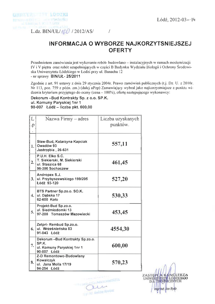 Lodz, 2012-03- -14 L.dz. BIN/UL/ijr,; l) 12012/ASI I INFORMACJA 0 WYBORZE NAJKORZYTSNIEJSZEJ OFERTY Przedmiotem zarnowienia jest wykonanie robot- budowlano - instalaeyjnych w ramaeh modernizacji IV i V pietra oraz robot uzupelniajacych w czesci B Budynku Wydzialu Biologii i Ochrony Srodowi ska Uniwersytetu L6dzkiego w Lodzi przy ul. Banacha 12 - nr sprawy BlNIUt.- 2512011 Zgodnie z art. 91 ustawy z dnia 29 stycznia 2004r. Prawo zamowien publicznych (t.j . Dz. U. z 20 1Or. Nr 11 3, paz. 759 z pozn. zm.) (dale] uPzp) Zamawiajacy wybral ja ko najkorzystniejsze z punktu wi dzen ia kryterium przyjetego do oeeny (cena - 100%), oferte nastepujacego wykonawcy : Dekorum -Bud Kontrakty Sp. Z 0.0. SP.K. ul. Komuny Paryskiej 1nr 1 90-007 t6dz - liczba pkt. 600,00 L .p Nazwa Finny adres Liczba uzyskanych punkt6w . Slaw-Bud, Katarzyna Kapciak Owad6w 93 1. Jastrzebla , 26-631 557,11 P.U.H. Elko S.C. 2. T. Siekierski , M. Siekierski 461,45 ul. Staszica 68 96-300 Sochaczew 3. Andropex S.J. u I. Przy byszews kieg a 199/205 t.6dz 93-120 527,20 4. BTS Partner Sp.zo.o. SO.K. ul. D~bska 17 62-600 Kala 530,33 Projekt-Bud Sp.zo.o. ul, Siedmiodomki 13 5. 97-200 Tomasz6w Mazowiecki 6. 7. 8. 453,45 Zetpri- Rembud Sp.zo.o. ul. Wrzesniefiska 83 91-043 t.6dz 4554,30 Dekorum -Bud Kontrakty Sp.zo.o. SP.K. ul. Komuny Paryskiej 1nr 1 90-007 t.6dz Z-D Remontowo-Budowlany Kowalczyk ul. JanaMolla17f19 94-254 t.6dz ( j~ ..-l. 600,00 570,23