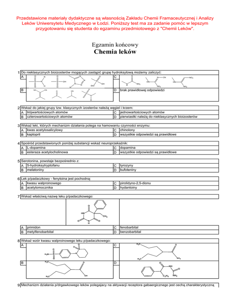 Przedstawione materiały dydaktyczne są własnością Zakładu Chemii Framaceutycznej i Analizy Leków Uniwersytetu Medycznego w Łodzi. Poniższy test ma za zadanie pomóc w lepszym przygotowaniu się studenta do egzaminu przedmiotowego z "Chemii Leków". Egzamin końcowy Chemia leków 1 Do nieklasycznych bioizosterów mogących zastąpić grupę hydroksylową możemy zaliczyć: A O S O R N S N N O B NC H O C O N OH O N N H EtO D CN CN NO2 HN OH N H O CN S P HN NH2 NH2 NH2 brak prawidłowej odpowiedzi S N S O R 2 Wskaż do jakiej grupy tzw. klasycznych izosterów należą węgiel i krzem: A B trójwartościowych atomów czterowartościowych atomów C D jednowartościowych atomów pierwiastki należą do nieklasycznych bioizosterów 3 Wskaż leki, których mechanizm działania polega na hamowaniu czynności enzymu: A B kwas acetylosalicylowy kaptopril C D chinolony wszystkie odpowiedzi są prawidłowe 4 Spośród przedstawionych poniżej substancji wskaż neuroprzekaźnik: A B L-dopamina esteraza acetylocholinowa C D dopamina wszystkie odpowiedzi są prawidłowe C D tyrozyny b f t i bufoteniny C D pirolidyno-2,5-dionu hydantoiny C D fenobarbital benzobarbital 5 Serotonina, powstaje bezpośrednio z: A B 5-hydroksytryptofanu melatoniny l t i 6 Lek p/padaczkowy - fenytoina jest pochodną: A B kwasu walproinowego acetylomocznika 7 Wskaż właściwą nazwę leku p/padaczkowego: O HN CH 3 O A B N H O primidon metylfenobarbital 8 Wskaż wzór kwasu walproinowego leku p/padaczkowego: A C O O S N O B H 3C O S O H 2N H 3C NH 2 H 3C D O O NH O H 3C OH C 2H 5 NH 2 9 Mechanizm działania p/drgawkowego leków polegajacy na aktywacji receptora gabaergicznego jest cechą charakterystyczną dla pochodnych: A B iminostilbenu sulfonamidowych C D kwasu barbiturowego hydantoiny C D 4 chinazolinonu 4-chinazolinonu kwasu barbiturowego 10 Zolpidem - lek nasenny należy do grupy pochodnych: A B brak prawidłowej odpowiedzi 1,4-benzodiazepiny 11 Gdy w strukturze alkoholu stosowanego w lekach nasennych wprowadzimy atom chlorowca oraz drugi podstawnik nienasycony to możemy spodziewać się: A B zwiększenia lipofilności wydłużenia czasu działania C D odpowiedzi A i D są prawidłowe skrócenia czasu działania 12 Anksjolityki (poch. benzodiazepiny), które są podstawione w pozycji N-1 w porównaniu do N-niepodstawionych wykazują: R 1 N O 2 3 N 4 Cl A B zwiększoną lipofilność zmniejszoną aktywność C D zmniejszoną lipofilność zwiększoną aktywność C D 1,4-benzodiazepiny triazolobenzodiazepiny 13 Klobazam (lek p/lękowy) należy do grupy pochodnych: A B 2,3-benzodiazepiny 1,5-benzodiazepiny 14 Wskaż właściwą nazwę dla przedstawionego poniżej anksjolityku: O H N OH N Cl A B diazepam p flurazepam C D oksazepam p temazepam 15 Modyfikacja układu 1,4-benzodiazepiny polegająca na dobudowaniu trzeciego pierścienia heterocyklicznego w pozycji 4,5 lub 1,2 miała na celu: A B C D uzyskanie preparatów o bardziej wybiórczym działaniu p/lękowym uzyskanie preparatów o bardziej wybiórczym działaniu p/padaczkowym brak właściwej odpowiedzi znalezieniu preparatów o bardziej wybiórczym działaniu nasennym 16 Neuroleptyk - loksapina należy do pochodnych: A B butyrofenonu tioksantenu C D dibenzepiny indolu 17 Wskaż właściwą nazwę dla przedstawionego poniżej neuroleptyku: CH 3 (H 2 C) 3 N CH 3 N S A B perazyna promazyna C D tioridazyna sulforidazyna 18 Wskaż właściwą nazwę dla przedstawionego poniżej neuroleptyku: OH CH 3 O N (CH 2 ) 3 F F A B bromperidol trifluperidol C D moperon haloperidol 19 Wskaż wzór neuroleptyku - zotepiny - która należy do pochodnych dibenzepiny: A N C CH 3 N CH 3 N N N N Cl Cl O S B D H 3C N O CH 3 N CH 3 N (CH 2 ) 2 N CH 3 Cl S S 20 Do działania neuroleptycznego optymalna odległość między zasadowym centrum łańcucha aminoalkilowego,od słabo zasadowego atomu azotu w układzie fenotiazyny wynosi: A B 2 atomy węgla 4 atomy węgla C D 3 atomy węgla 5 atomów węgla 21 Neuroleptyki pochodne butyrofenonu charakteryzują się miedzy innymi podstawnikiem w pozycji 4 układu aromatycznego warunkujący odpowiednią lipofilność cząsteczki, wskaż jaki to podstawnik: A B grupa metylowa grupa metoksylowa C D atom chloru atom fluoru Dl aktywności kt ś i neuroleptycznej l t j w pochodnych h d h fenotiazyny f ti bardziej b d i j uprzywilejowana il j jest j t konformacja k f j podstawników d t ikó 22 Dla aminoalkilowych w której: A B C D III-rzędowa grupa aminowa znajduje się bliżej pierścienia aromatycznego z podstawnikiem w położeniu 2 III-rzędowa grupa aminowa znajduje się bliżej pierścienia aromatycznego z podstawnikiem w położeniu 3 III-rzędowa grupa aminowa znajduje się bliżej pierścienia aromatycznego z podstawnikiem w położeniu 4 brak prawidłowej odpowiedzi y y podstawienie p p y j 2 tzw. ugrupowań g p ą y p j w pozycji elektronobiorących powoduje: 23 W układzie fenotiazyny R1 N S A B R2 2 5 spadek aktywności neuroleptycznej brak prawidłowej odpowiedzi C D nie wpływa na działanie leków wzrost aktywności neuroleptycznej 24 Wskaż właściwą nazwę dla przedstawionego poniżej leku p/depresyjnego: (CH 2 ) 3 N CH 3 N CH 3 Cl A B dezipramina klomipramina C D imipramina lofepramina 25 Wskaż właściwą nazwę dla przedstawionego poniżej leku p/depresyjnego: N N N N Cl N (CH 2 ) 3 O A fluoksetyna C trazodon B maprotylina D fenelzyna 26 Który z wymienionych leków p/depresyjnych należy do inhibitorów monoaminooksydazy: A B izokarboksazyd mianseryna C D opipramol doksepina 27 Występujące w trójpierścieniowych lekach przeciwdepresyjnych pierścienie karbocykliczne mają budowę: A B cykloheptadienu cykloheptatrienu C D dihydroantracenu wszystkie odpowiedzi są prawidłowe 28 Podstawienie atomu chloru w pozycji 3 w pierścieniu benzenowym w trójpierścieniowych lekach przeciwdepresyjnych może spowodować: A B nasilenie aktywności p/depresyjnej nasilenie aktywności neuroleptycznej C D nasilenie aktywności analeptycz