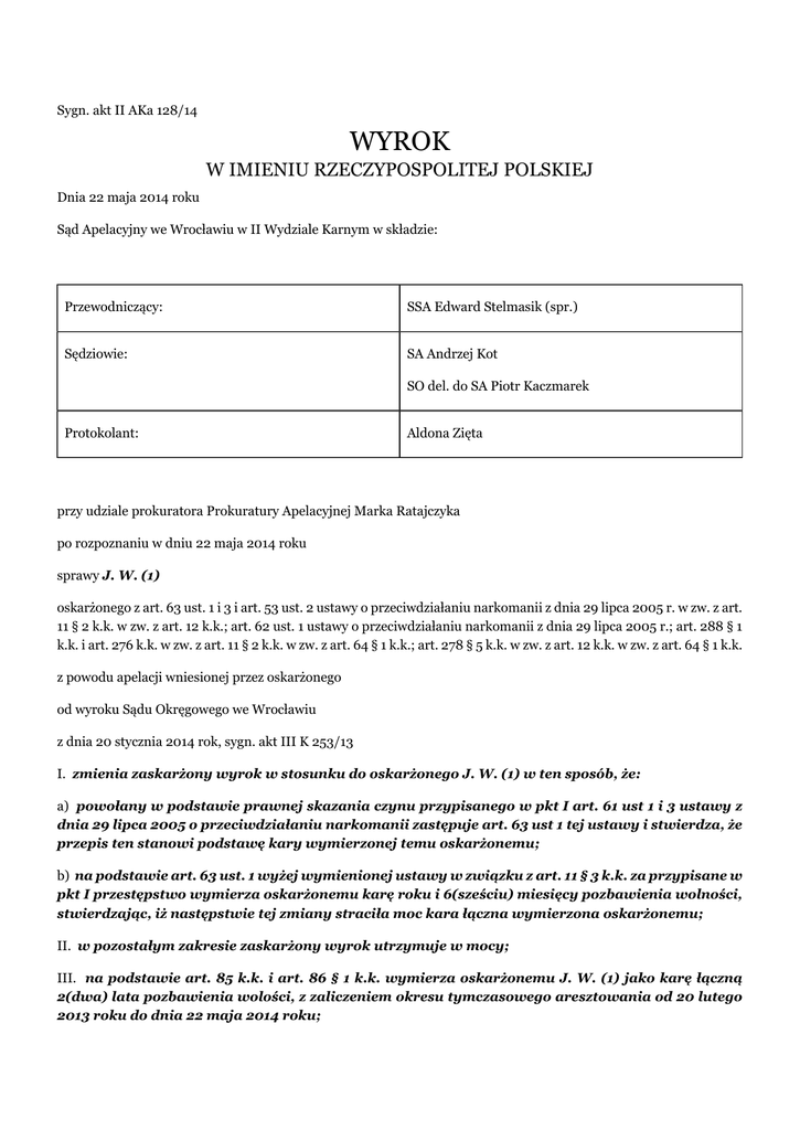 Sygn. akt II AKa 128/14 WYROK W IMIENIU RZECZYPOSPOLITEJ POLSKIEJ Dnia 22 maja 2014 roku Sąd Apelacyjny we Wrocławiu w II Wydziale Karnym w składzie: Przewodniczący: SSA Edward Stelmasik (spr.) Sędziowie: SA Andrzej Kot SO del. do SA Piotr Kaczmarek Protokolant: Aldona Zięta przy udziale prokuratora Prokuratury Apelacyjnej Marka Ratajczyka po rozpoznaniu w dniu 22 maja 2014 roku sprawy J. W. (1) oskarżonego z art. 63 ust. 1 i 3 i art. 53 ust. 2 ustawy o przeciwdziałaniu narkomanii z dnia 29 lipca 2005 r. w zw. z art. 11 § 2 k.k. w zw. z art. 12 k.k.; art. 62 ust. 1 ustawy o przeciwdziałaniu narkomanii z dnia 29 lipca 2005 r.; art. 288 § 1 k.k. i art. 276 k.k. w zw. z art. 11 § 2 k.k. w zw. z art. 64 § 1 k.k.; art. 278 § 5 k.k. w zw. z art. 12 k.k. w zw. z art. 64 § 1 k.k. z powodu apelacji wniesionej przez oskarżonego od wyroku Sądu Okręgowego we Wrocławiu z dnia 20 stycznia 2014 rok, sygn. akt III K 253/13 I. zmienia zaskarżony wyrok w stosunku do oskarżonego J. W. (1) w ten sposób, że: a) powołany w podstawie prawnej skazania czynu przypisanego w pkt I art. 61 ust 1 i 3 ustawy z dnia 29 lipca 2005 o przeciwdziałaniu narkomanii zastępuje art. 63 ust 1 tej ustawy i stwierdza, że przepis ten stanowi podstawę kary wymierzonej temu oskarżonemu; b) na podstawie art. 63 ust. 1 wyżej wymienionej ustawy w związku z art. 11 § 3 k.k. za przypisane w pkt I przestępstwo wymierza oskarżonemu karę roku i 6(sześciu) miesięcy pozbawienia wolności, stwierdzając, iż następstwie tej zmiany straciła moc kara łączna wymierzona oskarżonemu; II. w pozostałym zakresie zaskarżony wyrok utrzymuje w mocy; III. na podstawie art. 85 k.k. i art. 86 § 1 k.k. wymierza oskarżonemu J. W. (1) jako karę łączną 2(dwa) lata pozbawienia wolości, z zaliczeniem okresu tymczasowego aresztowania od 20 lutego 2013 roku do dnia 22 maja 2014 roku; IV. zwalnia oskarżonego J. W. (1) od ponoszenia kosztów sądowych za postępowanie odwoławcze, zaliczając je na rachunek Skarbu Państwa. UZASADNIENIE W sprawie III K 213/13 Sądu Okręgowego we Wrocławiu J. W. (1) został oskarżony o to, że: I. w okresie od września 2012 roku do 20 lutego 2013 roku, w miejscowości (...) pow. (...), działając w warunkach czynu ciągłego wbrew przepisom ustawy uprawiał konopie w ilości 93 sztuk sadzonek konopi oraz 81 sztuk dojrzałych krzewów konopi w celu ich dalszego przetworzenia i uzyskania środka odurzającego, przy czym uprawa ta mogła dostarczyć znaczne ilości konopi, tj. o czyn z art. 63 ust. 1 i 3 i art. 53 ust. 2 ustawy o przeciwdziałaniu narkomanii z dnia 29 lipca 2005 roku w zw. z art. 11 § 2 k.k. i w zw. z art. 12 k.k.; II. w dniu 20 lutego 2013 roku w miejscowości (...) pow. (...) wbrew przepisom ustawy posiadał środki odurzające w postaci 0, 32 grama ziela konopi innych niż włókniste, tj. o czyn z art. 62 ust. 1 ustawy o przeciwdziałaniu narkomanii z dnia 29 lipca 2005 roku; III. w nocy z 10/11 stycznia 2013 roku w miejscowości Ł. powiatu (...) dokonał zniszczenia poprzez spalenie nawigacji samochodowej telefonu komórkowego N. (...), pieczątki firmy (...) i plombownicy o wartości łącznej 610 zł. na szkodę fabryki (...) w G., a także dokonał zniszczenia dowodu osobistego, prawa jazdy i karty bankomatowej V. na szkodę P. K., przy czym zarzuconego czynu dokonał w warunkach powrotu do przestępstwa będąc uprzednio skazanym wyrokiem Sądu Rejonowego w Oleśnicy z dnia 21.05.2007 r. za czyny z art. 279 § 1 k.k.na karę łączną 2 lat i 6 miesięcy pozbawienia wolności, którą odbywał w okresie od 31.01.2007 r. do 21.05.2007 r. i od 19.10.2009 r. do 10.03.2011 r. tj. o czyn z art. 288 § 1 k.k. i art. 276 k.k. w zw. z art. 11 § 2 k.k. w zw. z art. 64 § 1 k.k. IV. w okresie od września 2012 roku do dnia 20 lutego 2013 roku w miejscowości (...) poz. (...), działając w warunkach czynu ciągłego dokonał kradzieży energii elektrycznej poprzez podłączenie dodatkowego przewodu zasilającego licznik, który poprzez dorabianą instancję odbiorczą zasilał urządzenia w postaci grzejników elektrycznych, dmuchaw i wentylatorów powodujące straty w wysokości 15 321, 37 zł. na szkodę (...) S.A. – Oddział we W., przy czym zarzuconego mu czynu dokonał w warunkach powrotu do przestępstwa będąc uprzednio skazanym wyrokiem Sądu Rejonowego w Oleśnicy z dnia 21.05.2007 r. za czyny z art. 279 § 1 k.k. na karę łączną 2 lat i 6 miesięcy pozbawienia wolności, którą odbywał w okresie od 31.01.2007 roku do 21.05.2007 r. i od 19.10.2009 r. do 10.03.2011 r. tj. o czyn z art. 278 § 5 k.k. w zw. z art. 12 k.k. w zw. z art. 64 § 1 k.k. Sąd Okręgowy we Wrocławiu, wyrokiem z dnia 20.01.2014 r.: 1) uznał osk. J. W. (1) w ramach zarzutów opisanych w p. I i II za winnego tego, że w okresie od września 2012 r. do 20 lutego 2013 r. w miejscowości N. pow. (...), działając w warunkach czynu ciągłego, wbrew przepisom ustawy uprawiał konopie w ilości 93 sztuk sadzonek konopi oraz 81 sztuk dojrzałych krzewów konopi, a następnie wbrew przepisom ustawy, poprzez rozdrabnianie i suszenie ziela konopi wytworzył środek odurzający w postaci marihuany o wadze nie mniejszej niż 0,32 stanowiącego występek z art. 63 ust. 1 i 3 ustawy o przeciwdziałaniu narkomanii i art. 53 ust. 1 tej Ustawy w zw. z art. 11 § 2 kk w zw. z art. 12 kk i za to na podstawie art. 63 ust. 3 ustawy o przeciwdziałaniu narkomanii w zw. z art. 11 § 3 kk wymierzył mu karę 3 lat pozbawienia wolności a na podstawie art. 70 ust. 1 w/w Ustawy orzekł przepadek dowodów rzeczowych z wykazu Nr 1/30/2013; 2) osk. J. W. (1) uznał za winnego czynów zarzuconych w p. III i IV i za to wymierzył mu: - za czyn zarzucony w p. III na podstawie art. 288 § 1 k.k. w zw. z art. 64 § 1 k.k. karę 8 miesięcy pozbawienia wolności oraz na podstawie art. 46 § 1 k.k. orzekł obowiązek naprawienia szkody przez zapłatę 610 zł. na rzecz R.M. (...), - za czyn opisany w p. IV n
