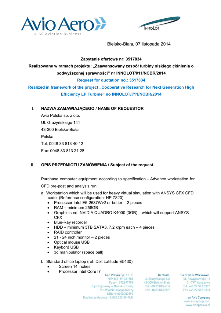 Bielsko-Biała, 07 listopada 2014 Zapytanie ofertowe nr: 3517834 Realizowane w ramach projektu: „Zaawansowany zespół turbiny niskiego ciśnienia o podwyższonej sprawności” nr INNOLOT/I/11/NCBR/2014 Request for quotation no.: 3517834 Realized in framework of the project „Cooperative Research for Next Generation High Efficiency LP Turbine” no INNOLOT/I/11/NCBR/2014 I. NAZWA ZAMAWIAJĄCEGO / NAME OF REQUESTOR Avio Polska sp. z o.o. Ul. Grażyńskiego 141 43-300 Bielsko-Biała Polska Tel: 0048 33 813 40 12 Fax: 0048 33 813 21 28 II. OPIS PRZEDMIOTU ZAMÓWIENIA / Subject of the request Purchase computer equipment according to specification - Advance workstation for CFD pre-post and analysis run: a. Workstation which will be used for heavy virtual simulation with ANSYS CFX CFD code. (Reference configuration: HP Z820) Processor Intel E5-2687Wv2 or better – 2 pieces RAM – minimum 256GB Graphic card: NVIDIA QUADRO K4000 (3GB) – which will support ANSYS CFX Blue-Ray recorder HDD – minimum 3TB SATA3, 7.2 krpm each – 4 pieces RAID controller 21 - 24 inch monitor – 2 pieces Optical mouse USB Keybord USB 3d manipulator (space ball) b. Standard office laptop (ref. Dell Latitude E5430) Screen 14 inches Processor Intel Core I7 III. RAM min. 4GB HDD 500GB TERMIN WYKONANIA OFERTY / TERM OF ACCOMPLISHEMENT Termin wykonania przedmiotu zamówienia: 30 dni od daty złożenie zamówienia Term of the accomplishment of the order: 30 days from the PO issue. IV. WARUNKI WYMAGANE OD WYKONAWCÓW / REQUIREMENTS FOR CONTARCTORS O udzielenie niniejszego zamówienia mogą ubiegać się wykonawcy, którzy: / The award of this contract may apply to contractors who: 1. Są uprawnieni do występowania w obrocie prawnym zgodnie z wymogami ustawowymi. / Are entitled to the prevalence in legal transactions in accordance with statutory requirements 2. Posiadają niezbędną wiedzę i doświadczenie, potencjał ekonomiczny i techniczny do wykonania zamówienia. / Have the necessary knowledge and experience, economic and technical capacity to perform the contract. 3. Nie podlegają wykluczeniu z postępowania. / Are not excluded from the proceedings. V. WYJAŚNIENIE ODNOŚNIE ZAPYTANIA OFERTOWEGO / EXPLENATIONS ON RFQ 1. Wykonawca może zwrócić się do Zamawiającego w formie elektronicznej o wyjasnienie treści zapytania ofertowego. Ze strony Zamawiającego uprawnionym do udzielania wyjaśnień jest Pan Krzysztof Marugi. Informacja zostanie udzielona w terminie 2 dni roboczych, z wyjątkiem sytuacji gdy prośba wpłynie do Zamawiającego na mniej niż 4 dni przed terminem otwarcia ofert lub pytanie Wykonawcy nie ma w ocenie Zamawiającego wpływu na treść oferty. / The Contractor may request in the electronic form the Employer for clarification about the request for quotation. Form the employer side person authorized to provide explanations is: Mr. Krzysztof Marugi. Information will be provided within 2 working days, expect when the request is received by the employer for less than four days before RFQ deadline or the question in the opinion of the Employer is not affecting content of the order. 2. Zamawiający jednocześnie przesyła treść wyjaśnienia wszystkim wykonawcom, którym doręczono zapytanie ofertowe, bez ujawniania źródła zapytania, a także umieszcza ją na stronie internetowej zamawiającego. / The Purchaser will disclose the explanation to all parties to whom RFQ have been send, without disclosing the source of the request. The explanation will also be placed on the Purchaser website. VI. SPOSÓB PRZYGOTOWANIA OFERTY / METHOD OF PREPARING THE OFFER 1. Oferty można złożyć poprzez przesłanie pocztą na adres Zamawiającego (z dopiskiem “INNOLOT do Pan Lech Popiołek”) lub pocztą elektroniczną na adres: [email protected] do dnia 14 listopada 2014. / Offers should by submitted by mail to the requestor address (with quote “INNOLOT to Mr. Lech Popiolek) or via e-mail: [email protected] until November 14th 2014. 2. Do oferty wykonawca dołączają następujące dokumenty pod rygorem wykluczenia z postępowania: / Following attachments shall be provided with the offer under pain of nullity: i. Oświadczenie o spełnieniu warunków wzięcia udziału w postępowaniu, o którym mówi pkt. IV niniejszego zapytania – wzór oświadczenia stanowi załącznik nr 1 do niniejszego zapytania. / Statement an fulfillment of requirements of attendance in the tender process, listed in point IV of this RFQ – the template of the statement is the amendment no 1 to this RFQ ii. Oświadczenie Wykonawcy o braku powiązań z Beneficjentem – wzór stanowi załącznik nr 2 do niniejszego zapytania. / Statement about lack of connections between contractor and beneficiary - the template of the statement is the amendment no 2 to this RFQ iii. Dokładną specyfikę techniczną zaproponowanego w ofercie rozwiązania, umożliwiającą weryfikację zgodności z wymogami stawianymi w niniejszym zapytaniu. / Detailed technical description of the proposed solution, enabling verification with the requirements specified in the RFQ. VII. KRYTERIA OCENY OFERT / ACCESSMENT CRITERIA 1. Cena / Price – 40% 2. Ocena techniczna zaproponowanego rozwiązania / Technical assessment of the proposed solutions – 30% 3. Termin realizacji zamówienia /order completion date – 20% 4. Dotychczasowe doświadczenie we współpracy z Wykonawcą / Previous experience of Avio Aero with the contractor – 10% VIII. TERMIN ZWIĄZANIA OFERTĄ. / DEADLINE FOR OFFER BOUND Wykonawcy będą związani swoją ofertą przez 30 dni, licząc od upływu terminu składania ofert. / Contractors will be bound wit he the offer for 30 days form the deadline of the offer submission. IX. PRZESŁANKI ODRZUCENIA OFERTY. / REASONS FOR OFFER REJECTION 1. Zamawiający odrzuci ofertę jeżeli: / The Purchaser will reject the offer if: i. Jej treść nie będzie odpowiadać treści zapytania ofertowego / Its contents will not be liable with RFQ ii. Z