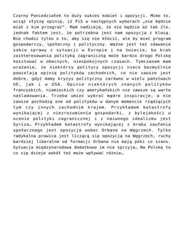 Czarny Poniedziałek to duży sukces kobiet i opozycji. Mimo to, wciąż słyszę opinię, iż PiS w następnych wyborach „nie będzie miał z kim przegrać”. Mam nadzieję, że nie będzie aż tak źle, jednak faktem jest, że potrzebna jest nam opozycja z klasą. Nie chodzi tylko o to, aby się nie kłócić, ale by mieć program gospodarczy, społeczny i polityczny. Ważne jest też zdawanie sobie sprawy z sytuacji w Europie i na świecie, bo brak zainteresowania polityką zagraniczną może bardzo drogo Polskę kosztować w obecnych, niespokojnych czasach. Tymczasem mam wrażenie, że niektórzy politycy opozycji nieco bezmyślnie powielają opinię polityków zachodnich, co nie zawsze jest dobre, gdyż mamy kryzys polityczny zarówno w wielu państwach UE, jak i w USA. Opinie niektórych znanych polityków francuskich, niemieckich czy amerykańskich nie zawsze są warte naśladowania. Trzeba umieć wybrać mądre inspiracje, a nie zawsze pochodzą one od polityków w danym momencie rządzących tym czy innych zachodnim krajem. Przykładem katastrofy wynikającej z niezrozumienia gospodarki, z bylejakości w ocenie polityki zagranicznej i z naiwnego idealizmu jest Syriza… Przykładem katastrofy wynikającej z braku zaufania społecznego jest opozycja wobec Orbana na Węgrzech. Tylko radykalna prawica jest liczącą się opozycją na Węgrzech, ruchy bardziej liberalne od formacji Orbana nie mają póki co szans. Sytuacja międzynarodowa dodatkowo im nie sprzyja… Na Polskę to co się dzieje wokół też może wpływać różnie…