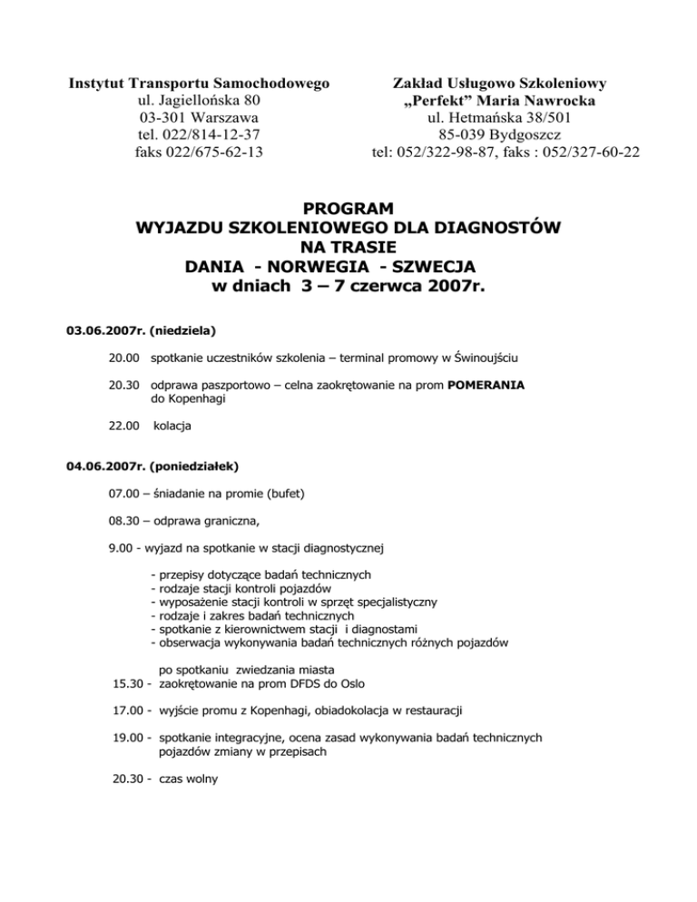 Instytut Transportu Samochodowego ul. JagielloĔska 80 03-301 Warszawa tel. 022/814-12-37 faks 022/675-62-13 Zakáad Usáugowo Szkoleniowy „Perfekt” Maria Nawrocka ul. HetmaĔska 38/501 85-039 Bydgoszcz tel: 052/322-98-87, faks : 052/327-60-22 PROGRAM WYJAZDU SZKOLENIOWEGO DLA DIAGNOSTÓW NA TRASIE DANIA - NORWEGIA - SZWECJA w dniach 3 – 7 czerwca 2007r. 03.06.2007r. (niedziela) 20.00 spotkanie uczestników szkolenia – terminal promowy w ĝwinoujĞciu 20.30 odprawa paszportowo – celna zaokrĊtowanie na prom POMERANIA do Kopenhagi 22.00 kolacja 04.06.2007r. (poniedziaáek) 07.00 – Ğniadanie na promie (bufet) 08.30 – odprawa graniczna, 9.00 - wyjazd na spotkanie w stacji diagnostycznej - przepisy dotyczące badaĔ technicznych rodzaje stacji kontroli pojazdów wyposaĪenie stacji kontroli w sprzĊt specjalistyczny rodzaje i zakres badaĔ technicznych spotkanie z kierownictwem stacji i diagnostami obserwacja wykonywania badaĔ technicznych róĪnych pojazdów po spotkaniu zwiedzania miasta 15.30 - zaokrĊtowanie na prom DFDS do Oslo 17.00 - wyjĞcie promu z Kopenhagi, obiadokolacja w restauracji 19.00 - spotkanie integracyjne, ocena zasad wykonywania badaĔ technicznych pojazdów zmiany w przepisach 20.30 - czas wolny 05.06.2007 r. (wtorek) 07-09.00 - Ğniadanie na promie 9.15 - wejĞcie Oslofiordem do stolicy Norwegii 9.30 - wyjazd na spotkanie w stacji diagnostycznej - badanie techniczne pojazdów w Norwegii przepisy dotyczące badaĔ pojazdów róĪnych typów rodzaje i zakres badaĔ technicznych ocena pracy diagnostów kwalifikacje diagnostów wykonujących badania techniczne pojazdów obserwacja badaĔ wykonywanych na stacji spotkanie z kierownictwem stacji po spotkaniu zwiedzanie miasta: Ratusz Miejski, w którym przyznawana jest pokojowa nagroda Nobla, twierdza Akerhus, park nagich rzeĨb Vigelanda, górująca nad miastem skocznia narciarska Holmenkollen, 16.30 - powrót na prom 17.15 - wyjĞcie promu z Oslo obiadokolacja 18.30 – spotkanie integracyjne omówienie róĪnic w zakresie przepisów i wykonywania badaĔ technicznych pojazdów. 20.00 - czas wolny 06.06.2007r. (Ğroda) 07-09.00 - Ğniadanie na promie 9.15 - wejĞcie promu do Kopenhagi, przejazd mosto – tunelem do Szwecji 11.00 - spotkanie z przedstawicielami Policji w zakresie kontroli pojazdów pod wzglĊdem sprawnoĞci technicznej, wspóápraca ze stacjami kontroli pojazdów, wypadki drogowe a sprawnoĞü techniczna pojazdów badanie pojazdów po wypadkach 15.00 – lunch w restauracji 16.00 - czas wolny 18.00 - wyjazd autokarem na terminal promowy do Ystad 20.30 - zaokrĊtowanie na prom kolacja 22.00 - wyjĞcie promu z Ystad 07.06.2007r. (czwartek) 06-07.00 - Ğniadanie 7.00 - wejĞcie promu do ĝwinoujĞcia, odprawa paszportowa, zakoĔczenie szkolenia Koszt szkolenia: 1.980 zá - dla czáonków Patronatu ITS nad SKP i przedstawicieli firm wspóápracujących z Zakáadem Usáugowo - Szkoleniowym „Perfekt” 2.180 zá - dla pozostaáych uczestników Termin zgáoszenia: Termin wpáat: do dnia 20 kwietnia 2007r. do dnia 25 kwietnia 2007r. ĝwiadczenia: - przejazd promem Polferries POMERANIA w rejsie ĝwinoujĞcie Kopenhaga -przejazd promem Unity Line POLONIA w rejsie Ystad -ĝwinoujĞcie - miejsca w kabinach dwuosobowych z áazienką, - przejazd promem DFDS w rejsie Kopenhaga – Oslo – Kopenhaga, - przejazd mosto-tunelem z Malmo do Kopenhagi - wyĪywienie: * na promie POMERANIA: Ğniadanie, obiadokolacja, * na promie POLONIA : obiadokolacja, Ğniadanie * na promie DFDS : dwa Ğniadania, dwie obiadokolacje (bufet) * w Malmo : lunch w restauracji - przejazd autokarem na caáej trasie - przewodnik w Kopenhadze , Oslo, Malmo i Lund - program merytoryczny w Malmo, Oslo i Kopenhadze - opieka pilota - ubezpieczenie klinnw Signal Iduna