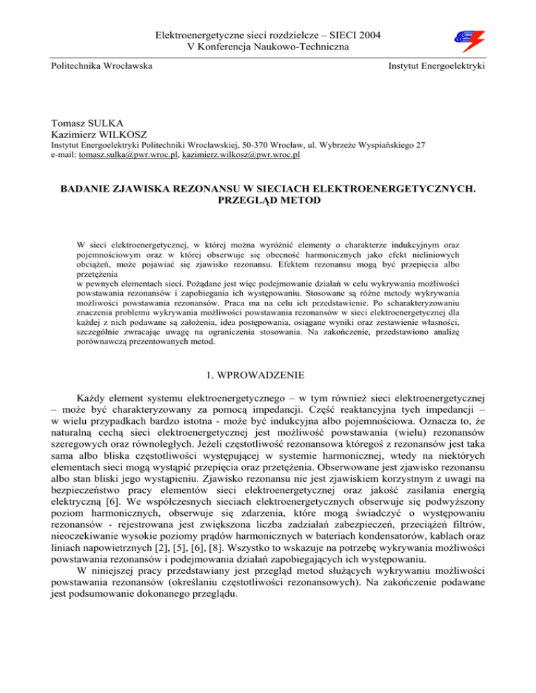 Elektroenergetyczne sieci rozdzielcze – SIECI 2004 V Konferencja Naukowo-Techniczna Politechnika Wrocławska Instytut Energoelektryki Tomasz SULKA Kazimierz WILKOSZ Instytut Energoelektryki Politechniki Wrocławskiej, 50-370 Wrocław, ul. Wybrzeże Wyspiańskiego 27 e-mail: [email protected], [email protected] BADANIE ZJAWISKA REZONANSU W SIECIACH ELEKTROENERGETYCZNYCH. PRZEGLĄD METOD W sieci elektroenergetycznej, w której można wyróżnić elementy o charakterze indukcyjnym oraz pojemnościowym oraz w której obserwuje się obecność harmonicznych jako efekt nieliniowych obciążeń, może pojawiać się zjawisko rezonansu. Efektem rezonansu mogą być przepięcia albo przetężenia w pewnych elementach sieci. Pożądane jest więc podejmowanie działań w celu wykrywania możliwości powstawania rezonansów i zapobiegania ich występowaniu. Stosowane są różne metody wykrywania możliwości powstawania rezonansów. Praca ma na celu ich przedstawienie. Po scharakteryzowaniu znaczenia problemu wykrywania możliwości powstawania rezonansów w sieci elektroenergetycznej dla każdej z nich podawane są założenia, idea postępowania, osiągane wyniki oraz zestawienie własności, szczególnie zwracając uwagę na ograniczenia stosowania. Na zakończenie, przedstawiono analizę porównawczą prezentowanych metod. 1. WPROWADZENIE Każdy element systemu elektroenergetycznego – w tym również sieci elektroenergetycznej – może być charakteryzowany za pomocą impedancji. Część reaktancyjna tych impedancji – w wielu przypadkach bardzo istotna - może być indukcyjna albo pojemnościowa. Oznacza to, że naturalną cechą sieci elektroenergetycznej jest możliwość powstawania (wielu) rezonansów szeregowych oraz równoległych. Jeżeli częstotliwość rezonansowa któregoś z rezonansów jest taka sama albo bliska częstotliwości występującej w systemie harmonicznej, wtedy na niektórych elementach sieci mogą wystąpić przepięcia oraz przetężenia. Obserwowane jest zjawisko rezonansu albo stan bliski jego wystąpieniu. Zjawisko rezonansu nie jest zjawiskiem korzystnym z uwagi na bezpieczeństwo pracy elementów sieci elektroenergetycznej oraz jakość zasilania energią elektryczną [6]. We współczesnych sieciach elektroenergetycznych obserwuje się podwyższony poziom harmonicznych, obserwuje się zdarzenia, które mogą świadczyć o występowaniu rezonansów - rejestrowana jest zwiększona liczba zadziałań zabezpieczeń, przeciążeń filtrów, nieoczekiwanie wysokie poziomy prądów harmonicznych w bateriach kondensatorów, kablach oraz liniach napowietrznych [2], [5], [6], [8]. Wszystko to wskazuje na potrzebę wykrywania możliwości powstawania rezonansów i podejmowania działań zapobiegających ich występowaniu. W niniejszej pracy przedstawiany jest przegląd metod służących wykrywaniu możliwości powstawania rezonansów (określaniu częstotliwości rezonansowych). Na zakończenie podawane jest podsumowanie dokonanego przeglądu. 434 2. CHARAKTERYSTYKA METOD Metody częstotliwościowego skanowania impedancji węzłowych Badanie zjawiska rezonansu w sieci elektroenergetycznej można przeprowadzić analizując impedancje węzłowe (elementy macierzy impedancji węzłowych) w funkcji częstotliwości [1], [4], [11]. Różnice podczas analiz przedstawianych w publikacjach związane są ze sposobem oraz dokładnością modelowania systemu elektroenergetycznego. W opisywanej metodzie zakłada się opis system w postaci równania macierzowego: Y ( h) U ( h) = I ( h) (1) gdzie: h – numer harmonicznej Y – macierz admitancji węzłowych systemu elektroenergetycznego, U – wektor harmonicznych napięć węzłowych, I – wektor harmonicznych prądów węzłowych, Im(Zii(h) ), [Ω] Po utworzeniu macierzy admitancji węzłowych znajdowana jest macierz impedancji węzłowych Y(h)-1, której elementy są skanowane dla wszystkich częstotliwości począwszy od najmniejszej do największej w celu wykrycia częstotliwości rezonansowych. Elementy macierzy impedancji węzłowych Y(h)-1 na płaszczyźnie zespolonej są reprezentowane poprzez krzywe przypominające krzywe spiralne. Krzywe te pokazują, że o ile przy niewielkich częstotliwościach elementy macierzy Y(h)-1 mają charakter indukcyjny, to przy wzroście częstotliwości zmieniają swój charakter na pojemnościowy, a następnie znowu na indukcyjny. Omawiane krzywe mogą kilkukrotnie przecinać oś odciętych. Oznacza to istnienie wielu częstotliwości rezonansowych. Analiza krzywych reprezentujących elementy macierzy Y(h)-1 tylko dla częstotliwości będących całkowitymi krotnościami częstotliwości podstawowej może być niewystarczająca, gdyż nie można zapewnić, że rezonanse będą tylko dla takich częstotliwości. Uwaga ta wskazuje na istotny problem, który ma miejsce podczas analiz rezonansów poprzez analizy częstotliwościowe impedancji węzłowych. Charakteryzowane metody dają możliwość określania wszystkich częstotliwości rezonansowych systemu, zarówno dla rezonansów równoległych jak i szeregowych. W publikacjach zwracana jest uwaga na efektywność oraz dokładność odwzorowywania impedancji węzłowych na płaszczyźnie zespolonej. Zaproponowano adaptacyjne dobieranie kroku zmiany częstotliwości przy obliczaniu części rzeczywistej oraz urojonej impedancji, tak, aby otrzymać odpowiednio wysoką dokładność obliczeń tylko wtedy, gdy jest to konieczne [4]. Na rys. 1 przedstawiony został wykres składowej zgodnej impedancji własnej węzła nr 3, 14-węzłowego systemu testowego IEEE. * hR2 * hR1 hR3 * Badania zostały przeprowadzone ze stałym krokiem zmiany częstotliwości ∆f = 0.1 ⋅ f1 ., przy czym f1 jest częstotliwością składowej podstawowej. We wziętym pod uwagę przypadku kolejno obserwowane są: • rezonans prądów dla częstotliwości f R1 = hR1 f 1 = 6 ⋅ f 1 , Re( Zii(h)), [Ω] • rezonans napięć dla częstotliwości Rys. 1. Impeda