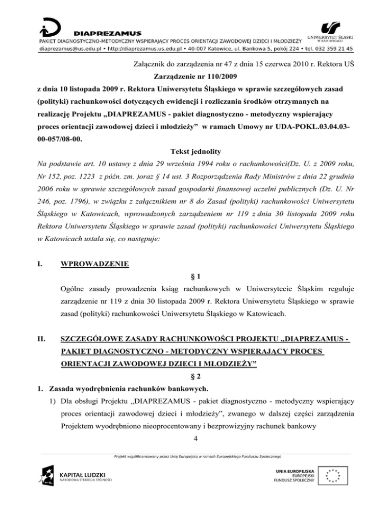 Załącznik do zarządzenia nr 47 z dnia 15 czerwca 2010 r. Rektora UŚ Zarządzenie nr 110/2009 z dnia 10 listopada 2009 r. Rektora Uniwersytetu Śląskiego w sprawie szczegółowych zasad (polityki) rachunkowości dotyczących ewidencji i rozliczania środków otrzymanych na realizację Projektu „DIAPREZAMUS - pakiet diagnostyczno - metodyczny wspierający proces orientacji zawodowej dzieci i młodzieży” w ramach Umowy nr UDA-POKL.03.04.0300-057/08-00. Tekst jednolity Na podstawie art. 10 ustawy z dnia 29 września 1994 roku o rachunkowości(Dz. U. z 2009 roku, Nr 152, poz. 1223 z późn. zm. )oraz § 14 ust. 3 Rozporządzenia Rady Ministrów z dnia 22 grudnia 2006 roku w sprawie szczegółowych zasad gospodarki finansowej uczelni publicznych (Dz. U. Nr 246, poz. 1796), w związku z załącznikiem nr 8 do Zasad (polityki) rachunkowości Uniwersytetu Śląskiego w Katowicach, wprowadzonych zarządzeniem nr 119 z dnia 30 listopada 2009 roku Rektora Uniwersytetu Śląskiego w sprawie zasad (polityki) rachunkowości Uniwersytetu Śląskiego w Katowicach ustala się, co następuje: I. WPROWADZENIE §1 Ogólne zasady prowadzenia ksiąg rachunkowych w Uniwersytecie Śląskim reguluje zarządzenie nr 119 z dnia 30 listopada 2009 r. Rektora Uniwersytetu Śląskiego w sprawie zasad (polityki) rachunkowości Uniwersytetu Śląskiego w Katowicach. II. SZCZEGÓŁOWE ZASADY RACHUNKOWOŚCI PROJEKTU „DIAPREZAMUS PAKIET DIAGNOSTYCZNO - METODYCZNY WSPIERAJĄCY PROCES ORIENTACJI ZAWODOWEJ DZIECI I MŁODZIEŻY” §2 1. Zasada wyodrębnienia rachunków bankowych. 1) Dla obsługi Projektu „DIAPREZAMUS - pakiet diagnostyczno - metodyczny wspierający proces orientacji zawodowej dzieci i młodzieży”, zwanego w dalszej części zarządzenia Projektem wyodrębniono nieoprocentowany i bezprowizyjny rachunek bankowy 4 „Diaprezamus” prowadzony w ING Bank Śląski S.A. Katowice nr 16 1050 1214 1000 0023 4198 7317 2) Dodatkowo dla obsługi finansowej Projektu realizowanego ze środków własnych Uniwersytetu Śląskiego w sytuacji braku środków z transzy rozwojowej został wyodrębniony pomocniczy, nieoprocentowany i bezprowizyjny rachunek bankowy „zasilenia” prowadzony w ING Bank Śląski S.A. Katowice nr 62 1050 1214 1000 0023 4198 5907 2. Zasada wyodrębnienia kont kosztów i przychodów Projektu. 1) W ramach prowadzonych przez Uniwersytet Śląski ksiąg rachunkowych z wykorzystaniem zintegrowanego systemu SAP od dnia 01.01.2010 r. został wyodrębniony obiekt kontrolingowy Projekt „DIAPREZAMUS - pakiet diagnostyczno - metodyczny wspierający proces orientacji zawodowej dzieci i młodzieży” SF-0609-004 ze źródłem finansowania ZFIN00000250 (fundusze strukturalne). 2) Dla Projektu SF-0609-004 została utworzona szczegółowa analityka dla poszczególnych zadań oraz kosztów bezpośrednich i pośrednich - elementy PSP: - 70104052 - przychody na realizację Projektu SF-0609-004, ZFIN00000250, - 20210000 - do ewidencji rozrachunków na analitycznych kontach dostawców materiałów i usług, - 20800000 - do ewidencji rozrachunków zakupów inwestycyjnych, - 23402000 - do ewidencji rozliczeń z pracownikami na analitycznych kontach pracowników, - 24907000 - do ewidencji wypłacanych stypendiów w ramach Projektu, - 13905000 - do ewidencji operacji pieniężnych dokonywanych w ramach Projektu, - 844123000, SF-0609-004 ZFIN00000250 - do ewidencji wpływu środków finansowych. 5 3. Ustalenie zakresu wydatków kwalifikowanych Projektu. 1) W celu jednolitego i prawidłowego rozliczania Projektu uznaje się, że wszystkie wyszczególnione w harmonogramie wydatki są kosztami kwalifikowanymi. 2) Kwalifikowanie kosztów w Projekcie następuje metodą kasową. 3) W ramach Projektu możliwe jest kwalifikowanie wydatków na zasadzie crossfinancingu, przy czym zakupiony w ramach cross- financingu sprzęt to środki trwałe, których wartość początkowa jest wyższa od 10 % kwoty określonej w przepisach podatkowych, uprawniającej do dokonania jednorazowego odpisu amortyzacyjnego. Przyjęto zasadę, że zakupy w ramach cross- financingu o wartości poniżej 3.500,00 zł amortyzowane są jednorazowo i stanowią koszt Projektu. Natomiast zakupy powyżej 3.500,00 zł stanowią wydatek Projektu, jednakże amortyzacja miesięczna będzie kosztem jednostki organizacyjnej, do której dany zakup został przypisany zgodnie z protokołem odbioru. 4) W celach ewidencyjnych zakupione środki trwałe powyżej 3.500,00 zł ujmowane są na elementach PSP z klasą obiektu „INWST” ( inwestycje). 5) Aktywa trwałe nabyte w ramach Projektu nie mogą zostać zbyte przez Uniwersytet Śląski w okresie 5 lat od zakończenia realizacji Projektu. 6) W przypadku dokonywania operacji w walutach obcych wartość transakcji należy przeliczać zgodnie z polityką rachunkowości w Uniwersytecie Śląskim. Wyjątek stanowią zagraniczne wyjazdy służbowe, na które została wypłacona zaliczka. Do wyceny tych kosztów podróży służbowej przyjmowany jest kurs sprzedaży banku (z usług którego jednostka korzysta), po którym zakupiono walutę i wypłacono zaliczkę. 7) Na potrzeby rozliczeń wydatków w walutach obcych, we wnioskach o płatność przyjmuje się zasady określone w dokumentach programowych POKL. 6 4. Zasada podziału kosztów pośrednich w Projekcie. 1) Koszty pośrednie w Projekcie rozliczane są na podstawie rzeczywiście poniesionych wydatków i zostały określone kwotowo dla dopuszczalnych kategorii kosztów pośrednich w budżecie Projektu i wynoszą 283.100,00 zł za cały okres trwania Projektu. 2) Wydatkowanie kwot w ramach kosztów pośrednich musi być udokumentowane dowodami księgowymi rozliczanymi analogicznie jak wydatki bezpośrednie. 5. Zasada ewidencji przychodów osiągniętych w trakcie realizacji Projektu. W ramach Projektu mogą występować przychody pochodzące ze sprzedaży, wynajmu, usług, opłat wpisowych lub innych równoważnych opłat nie będących wkładem własnym w P