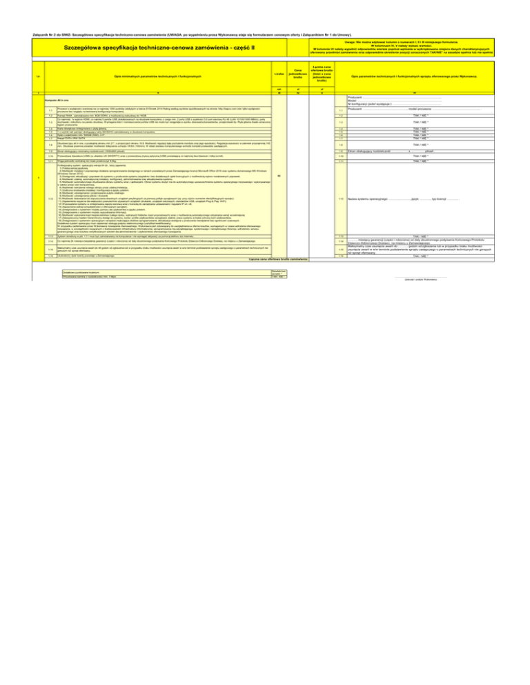 Załącznik Nr 2 do SIWZ- Szczegółowa specyfikacja techniczno-cenowa zamówienia (UWAGA: po wypełnieniu przez Wykonawcę staje się formularzem cenowym oferty i Załącznikiem Nr 1 do Umowy). Uwaga: Nie można edytować kolumn o numerach I, II i III niniejszego formularza. W kolumnach IV, V należy wpisać wartości. W kolumnie VI należy wypełnić odpowiednie wiersze poprzez wpisanie w wykropkowane miejsca danych charakteryzujących oferowany przedmiot zamówienia oraz odpowiednie skreślenie pozycji oznaczonych TAK/NIE* na zasadzie spełnia lub nie spełnia Szczegółowa specyfikacja techniczno-cenowa zamówienia - część II Lp. Opis minimalnych parametrów technicznych i funkcjonalnych I II Cena jednostkowa brutto Łączna cena ofertowa brutto (ilość x cena jednostkowa brutto) szt. zł zł III IV V Liczba Opis parametrów technicznych i funkcjonalnych sprzętu oferowanego przez Wykonawcę. VI Producent: …………………………………………………………………….. Model: ………………………………………………………………………….. Nr konfiguracji (jeżeli występuje ): …………………………………………. Komputer All in one Producent: ….......…......................................., model procesora: ….......……………………………….... . 1.1 Procesor o wydajności ocenionej na co najmniej 1250 punktów zdobytych w teście SYSmark 2014 Rating według wyników opublikowanych na stronie: http://bapco.com (dot. tylko wydajności procesora bez względu na testowaną konfiguracje komputera). 1.1 1.2 Pamięć RAM - zainstalowane min. 8GB DDR4, z możliwością rozbudowy do 16GB. 1.2 TAK / NIE * 1.3 Co najmniej: 1x wyjście HDMI, co najmiej 5 portów USB zlokalizowanych na obudowie komputera, z czego min. 2 porty USB o szybkości 3.0 port sieciowy RJ-45 (LAN 10/100/1000 MBit/s), porty słuchawek i mikrofonu na panelu obudowy. Wymagana ilość i rozmieszczenie portów USB nie może być osiągnięta w wyniku stosowania konwerterów, przejściówek itp. Płyta główna trwale oznaczona logiem producenta. 1.3 TAK / NIE * 1.4 1.5 1.6 1.7 Karta dźwiękowa zintegrowana z płytą główną. 1 x czytnik kart pamięci obsługujący karty SD/SDHC zainstalowany w obudowie komputera. Dysk o pojemności min. 500GB (SSD), 2,5". Napęd DVD+/-RW SATA 1.4 1.5 1.6 1.7 TAK / NIE * TAK / NIE * TAK / NIE * TAK / NIE * 1.8 Obudowa typu all in one, o przekątnej ekranu min 21'', o proporcjach ekranu 16:9. Możliwość regulacji kąta pochylenia monitora oraz jego wysokości. Regulacja wysokości w zakresie przynajmniej 100 mm. Obudowa powinna posiadać możliwość dołączenia uchwytu VESA (100mm), W skład zestawu komputerowego wchodzi komplet przewodów zasilających. 1.8 1.9 Ekran obsługujący minimalną rozdzielczość (1600x900 pikseli) 1.9 1.10 Przewodowa klawiatura (USB) (w układzie US QWERTY) wraz z przewodową myszą optyczną (USB) posiadającą co najmniej dwa klawisze i rolkę (scroll). 1.10 TAK / NIE * 1.11 Waga jednostki centralnej nie może przekroczyć 8,3kg. 1.11 TAK / NIE * 1.12 Profesjonalny system operacyjny wersja 64 bit , który zapewnia: 1) Polską wersję językową. 2) Możliwość instalacji i poprawnego działania oprogramowania dostępnego w ramach posiadanych przez Zamawiającego licencji Microsoft Office 2016 oraz systemu domenowego MS Windows (Windows Server 2012). 3) Dostępność aktualizacji i poprawek do systemu u producenta systemu bezpłatnie i bez dodatkowych opłat licencyjnych z możliwością wyboru instalowanych poprawek. 4) Możliwość zdalnej, automatycznej instalacji, konfiguracji, administrowania oraz aktualizowania systemu. 5) Możliwość automatycznego zbudowania obrazu systemu wraz z aplikacjami. Obraz systemu służyć ma do automatycznego upowszechnienia systemu operacyjnego inicjowanego i wykonywanego w całości przez sieć komputerową. 6) Możliwość wdrożenia nowego obrazu przez zdalną instalację. 7) Graficzne środowisko instalacji i konfiguracji w języku polskim. 8) Możliwość udostępniania i przejmowania pulpitu zdalnego. 9) Możliwość udostępniania plików i drukarek. 10) Możliwość blokowania lub dopuszczania dowolnych urządzeń peryferyjnych za pomocą polityk sprzętowych (np. przy użyciu numerów identyfikacyjnych sprzętu). 11) Zapewnienie wsparcia dla większości powszechnie używanych urządzeń (drukarek, urządzeń sieciowych, standardów USB, urządzeń Plug & Play, WiFi). 12) Wyposażenie systemu w zintegrowaną zaporę sieciową wraz z konsolą do zarządzania ustawieniami i regułami IP v4 i v6. 13) Zapewnienie pełnej kompatybilności z oferowanym sprzętem. 14) Zintegrowanie z systemem modułu pomocy dla użytkownika w języku polskim. 15) Zintegrowanie z systemem modułu wyszukiwania informacji. 16) Możliwość wykonania kopii bezpieczeństwa (całego dysku, wybranych folderów, kopii przyrostowych) wraz z możliwością automatycznego odzyskania wersji wcześniejszej. 17) Zabezpieczony hasłem hierarchiczny dostęp do systemu, konta i profile użytkowników zarządzane zdalnie; praca systemu w trybie ochrony kont użytkowników. 18) Zintegrowane z systemem operacyjnym narzędzia zwalczające złośliwe oprogramowanie; aktualizacja dostępna u producenta nieodpłatnie bez ograniczeń czasowych. Dodatkowo system operacyjny musi zapewniać obsługę podpisu elektronicznego (certyfikat kwalifikowany). W przypadku zaoferowania przez Wykonawcę rozwiązania równoważnego, Wykonawca jest zobowiązany do uwzględnienia w ofercie kosztów, wymaganych w czasie wdrożenia oferowanego rozwiązania, w szczególności związanych z dostosowaniem infrastruktury informatycznej, oprogramowania nią zarządzającego, systemowego i narzędziowego (licencje, wdrożenie), serwisu gwarancyjnego oraz kosztów certyfikowanych szkoleń dla administratorów i użytkowników oferowanego rozwiązania. 1.13 1.14 1 TAK / NIE * Ekran obsługujący rozdzielczoś
