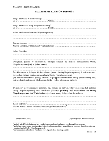 X AKCJA - FORMULARZ D ROZLICZENIE KOSZTÓW PODRÓŻY Imię i nazwisko Wnioskodawcy:……………………………………………………………….. ur. w …………………………………..PESEL…………………………………………….…... Imię i nazwisko Osoby Niepełnosprawnej1: ……………………………………….…………... ur. w……………………………………PESEL……………………………………………....... Adres zamieszkania Osoby Niepełnosprawnej: …………………………………………………………………………………………...……… ..…………………………………………………………………………………………………. .………………………………………………………………………………………………...... Termin turnusu: ……………………………………………………………………….………... Nazwa Ośrodka, w którym odbywał się turnus: ……………………………………………..… …………………………………………………………………………………………….…….. Adres Ośrodka: …………………………………………………………………………………………...……… ………………………………………………………………………………………………...… ……………………………………………………………………………………...…………… Odległość, podana w kilometrach, dzieląca ośrodek od miejsca zamieszkania Osoby Niepełnosprawnej (tj. w jedną stronę): ………………………………………………………………………………………………...… ………………………………………………………………………………………………...… Środki transportu, którymi Wnioskodawca (wraz z Osobą Niepełnosprawną) dotarł na turnus i wrócił do stałego miejsca zamieszkania Osoby Niepełnosprawnej (np. samochód osobowy, pociąg, autobus. W przypadku samochodu należy podać: markę auta, rok produkcji, pojemność silnika, moc silnika i rodzaj używanego paliwa): ………………………………………………………………………………………………....... ....................................................................................................................................................... Dokumenty potwierdzające transport, np. faktury za paliwo, bilety za pociąg lub autobus osoby niepełnosprawnej oraz opiekuna (faktury powinny być wystawione na Osobę Niepełnosprawną lub Wnioskodawcę) – które należy dołączyć do formularza: …………………………………………………………………………………………………... …………………………………………………………………………………………………... …………………………………………………………………………………………………... Koszt podróży2:…………………………………………………………………………………. Nazwa banku i numer rachunku bankowego Wnioskodawcy3 ………………………………… ……………………………………………………………………………………………........... …………………………… (Miejscowość, data) 1 …………………………………. (czytelny podpis Wnioskodawcy) podać, jeżeli Wnioskodawcą jest rodzic, inny przedstawiciel ustawowy lub opiekun prawny podać po zsumowaniu kosztu dojazdu do ośrodka rehabilitacyjnego i kosztu powrotu do stałego miejsca zamieszkania Osoby Niepełnosprawnej. 3 na ten rachunek bankowy Fundacja zwróci poniesione koszty podróży. Strona 1 z 1 2