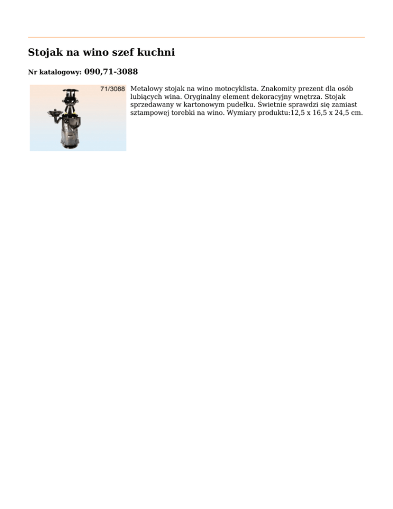 Stojak na wino szef kuchni Nr katalogowy: 090,71-3088 Metalowy stojak na wino motocyklista. Znakomity prezent dla osób lubiących wina. Oryginalny element dekoracyjny wnętrza. Stojak sprzedawany w kartonowym pudełku. Świetnie sprawdzi się zamiast sztampowej torebki na wino. Wymiary produktu:12,5 x 16,5 x 24,5 cm.