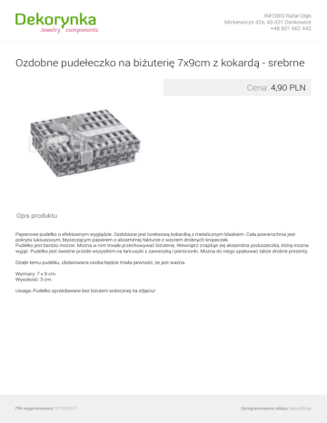 INFOBIS Rafał Głąb Mickiewicza 42a, 43-331 Dankowice +48 601 662 442 Ozdobne pudełeczko na biżuterię 7x9cm z kokardą - srebrne Cena: 4,90 PLN Opis produktu Papierowe pudełko o efektownym wyglądzie. Ozdobione jest lureksową kokardką z metalicznym blaskiem. Cała powierzchnia jest pokryta luksusowym, błyszczącym papierem o aksamitnej fakturze z wzorem drobnych kropeczek. Pudełko jest bardzo mocne. Można w nim trwale przechowywać biżuterię. Wewnątrz znajduje się aksamitna poduszeczka, którą można wyjąć. Pudełko jest świetne przede wszystkim na łańcuszki z zawieszką i pierścionki. Można do niego spakować także drobne prezenty. Dzięki temu pudełku, obdarowana osoba będzie miała pewność, że jest ważna. Wymiary: 7 x 9 cm. Wysokość: 3 cm. Uwaga: Pudełko sprzedawane bez biżuterii widocznej na zdjęciu! Plik wygenerowano: 07-03-2017 Oprogramowanie sklepu: AptusShop INFOBIS Rafał Głąb Mickiewicza 42a, 43-331 Dankowice +48 601 662 442 Galeria Plik wygenerowano: 07-03-2017 Powered by TCPDF (www.tcpdf.org) Oprogramowanie sklepu: AptusShop