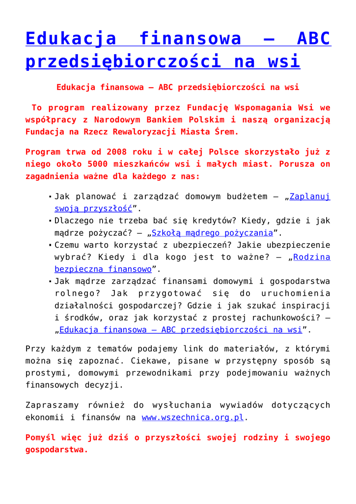 Edukacja finansowa – ABC przedsiębiorczości na wsi Edukacja finansowa – ABC przedsiębiorczości na wsi To program realizowany przez Fundację Wspomagania Wsi we współpracy z Narodowym Bankiem Polskim i naszą organizacją Fundacja na Rzecz Rewaloryzacji Miasta Śrem. Program trwa od 2008 roku i w całej Polsce skorzystało już z niego około 5000 mieszkańców wsi i małych miast. Porusza on zagadnienia ważne dla każdego z nas: Jak planować i zarządzać domowym budżetem – „Zaplanuj swoją przyszłość”. Dlaczego nie trzeba bać się kredytów? Kiedy, gdzie i jak mądrze pożyczać? – „Szkołą mądrego pożyczania”. Czemu warto korzystać z ubezpieczeń? Jakie ubezpieczenie wybrać? Kiedy i dla kogo jest to ważne? – „Rodzina bezpieczna finansowo”. Jak mądrze zarządzać finansami domowymi i gospodarstwa rolnego? Jak przygotować się do uruchomienia działalności gospodarczej? Gdzie i jak szukać inspiracji i środków, oraz jak korzystać z prostej rachunkowości? – „Edukacja finansowa – ABC przedsiębiorczości na wsi”. Przy każdym z tematów podajemy link do materiałów, z którymi można się zapoznać. Ciekawe, pisane w przystępny sposób są prostymi, domowymi przewodnikami przy podejmowaniu ważnych finansowych decyzji. Zapraszamy również do wysłuchania wywiadów ekonomii i finansów na www.wszechnica.org.pl. dotyczących Pomyśl więc już dziś o przyszłości swojej rodziny i swojego gospodarstwa. ABC przedsiębiorczości na Wsi Fundacja na Rzecz Rewaloryzacji Miasta Śrem informuję mieszkańców powiatu Śremskiego, że od 2008 roku jest realizatorem projektu ( „Edukacja Finansowa”). Projekt realizowany jest ze środków Fundacji Wspomagania Wsi i Narodowego Banku Polskiego. Kolejnym 15 godzinnym komponentem projektu „ Edukacja finansowa” jest „ABC Przedsiębiorczości na Wsi”. Kierowany jest do Mieszkańców małych miejscowości – rolników i członków ich rodzin powyżej 17 roku życia. Wymagania wielkość gospodarstwa – do 15 ha. W całej Polsce zrealizowanych zostanie tylko 40 warsztatów, z czego w naszym powiecie Śremskim 3 – w gminach : Brodnica, Dolsk i Książ Wlkp. Serdecznie zapraszamy do udziału w warsztatach zgłoszenia można dokonać w każdej z gmin, osobiście w Fundacji lub wypełniając na stronie internetowej Fundacji druk „Zgłoszenie na szkolenie”. Warsztaty realizowane będą we współpracy ze Spółdzielczym Bankiem Ludowym i Ośrodkiem Doradztwa Rolniczego. Każdy uczestnik otrzyma zaświadczenie potwierdzające udział w warsztatach pod warunkiem systematycznego uczestnictwa. W każdym z warsztatów udział może wziąć 15 osób. Pobierz wniosek i wyślij pocztą na adres e-mail: [email protected] ABC przedsiębiorczości na wsi Wniosek Terminy szkoleń w poszczególnych gminach : Gmina Dolsk : Warsztaty odbywać się będą w siedzibie biblioteki publicznej w Dolsku od Godziny 15 0 0 . 25.09.2013 26.09.2013 27.09.2013 Gmina Książ Wlkp. : Warsztaty odbywać się będą w Centrum Kultury Książ od godziny 1500. 16.10.2013 17.10.2013 18.10.2013 Gmina Brodnica : Warsztaty odbywać się będą w siedzibie gminy Brodnica od godziny 1500. 21.10.2013 22.10.2013 23.10.2013 Adres Fundacji na Rzecz Rewaloryzacji Miasta Śrem : ul. Mickiewicza 21 63 – 100 Śrem www.fundacja.srem.info Szczegółowy program szkolenia.: Moduł 1. Zbieranie i analiza danych finansowych z gospodarstwa rolnego i domowego, planowanie krótko i długo terminowe. – Wieś wczoraj i dziś. – Budżet domowy i gospodarstwa – razem czy osobno, czyli jak nie utonąć. – Rachunkowość w gospodarstwie rolnym krok po kroku. Moduł 2 Przedsiębiorczość – Zarządzanie Finansami Gospodarstwa. – Jak poprawić dochodowość gospodarstwa. – Przedsiębiorczość możliwością zwiększania dochodu. – Gotówka na start. Moduł 3 Inwestowanie krótko i długo terminowe, bankowe narzędzia online. – Inwestowanie konieczność czy potrzeba. – Czym jest bankowość elektroniczna. – Zasady bezpieczeństwa elektronicznej. w korzystaniu z bankowości 21 Maja Zapraszamy na Majówkę !!! Majówka – Świat Bajkolandii Serdecznie zapraszamy na majówkę 21.05.2013 na Terenie DPS Psarskie dla dzieci i młodzieży niepełnosprawnej. Wśród wielu atrakcji znajdzie się konkurencja „Parada Przebierańców”, w której uczestnicy będą oceniani za najciekawszą aranżację indywidualnie lub grupowo tematycznie związaną z filmem ,,Piotruś Pan” oraz jak co roku konkurencje sportowe, a dla maluchów przewidziany jest kącik plastyczny, malowanie twarzy. Przewidujemy również atrakcje – niespodziankę !!! Program Majówki 2013 „Świat Bajkolandii” 21.05.2013 Teren DPS Psarskie 10 00 – 10 05 Powitanie gości i uczestników, otwarcie imprezy przez Burmistrza Śremu Pana Adama Lewandowskiego. Realizacja programu: 10 05 – 10 45 11 00 – 11 15 11 15 – 13 00 Konkurencje sportowe. 13 00 – 13 30 Obiad 13 30 – 14 00 Wręczenie nagród, zakończenie. Parada przebierańców. II śniadanie Atrakcje towarzyszące: Kącik artystyczny „Świat Bajkolandii”, Przejażdżki konne. Impreza została sfinansowana z budżetu gminy Śrem, PCPR, Fundacji na Rzecz Rewaloryzacji miasta Śrem Majówka – Świat Bajkolandii Serdecznie zapraszamy na majówkę 21.05.2013 na Terenie DPS Psarskie dla dzieci i młodzieży niepełnosprawnej. Wśród wielu atrakcji znajdzie się konkurencja „Parada Przebierańców”, w której uczestnicy będą oceniani za najciekawszą aranżację indywidualnie lub grupowo tematycznie związaną z filmem ,,Piotruś Pan” oraz jak co roku konkurencje sportowe, a dla maluchów przewidziany jest kącik plastyczny, malowanie twarzy. Przewidujemy również atrakcje – niespodziankę !!! Program Majówki 2013 „Świat Bajkolandii” 21.05.2013 Teren DPS Psarskie 10 00 – 10 05 Powitanie gości i uczestników, otwarcie imprezy przez Burmistrza Śremu Pana Adama Lewandowskiego. Real