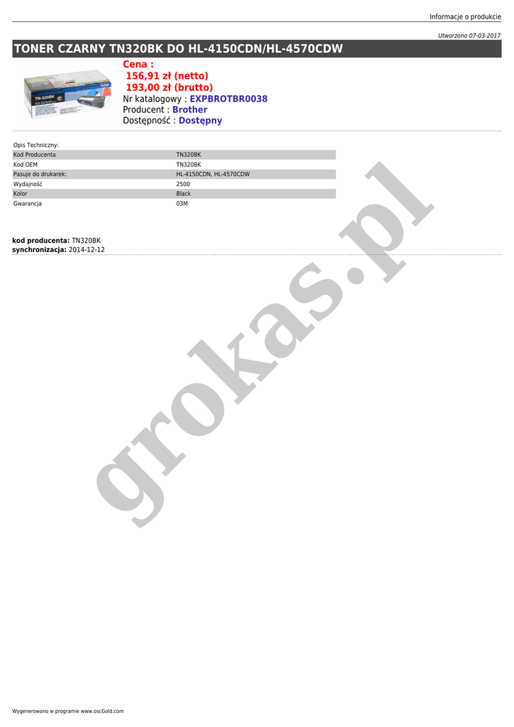 Informacje o produkcie Utworzono 07-03-2017 TONER CZARNY TN320BK DO HL-4150CDN/HL-4570CDW Cena : 156,91 zł (netto) 193,00 zł (brutto) Nr katalogowy : EXPBROTBR0038 Producent : Brother Dostępność : Dostępny Opis Techniczny: TN320BK Kod OEM TN320BK Pasuje do drukarek: HL-4150CDN, HL-4570CDW Wydajność 2500 Kolor Black Gwarancja 03M .p l Kod Producenta gr ok as kod producenta: TN320BK synchronizacja: 2014-12-12 Wygenerowano w programie www.oscGold.com