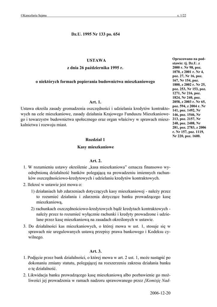©Kancelaria Sejmu s. 1/22 Dz.U. 1995 Nr 133 po. 654 Opracowano na podstawie: tj. Dz.U. z 2000 r. Nr 98, poz. z dnia 26 października 1995 r. 1070, z 2001 r. Nr 4, poz. 27, Nr 16, poz. 167, Nr 154, poz. o niektórych formach popierania budownictwa mieszkaniowego 1800, z 2002 r. Nr 25, poz. 253, Nr 153, poz. 1271, Nr 216, poz. 1824, Nr 240, poz. 2058, z 2003 r. Nr 65, Art. 1. poz. 594, z 2004 r. Nr Ustawa określa zasady gromadzenia oszczędności i udzielania kredytów kontrakto- 141, poz. 1492, Nr wych na cele mieszkaniowe, zasady działania Krajowego Funduszu Mieszkaniowe- 146, poz. 1546, Nr go i towarzystw budownictwa społecznego oraz organ właściwy w sprawach miesz- 213, poz. 2157, Nr 240, poz. 2408, Nr kalnictwa i rozwoju miast. 281, poz. 2783, z 2006 r. Nr 157, poz. 1119, Nr 220, poz. 1600. USTAWA Rozdział 1 Kasy mieszkaniowe Art. 2. 1. W rozumieniu ustawy określenie „kasa mieszkaniowa” oznacza finansowo wyodrębnioną działalność banków polegającą na prowadzeniu imiennych rachunków oszczędnościowo-kredytowych i udzielaniu kredytów kontraktowych. 2. Ilekroć w ustawie jest mowa o: 1) działaniach lub zdarzeniach dotyczących kasy mieszkaniowej - należy przez to rozumieć działania i zdarzenia dotyczące banku prowadzącego kasę mieszkaniową, 2) rachunkach oszczędnościowo-kredytowych bądź kredytach kontraktowych należy przez to rozumieć wyłącznie rachunki i kredyty prowadzone i udzielane przez kasę mieszkaniową na zasadach określonych w ustawie. 3. Do działalności kas mieszkaniowych, o której mowa w ust. 1, stosuje się w sprawach nie uregulowanych ustawą przepisy prawa bankowego i Kodeksu cywilnego. Art. 3. 1. Podjęcie przez bank działalności, o której mowa w art. 2 ust. 1, może nastąpić po dokonaniu zmiany statutu, polegającej na rozszerzeniu zakresu działania banku o tę działalność. 2. Likwidacja banku prowadzącego kasę mieszkaniową albo pozbawienie go możliwości jej prowadzenia w ramach nadzoru sprawowanego przez [Komisję Nad2006-12-20 ©Kancelaria Sejmu s. 2/22 zoru Bankowego] <Komisję Nadzoru Finansowego> wymaga wskazania banku przejmującego tę działalność. 3. Bank przejmujący działalność wstępuje, z mocy prawa, w prawa i obowiązki strony umów o kredyt kontraktowy. Jednocześnie przechodzą na niego zobowiązania i wierzytelności oraz inne aktywa i pasywa związane z przejętą działalnością. 4. [Komisja Nadzoru Bankowego] <Komisja Nadzoru Finansowego> określi, w drodze zarządzenia, szczegółowe zasady finansowego wyodrębniania kas mieszkaniowych w bankach oraz rozliczeń między bankiem, który zaprzestał prowadzenia kasy mieszkaniowej, a bankiem przejmującym tę działalność. Art. 4. 1. Środki zgromadzone na imiennych rachunkach oszczędnościowo-kredytowych w kasach mieszkaniowych są wkładami oszczędnościowymi. Wkłady te są objęte obowiązkowym systemem gwarantowania środków pieniężnych na rachunkach banków, a co do wysokości wkładów, które łącznie z należnymi odsetkami przekraczają kwoty gwarantowane - gwarancją uzupełniającą Skarbu Państwa do wysokości określonej odrębnymi przepisami. 2. Środki zgromadzone na imiennych rachunkach oszczędnościowo-kredytowych w kasach mieszkaniowych nie mogą być przeznaczone na finansowanie innych zobowiązań banków niż związane z działalnością kas mieszkaniowych. 3. Od środków gromadzonych na rachunkach oszczędnościowo-kredytowych kas mieszkaniowych nie jest odprowadzana rezerwa obowiązkowa, o której mowa w art. 38 ust. 1 ustawy z dnia 29 sierpnia 1997 r. o Narodowym Banku Polskim (Dz.U. Nr 140, poz. 938 i z 1998 r. Nr 160, poz. 1063). Art. 5. 1. Przychodami kasy mieszkaniowej są: 1) odsetki i prowizje od udzielonych kredytów kontraktowych, 2) opłaty manipulacyjne od wpłat dokonywanych na rachunki oszczędnościowokredytowe, 3) odsetki od lokat środków kasy na rachunkach terminowych w bankach, 4) wpływy z inwestycji kasy w papiery wartościowe emitowane przez Skarb Państwa lub Narodowy Bank Polski, bądź poręczone lub gwarantowane przez Skarb Państwa oraz w listy zastawne emitowane na podstawie ustawy z dnia 29 sierpnia 1997 r. o listach zastawnych i bankach hipotecznych (Dz.U. Nr 140, poz. 940 i z 1998 r. Nr 107, poz. 669), 5) wpływy z inwestycji kasy w jednostki uczestnictwa funduszy rynku pieniężnego, o których mowa w art. 178 ustawy z dnia 27 maja 2004 r. o funduszach inwestycyjnych (Dz.U. Nr 146, poz. 1546). 2. Suma lokat, o których mowa w ust. 1 pkt 3, w jednym banku lub w grupie banków, powiązanych ze sobą kapitałowo lub organizacyjnie, nie może przekroczyć 15% sumy środków zgromadzonych na rachunkach oszczędnościowokredytowych w kasie mieszkaniowej. 3. Przychody kasy mieszkaniowej są przeznaczane na pokrycie: 2006-12-20 zmiany w ust. 2 i 4 w art. 3 wchodzą w życie z dn. 1.01.2008 r. (Dz.U. 2006 r. Nr 157, poz. 1119) ©Kancelaria Sejmu s. 3/22 1) odsetek od gromadzonych w kasie oszczędności, 2) odsetek od pożyczek zaciągniętych ze środków Krajowego Funduszu Mieszkaniowego lub innego banku, 3) kosztów prowadzenia kasy, 4) wynagrodzenia banku prowadzącego kasę, w wysokości do 1% wpłat dokonywanych na rachunki oszczędnościowo-kredytowe. 4. Przychody kasy mieszkaniowej, pomniejszone o wydatki, o których mowa w ust. 3, przeznacza się w całości na kredyty kontraktowe i utrzymanie bieżącej płynności płatniczej w zakresie związanym z działalnością kasy. 5. Nadwyżka zgromadzonych środków nad wymagalnymi zobowiązaniami kasy mieszkaniowej wynikającymi z umów o kredyt kontraktowy może być przeznaczona na: 1) nabycie papierów wartościowych emitowanych przez Skarb Państwa lub Narodowy Bank Polski bądź poręczonych lub gwarantowanych przez Skarb Państwa oraz nabycie listów zastawnych emitowanych na podstawie ustawy, o której mowa w ust. 1 pkt 4, 2) lokaty, o których mowa w ust. 1 pkt 3, 3) nabycie jednostek uczestnictwa funduszy rynku pieniężnego,