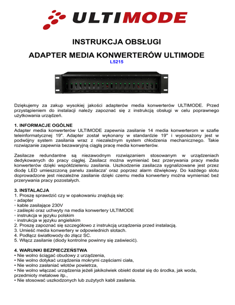 INSTRUKCJA OBSŁUGI ADAPTER MEDIA KONWERTERÓW ULTIMODE L5215 Dziękujemy za zakup wysokiej jakości adapterów media konwerterów ULTIMODE. Przed przystąpieniem do instalacji należy zapoznać się z instrukcją obsługi w celu poprawnego użytkowania urządzeń. 1. INFORMACJE OGÓLNE Adapter media konwerterów ULTIMODE zapewnia zasilanie 14 media konwerterom w szafie teleinformatycznej 19". Adapter został wykonany w standardzie 19'' i wyposażony jest w podwójny system zasilania wraz z niezależnym system chłodzenia mechanicznego. Takie rozwiązanie zapewnia bezawaryjną ciągłą pracę media konwerterów. Zasilacze redundantne są niezawodnym rozwiązaniem stosowanym w urządzeniach dedykowanych do pracy ciągłej. Zasilacz można wymieniać bez przerywania pracy media konwerterów dzięki współdzieleniu zasilania. Uszkodzenie zasilacza sygnalizowane jest przez diodę LED umieszczoną panelu zasilacza' oraz poprzez alarm dźwiękowy. Do każdego slotu doprowadzone jest niezależne zasilanie dzięki czemu media konwertery można wymieniać beż przerywania pracy pozostałych. 3. INSTALACJA 1. Proszę sprawdzić czy w opakowaniu znajdują się: ◦ adapter ◦ kable zasilające 230V ◦ zaślepki oraz uchwyty na media konwertery ULTIMODE ◦ instrukcja w języku polskim ◦ instrukcja w języku angielskim 2. Proszę zapoznać się szczegółowo z instrukcją urządzenia przed instalacją. 3. Umieść media konwertery w odpowiednich slotach. 4. Podłącz światłowody do złącz SC. 5. Włącz zasilanie (diody kontrolne powinny się zaświecić). 4. WARUNKI BEZPIECZEŃSTWA • Nie wolno ściągać obudowy z urządzenia, • Nie wolno dotykać urządzenia mokrymi częściami ciała, • Nie wolno zasłaniać wlotów powietrza, • Nie wolno włączać urządzenia jeżeli jakikolwiek obiekt dostał się do środka, jak woda, przedmioty metalowe itp., • Nie stosować uszkodzonych lub zużytych kabli zasilania. • Prace instalacyjne powinny być wykonywane przez odpowiednio przeszkolony personel • Zabezpieczyć urządzenie przed dostępem osób niepowołanych • Jeżeli urządzenie zostanie przeniesione z miejsca chłodnego do ciepłego, w urządzeniu może skroplić się para wodna uniemożliwiająca poprawne działanie media konwertera. Przed przystąpieniem do dalszej pracy należy odczekać aż wilgoć odparuje. • Nie należy dotykać styków gniazd na obudowie urządzenia. Wyładowania elektrostatyczne mogą uszkodzić urządzenia. UWAGA! Podczas pracy nie wolno patrzeć bezpośrednio w port optyczny. 5. PARAMETRY TECHNICZNE kolor zielony – poprawna praca Dioda LED kolor czerwony/brak – praca niepoprawna Sygnalizacja dźwiękowa Parametry zasilania Parametry wyjściowe nieprawidłowa praca zasilacza 86-265V AC / 1.8A max 50/60Hz 5V DC / 12A Nazwa Kod Adapter dla 14 media konwerterów ULTIMODE do szafy typu rack 19'' L5215 Ilość slotów 14 Ilość zasilaczy 2 Szerokość zewnętrzna ["] 19 Szerokość wewnętrzna [U] 2 Szerokość 485 Wysokość 90 Głębokość 231 Kolor Temperatura pracy czarny 0 ... 50ºC 6. INFORMACJE DODATKOWE PRODUCENT: DIPOL Gołaszewski Gwizdała Waśniowski Spółka Jawna POLAND, 31-587 Kraków, ul Ciepłownicza 40 www.dipol.com.pl REKLAMACJE: www.dipol.com.pl/reklamacje Firma DIPOL zastrzega sobie prawo do wprowadzania zmian w instrukcji i opisywanych urządzeniach bez uprzedniego powiadomienia. Przy opracowaniu podręcznika dołożono wszelkich starań, aby był bez błędów i aby były w nim podane wszystkie potrzebne informacje. Pomimo to firma DIPOL nie daje żadnych gwarancji, obejmujących bez ograniczeń jakiekolwiek gwarancje zastosowania do określonych celów, które by mogły wynikać z niniejszej instrukcji. Firma DIPOL nie ponosi żadnej odpowiedzialności za błędy zawarte w podręczniku, lub za przypadkowe, specjalne lub następcze szkody i straty, powstałe w wyniku przygotowania lub stosowania informacji zawartych w niniejszym podręczniku w trakcie obsługi urządzenia, lub związane z wydajnością urządzenia obsługiwanego zgodnie z tymi informacjami. Deklaracja Zgodności DIPOL Gołaszewski, Gwizdała, Waśniowski Spółka Jawna deklaruje, że następujący produkt: Produkt: Adapter dla 14 media konwerterów ULTIMODE do szafy typu rack 19'' Model: L5215 Jest zgodny z normą: EN 60950-1:2006+A11:2009 Piotr Waśniowski dyrektor