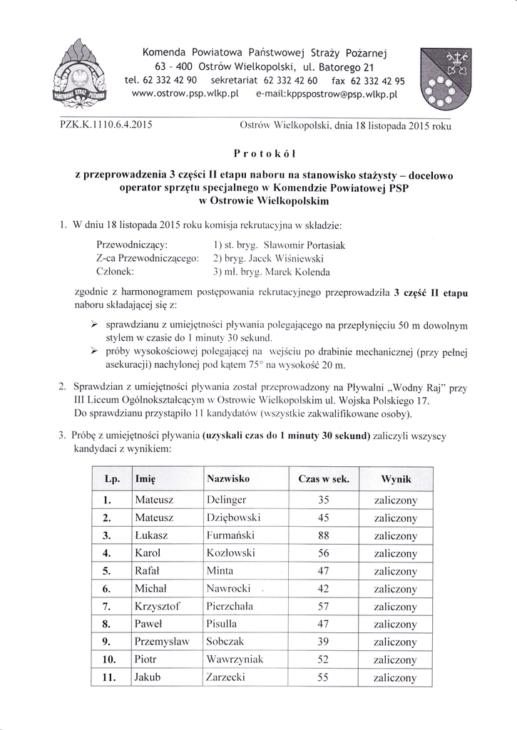 Komenda Powiatowa Państwowej Straży Pożarnej 63 _ 400 ostrów Wielkopolski, ul. Batorego 21 tet. ó2 33Ż 42 90 sekretariat 6Ż 33Ż 4z 60 fax 6Ż 33z 42 www.ostrow.psp.wtkp.pt e-mait:[email protected] P2K.K.11r0.6.4.2015 95 ostrów Wielkopolski, dnia l8 listopada 20l5 roku Protokół z przeprowadzenia 3 częściII etapu naboru na stanowisko stażysty - docelowo operator sprzętu specjalnego w Komendzie Powiatowej PSP w Ostrowie Wielkopolskim 1. W dniu 18 listopada2}ll roku korrrisja rekrutacyjna w składzie: Przewodniczący: 1) st. Z-caPrzewodniczącego: Członek: bryg. Sławolrrir Portasiak 2) bryg. Jacek Wiśrriewski 3) rnł. bryg. Marek Kolenda zgodnie z lrarmonogramem postępowania rekrutacyjnego przeprowadz1ła 3 częśćII etapu naboru składającej się z: stylern w czasie do 1 minuty 30 sekLrnd. asekuracji) rrachylorrej pod kątenr 75" na wysokość20 rn. Ż. Sprawdziarr z umiejętnoŚci pływania został przeprowadZony na Pływalni Raj'' przy ''Wodny III Liceurn ogólnokształcącyn-r w ostrowie Wielkopolskim ul. Wojska Polskiego 17. Do sprawdzianu przystąpiło 1l karrdydatów (wszystkie zakwalifikowane osoby). 3. Próbę z umiejętności pływarria (uzyskali cz:rs clo 1 minuĘ 30 sekund) zaliczyliwszyscy kandydaci z wynikiem: Lp. Imię Nazwisko Czas w sek. Wynik l. Mateusz Delinger 35 zaliczony ) Mateusz Dziębowski 45 zaliczonv 3. Łukasz Furrnański 88 zaliczony 4. Karol Kozłowski 56 zahczor^y 5. Rafał Minta 47 zaliczony 6. Michał Nawrocki 42 zaliczony 7. Krzysztof Pierzchała 57 zaliczony 8. Paweł Pisulla 47 zaliczony 9. Przemysław Sobczak 39 zaliczony 10. Piotr Wawrzyniak 52 zaliczony ll. Jakub Zaruecki 55 zaliczony J 5. Próba wysokościowazostała przeprowadzona na placu Komendy Powiatowej PSP w Ostrowie Wielkopolskim przy ul. Stefana Batorego 21. Do próby przystąpiło 11 kandydatów (wszystkie zakwalifikowane osoby). 6. Próba wysokościowa czyli wejście po drabinie mechanicznej nachylonej pod kątem 75" na wysokość20 m: Lp. Imię P Mateusz Delinger zaliczony 2 Mateusz Dzięborvski zaliczony 3 Łllkasz Furrnański zaliczony 4 Karol Kozłorvski zaliczony 5 Rafał Minta zaliczony 6 Michał Nawrocki zaliczony 7 Krzysztof Pierzchała zaliczony 8 Paweł Pisulla zaliczony 9 Przetnysław Sobczak zaliczony 10 Piotr Warvrzyniak zaliczony 11 Jakub Zarzecki zaliczony rzęwodniczące go Członkowie: Wynik I l) Przewodniczący: Z-ca Nazwisko : st. bryg. Sławorrrir Portasiak 2) bryg. .Iacek Wiśrriewski 3) nrł. br'yg. Marek Kolerrda