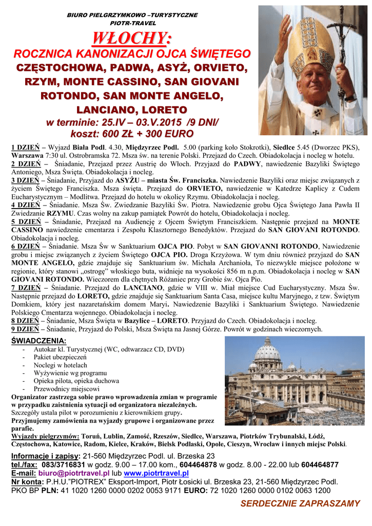 BIURO PIELGRZYMKOWO –TURYSTYCZNE PIOTR-TRAVEL WŁOCHY: ROCZNICA KANONIZACJI OJCA ŚWIĘTEGO CZĘSTOCHOWA, PADWA, ASYŻ, ORVIETO, RZYM, MONTE CASSINO, SAN GIOVANI ROTONDO, SAN MONTE ANGELO, LANCIANO, LORETO w terminie: 25.IV – 03.V.2015 /9 DNI/ koszt: 600 ZŁ + 300 EURO 1 DZIEŃ – Wyjazd Biała Podl. 4.30, Międzyrzec Podl. 5.00 (parking koło Stokrotki), Siedlce 5.45 (Dworzec PKS), Warszawa 7:30 ul. Ostrobramska 72. Msza św. na terenie Polski. Przejazd do Czech. Obiadokolacja i nocleg w hotelu. 2 DZIEŃ – Śniadanie, Przejazd przez Austrię do Włoch. Przyjazd do PADWY, nawiedzenie Bazyliki Świętego Antoniego, Msza Święta. Obiadokolacja i nocleg. 3 DZIEŃ – Śniadanie, Przyjazd do ASYŻU – miasta Św. Franciszka. Nawiedzenie Bazyliki oraz miejsc związanych z życiem Świętego Franciszka. Msza święta. Przejazd do ORVIETO, nawiedzenie w Katedrze Kaplicy z Cudem Eucharystycznym – Modlitwa. Przejazd do hotelu w okolicy Rzymu. Obiadokolacja i nocleg. 4 DZIEŃ – Śniadanie. Msza Św. Zwiedzanie Bazyliki Św. Piotra. Nawiedzenie grobu Ojca Świętego Jana Pawła II Zwiedzanie RZYMU. Czas wolny na zakup pamiątek Powrót do hotelu, Obiadokolacja i nocleg. 5 DZIEŃ – Śniadanie, Przejazd na Audiencję z Ojcem Świętym Franciszkiem. Następnie przejazd na MONTE CASSINO nawiedzenie cmentarza i Zespołu Klasztornego Benedyktów. Przejazd do SAN GIOVANI ROTONDO. Obiadokolacja i nocleg. 6 DZIEŃ – Śniadanie. Msza Św w Sanktuarium OJCA PIO. Pobyt w SAN GIOVANNI ROTONDO, Nawiedzenie grobu i miejsc związanych z życiem Świętego OJCA PIO. Droga Krzyżowa. W tym dniu również przyjazd do SAN MONTE ANGELO, gdzie znajduje się Sanktuarium św. Michała Archanioła, To niezwykłe miejsce położone w regionie, który stanowi „ostrogę” włoskiego buta, widnieje na wysokości 856 m n.p.m. Obiadokolacja i nocleg w SAN GIOVANI ROTONDO. Wieczorem dla chętnych Różaniec przy Grobie św. Ojca Pio. 7 DZIEŃ – Śniadanie. Przejazd do LANCIANO, gdzie w VIII w. Miał miejsce Cud Eucharystyczny. Msza Św. Następnie przejazd do LORETO, gdzie znajduje się Sanktuarium Santa Casa, miejsce kultu Maryjnego, z tzw. Świętym Domkiem, który jest nazaretańskim domem Maryi. Nawiedzenie Bazyliki i Sanktuarium Świętego. Nawiedzenie Polskiego Cmentarza wojennego. Obiadokolacja i nocleg. 8 DZIEŃ – Śniadanie, Msza Święta w Bazylice – LORETO. Przyjazd do Czech. Obiadokolacja i nocleg. 9 DZIEŃ – Śniadanie, Przyjazd do Polski, Msza Święta na Jasnej Górze. Powrót w godzinach wieczornych. ŚWIADCZENIA: - Autokar kl. Turystycznej (WC, odtwarzacz CD, DVD) - Pakiet ubezpieczeń - Noclegi w hotelach - Wyżywienie wg programu - Opieka pilota, opieka duchowa - Przewodnicy miejscowi Organizator zastrzega sobie prawo wprowadzenia zmian w programie w przypadku zaistnienia sytuacji od organizatora niezależnych. Szczegóły ustala pilot w porozumieniu z kierownikiem grupy. Przyjmujemy zamówienia na wyjazdy grupowe i organizowane przez parafie. Wyjazdy pielgrzymów: Toruń, Lublin, Zamość, Rzeszów, Siedlce, Warszawa, Piotrków Trybunalski, Łódź, Częstochowa, Katowice, Radom, Kielce, Kraków, Bielsk Podlaski, Opole, Cieszyn, Wrocław i innych miejsc Polski. Informacje i zapisy: 21-560 Międzyrzec Podl. ul. Brzeska 23 tel./fax: 083/3716831 w godz. 9.00 – 17.00 kom., 604464878 w godz. 8.00 - 22.00 lub 604464877 E-mail: [email protected] lub www.piotrtravel.pl Nr konta: P.H.U.”PIOTREX” Eksport-Import, Piotr Łosicki ul. Brzeska 23, 21-560 Międzyrzec Podl. PKO BP PLN: 41 1020 1260 0000 0202 0053 9171 EURO: 72 1020 1260 0000 0102 0063 1200 SERDECZNIE ZAPRASZAMY