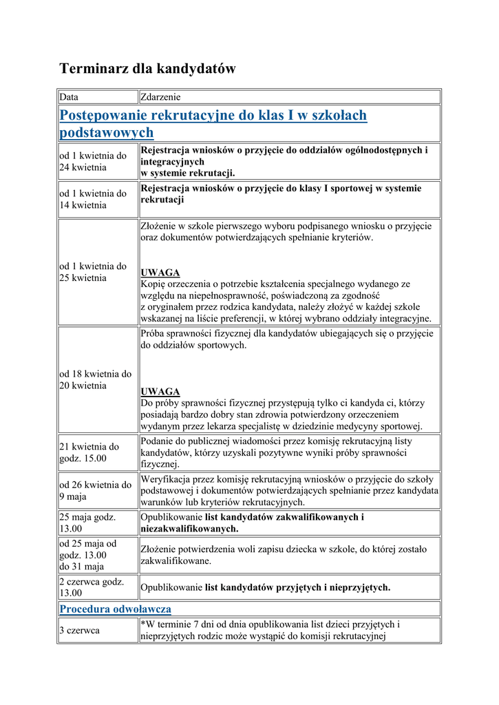 Terminarz dla kandydatów Postępowanie rekrutacyjne do klas I w