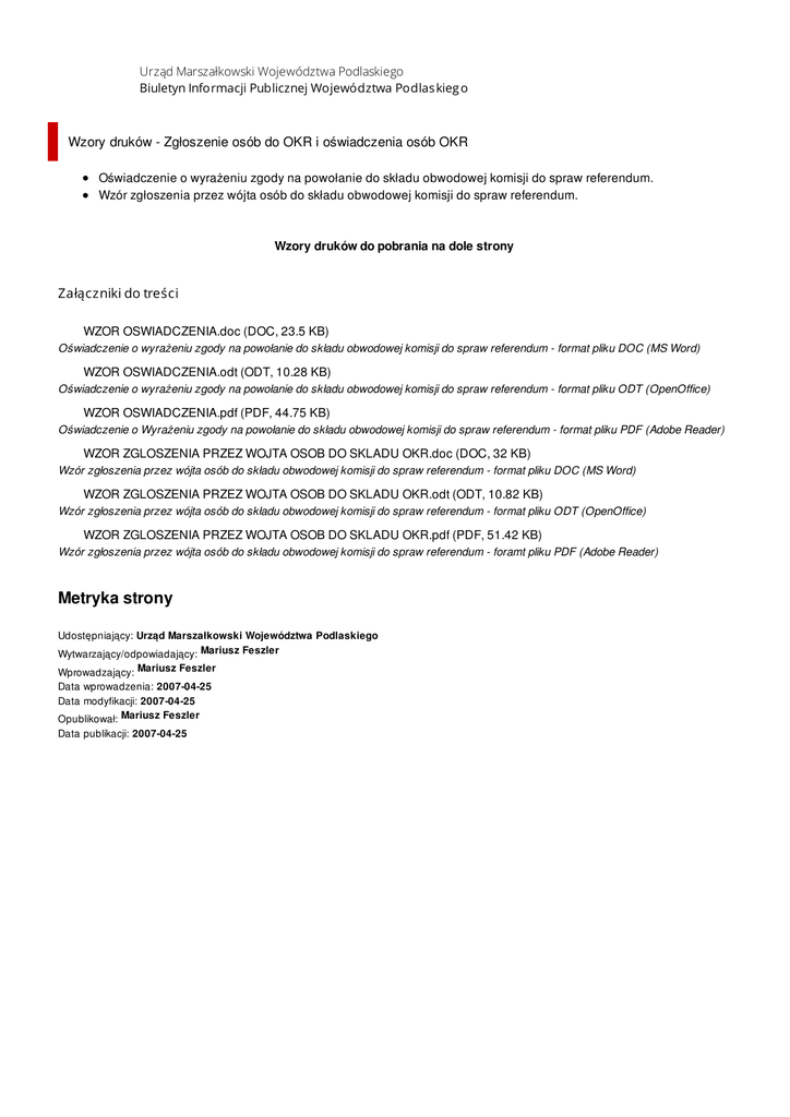 Urząd Marszałkowski Województwa Podlaskiego Biuletyn Informacji Publicznej Województwa Podlas kieg o Wzory druków - Zgłoszenie osób do OKR i oświadczenia osób OKR Oświadczenie o wyrażeniu zgody na powołanie do składu obwodowej komisji do spraw referendum. Wzór zgłoszenia przez wójta osób do składu obwodowej komisji do spraw referendum. Wzory druków do pobrania na dole strony Załączniki do treści WZOR OSWIADCZENIA.doc (DOC, 23.5 KB) Oświadczenie o wyrażeniu zgody na powołanie do składu obwodowej komisji do spraw referendum - format pliku DOC (MS Word) WZOR OSWIADCZENIA.odt (ODT, 10.28 KB) Oświadczenie o wyrażeniu zgody na powołanie do składu obwodowej komisji do spraw referendum - format pliku ODT (OpenOffice) WZOR OSWIADCZENIA.pdf (PDF, 44.75 KB) Oświadczenie o Wyrażeniu zgody na powołanie do składu obwodowej komisji do spraw referendum - format pliku PDF (Adobe Reader) WZOR ZGLOSZENIA PRZEZ WOJTA OSOB DO SKLADU OKR.doc (DOC, 32 KB) Wzór zgłoszenia przez wójta osób do składu obwodowej komisji do spraw referendum - format pliku DOC (MS Word) WZOR ZGLOSZENIA PRZEZ WOJTA OSOB DO SKLADU OKR.odt (ODT, 10.82 KB) Wzór zgłoszenia przez wójta osób do składu obwodowej komisji do spraw referendum - format pliku ODT (OpenOffice) WZOR ZGLOSZENIA PRZEZ WOJTA OSOB DO SKLADU OKR.pdf (PDF, 51.42 KB) Wzór zgłoszenia przez wójta osób do składu obwodowej komisji do spraw referendum - foramt pliku PDF (Adobe Reader) Metryka strony Udostępniający: Urząd Marszałkowski Województwa Podlaskiego Wytwarzający/odpowiadający: Mariusz Feszler Wprowadzający: Mariusz Feszler Data wprowadzenia: 2007-04-25 Data modyfikacji: 2007-04-25 Opublikował: Mariusz Feszler Data publikacji: 2007-04-25