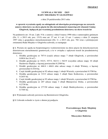 PROJEKT UCHWAŁA NR XIII/ /2015 RADY MIEJSKIEJ W GŁOGÓWKU z dnia 29 października 2015 roku w sprawie wyrażenia zgody na odstąpienie od obowiązku przetargowego na zawarcie umowy dzierżawy na okres pięciu lat dla nieruchomości stanowiących własność Gminy Głogówek, będących już wcześniej przedmiotem dzierżawy na okres trzech lat Na podstawie art. 18 ust. 2 pkt. 9 lit. a ustawy z dnia 8 marca 1990 roku o samorządzie gminnym (Dz. U. z 2015 rok, poz. 1515) oraz art. 37 ust. 4 i art. 13 ust. 1 ustawy z dnia 21 sierpnia 1997 roku o gospodarce nieruchomościami (Dz. U. z 2015 rok, poz. 782 wraz z późniejszymi zmianami) Rada Miejska w Głogówku uchwala, co następuje: § 1. Wyraża sie zgodę na bezprzetargowe wydzierżawienie na okres pięciu lat dotychczasowym dzierżawcom nieruchomości gruntowych, a to w związku z upływem trzech lat przedmiotowej dzierżawy: 1. Działka geodezyjna nr 707/4 (część) arkusz mapy 7 obręb Głogówek, o powierzchni 0.0016 ha (16 m2). 2. Działki geodezyjne nr 552/5, 557/5, 563/11 i 563/9 wszystkie arkusz mapy 10 obręb Racławice Śląskie, o łącznej powierzchni 0.2500 ha. 3. Działki geodezyjne nr 446/4 i 446/6 obie arkusz mapy 4 obręb Winiary, o łącznej powierzchni 0.1810 ha. 4. Część działki geodezyjnej nr 92 arkusz mapy 1 obręb Wierzch, o powierzchni 0.5780 ha. 5. Działka geodezyjna nr 315/3 arkusz mapy 3 obręb Stare Kotkowice, o powierzchni 0.2655 ha. 6. Część działki geodezyjnej nr 92 arkusz mapy 1 obręb Wierzch, o powierzchni 0.5780 ha. 7. Działka geodezyjna nr 207 arkusz mapy 3 obręb Błażejowice Dolne, o powierzchni 0.2730 ha. 8. Działka geodezyjna nr 277/50 arkusz mapy 3 obręb Biedrzychowice, o powierzchni 0.7505 ha. § 2. Wykonanie uchwały powierza się Burmistrzowi Głogówka. § 3. Uchwała wchodzi w życie z dniem jej podjęcia. Przewodniczący Rady Miejskiej w Głogówku Mieczysław Hołówko UZASADNIENIE PROJEKTU UCHWAŁY NR / /2015 Rady Miejskiej w Głogówku z dnia 29 października 2015 roku w sprawie wyrażenia zgody na odstąpienie od obowiązku przetargowego na zawarcie umowy dzierżawy na okres pięciu lat dla nieruchomości stanowiących własność Gminy Głogówek, będących już wcześniej przedmiotem dzierżawy na okres trzech lat Zgodnie z art. 18 ust. 2 pkt. 9 lit. „a” ustawy z dnia 8 marca 1990 roku o samorządzie gminnym (Dz. U. z 2015 rok, poz. 1515) do rady gminy należy podejmowanie uchwał w sprawach majątkowych gminy, przekraczających zakres zwykłego zarządu dotyczący zasad nabywania, zbywania i obciążania nieruchomości oraz ich wydzierżawiania lub wynajmowania na czas oznaczony dłuższy niż 3 lata lub na czas nieoznaczony, o ile ustawy szczególne nie stanowią inaczej. Uchwała rady miejskiej jest wymagana także w przypadku, gdy po umowie zawartej na czas oznaczony do lat 3 strony zawierają kolejne umowy, których przedmiotem jest ta sama nieruchomość, do czasu określenia zasad burmistrz może dokonywać tych czynności wyłącznie za zgodę rady gminy. Ponadto zgodnie z art. 37 ust. 4 ustawy z dnia 21 sierpnia 1997 roku o gospodarce nieruchomościami z(Dz. U. z 2015 r. poz. 782 wraz z późniejszymi zmianami) rada gminy może wyrazić zgodę na odstąpienie od obowiązku przetargowego trybu zawierania umów użytkowania, najmu lub dzierżawy na czas oznaczony dłuższy niż 3 lata lub na czas nieoznaczony. Z uwagi na to, że dotychczasowy dzierżawca będzie dzierżawił przedmiotową nieruchomość przez okres 3 lat w celu zawarcia kolejnej umowy dzierżawy zachodzi konieczność podjęcia przedmiotowej uchwały. Wszystkie wymienione w projekcie Uchwały osoby zwróciły się z wnioskiem do Urzędu Miejskiego w Głogówku w celu przedłużenia dotychczasowych umów dzierżawy. Nieruchomości wymienione w obecnej uchwale są następujące: 1. Działka geodezyjna nr 707/4 (część) arkusz mapy 7 obręb Głogówek, o powierzchni 0.0016 ha (16 m2), której dzierżawcą w w/w części to jest w 16 m2 jest Pani Dominika Zdonek. 2. Działki geodezyjne nr 552/5, 557/5, 563/11 i 563/9 wszystkie arkusz mapy 10 obręb Racławice Śląskie, o łącznej powierzchni 0.2500 ha, których dzierżawcą jest GRAVA Sp. z o.o. 3. Działki geodezyjne nr 446/4 i 446/6 obie arkusz mapy 4 obręb Winiary, o łącznej powierzchni 0.1810 ha, których dzierżawcą jest Gerard Fuchs. 4. Część działki geodezyjnej nr 92 arkusz mapy 1 obręb Wierzch, o powierzchni 0.5780 ha, której dzierżawcą jest Krystian Gawlica. 5. Działka geodezyjna nr 315/3 arkusz mapy 3 obręb Stare Kotkowice, o powierzchni 0.2655 ha, której dzierżawcą jest Roman Pol. 6. Część działki geodezyjnej nr 92 arkusz mapy 1 obręb Wierzch, o powierzchni 0.5780 ha, której dzierżawcą są Waldemar i Karina Gorkowie. 7. Działka geodezyjna nr 207 arkusz mapy 3 obręb Błażejowice Dolne, o powierzchni 0.2730 ha, której dzierżawcą jest Krystian Speich. 8. Działka geodezyjna nr 277/50 arkusz mapy 3 obręb Biedrzychowice, o powierzchni 0.7505 ha, której dzierżawcą jest Sylwia Wilczek. Zgodnie z uzasadnieniem podjęcie niniejszej uchwały jest uzasadnione. Sporządził: tel. : 77 406-99-22, e-mail: [email protected]
