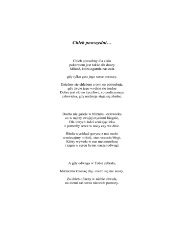 Chleb powszedni… Chleb potrzebny dla ciała pokarmem jest także dla duszy Miłość, która ogarnia nas cała gdy tylko gest jego serce poruszy. Dzielmy się chlebem z tym co potrzebuje, gdy życie jego wydaje się trudne Dobre jest słowo życzliwe, co podtrzymuje człowieka, gdy nadzieje stają się złudne. Ducha nie gaście w bliźnim –człowieku co w nędzy swojej myślami biegnie, Dla innych ludzi szukając leku z potrzeby serca w nocy czy we dnie. Bieda wyciskać gorycz z nas może wzniecajmy miłość, stan uczucia błogi, Który wywoła w nas metamorfozę i zagra w sercu hymn naszej odwagi. A gdy odwaga w Tobie zebrała, bliźniemu kromkę daj –niech się nie suszy. Za chleb ofiarny w niebie chwała, na ziemi zaś serca nieczułe poruszy.