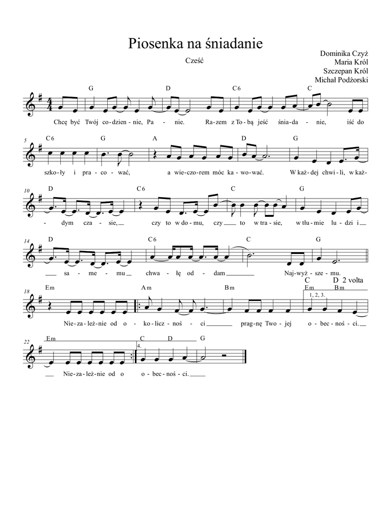 Piosenka na śniadanie Dominika Czyż Maria Król Szczepan Król Michał Podżorski Cześć ∀3 ι ι % 3 œ œ œ œœ œ œ œ œœ ˙ G D Chcę być Twój co - dzien - nie, Pa ∀ œ œ œ œ − œ œ ˙ % Ι C6 5 G szko - ły 10 % 14 % ∀ ∀ % Œ 22 Em % ∀ sie, czy to w do - mu, C6 œ me - mu chwa œ œ œ œ− œ œ - −− œι œ œ œ œ œ œ œ Em - łę od ko - licz - noś C D − œ œ œ œ œ œ œ − œ œ œ œ 4. Nie - za - leż - nie od o - ι ι œ œ œ− Am Nie - za - leż - nie od o to o - bec - noś - ci. - dam ˙ œ œ œ œ œ w tłu - mie lu - dzi i G œ œ œ ˙− Naj- wyż - sze - mu. C œ œ œ œ Em œ prag - nę Two - jej Ó œ œ œ− œ G Bm ci G ˙− iść do W każ - dej chwi - li, w każ - w tra - sie, C œ œ nie, œ œœ œ œœœ Ι Ι czy - G C Œ œ œ œ œ− œ œ œ− œ œ− œ œ− œ œ - śnia - da D C6 D sa 18 - Ra - zem z To - bą jeść a wie - czo - rem móc ka - wo - wać. œ− œ œ− œ œ− œ œ cza nie. Œ œ œ œ œ œ œ œ œ ˙− pra - co - wać, dym C œ œ œ œœ œ œ œ œœ ˙ A D - ∀ i - C6 D 2 volta Bm œ œ œ œ 1, 2, 3. o - bec - noś - ci.