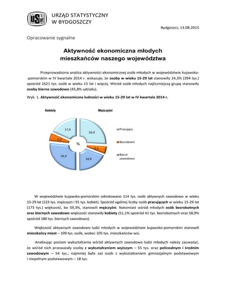 URZĄD STATYSTYCZNY W BYDGOSZCZY Bydgoszcz, 13.08.2015 Opracowanie sygnalne Aktywność ekonomiczna młodych mieszkańców naszego województwa Przeprowadzona analiza aktywności ekonomicznej osób młodych w województwie kujawsko-pomorskim w IV kwartale 2014 r. wskazuje, że osoby w wieku 15-29 lat stanowiły 24,3% (394 tys.) spośród 1621 tys. osób w wieku 15 lat i więcej. Wśród osób młodych najliczniejszą grupę stanowiły osoby bierne zawodowo (45,8% udziału). Wyk. 1. Aktywność ekonomiczna ludności w wieku 15-29 lat w IV kwartale 2014 r. Kobiety Mężczyźni Pracujący 17,9 26,0 5,3 Bezrobotni % 5,1 26,9 18,8 Bierni zawodowo W województwie kujawsko-pomorskim odnotowano 214 tys. osób aktywnych zawodowo w wieku 15-29 lat (123 tys. mężczyzn i 91 tys. kobiet). Spośród ogólnej liczby osób pracujących w wieku 15-29 lat (173 tys.) większość, bo 59,3%, stanowili mężczyźni. Natomiast wśród młodych osób bezrobotnych oraz biernych zawodowo większość stanowiły kobiety (51,1% spośród 41 tys. bezrobotnych oraz 58,9% spośród 180 tys. biernych zawodowo). Większość aktywnych zawodowo ludzi młodych w województwie kujawsko-pomorskim stanowili mieszkańcy miast – 109 tys. osób, wobec 105 tys. mieszkańców wsi. Analizując poziom wykształcenia wśród aktywnych zawodowo ludzi młodych należy zauważyć, że wśród nich przeważały osoby z wykształceniem wyższym – 55 tys. oraz policealnym i średnim zawodowym – 54 tys.; najmniej było zaś osób z wykształceniem gimnazjalnym podstawowym i niepełnym podstawowym – 18 tys. MŁODZI NA RYNKU PRACY Struktura ludzi młodych ze względu na główne źródło utrzymania jest dość charakterystyczna, ponieważ najliczniejszą grupę stanowiły wśród nich osoby pozostające na utrzymaniu (180 tys. osób). Było to aż 45,6% populacji ludzi młodych. Drugą co do liczebności grupę stanowiły osoby, których głównym źródłem utrzymania była praca najemna, czyli 143 tys. osób (tj. 36,2%). Wyk. 2. Ludność aktywna zawodowo w wieku 15-29 lat według źródła utrzymania w IV kwartale 2014 r. Praca najemna Praca we własnym gospodarstwie rolnym Praca na własny rachunek poza rolnictwem indywidualnym Renta inwalidzka 36,2 45,6 % Zasiłek dla bezrobotnych Inne świadczenie społeczne 4,5 6,9 3,0 2,5 0,8 0,5 Inne niezarobkowe źródło Pozostawanie na utrzymaniu Ponadto w województwie kujawsko-pomorskim w IV kwartale 2014 r.: ze względu na status zatrudnienia osób w wieku 15-29 lat, najliczniejszą grupą byli pracownicy najemni (150 tys.), a mężczyźni stanowili wśród nich 58,0%; najliczniejsze grupy zawodów wśród pracujących ludzi młodych stanowili pracownicy usług osobistych i sprzedawcy – 36 tys.; wśród 214 tys. aktywnych zawodowo w grupie osób w wieku 15-29 lat było 41 tys. bezrobotnych, przy czym przeważały w tej grupie kobiety (21 tys.); najniższą stopę bezrobocia odnotowano u osób z wykształceniem średnim ogólnokształcącym (15,9%), a najwyższą u osób z wykształceniem zasadniczym zawodowym (27,3%). Opracowanie merytoryczne: Kujawsko-Pomorski Ośrodek Badań Regionalnych tel. 52 36 69 303 e-mail: [email protected] Rozpowszechnianie: Karolina Hunker tel. 52 36 69 349 e-mail: [email protected] Więcej informacji m.in. na temat pracujących, bezrobotnych czy biernych zawodowo młodych osób w województwie kujawsko-pomorskim znajdą Państwo w opracowaniu sygnalnym Urzędu pn.: Młodzi w województwie kujawsko-pomorskim w 2014 r. Rynek pracy w IV kwartale 2014 r., które zostanie zamieszczone na stronie internetowej Urzędu http://bydgoszcz.stat.gov.pl/ w dniu 14 sierpnia 2015 r. 2|Strona