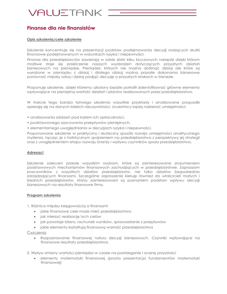 Finanse dla nie finansistów Opis szkolenia/cele szkolenie Szkolenie koncentruje się na prezentacji podstaw podejmowania decyzji rodzących skutki finansowe podejmowanych w warunkach ryzyka i niepewności. Finanse dla przedsiębiorców zawierają w sobie zbiór kilku kluczowych narzędzi dzięki którym możliwe staje się przeliczenie naszych wyobrażeń dotyczących przyszłych działań biznesowych na pieniądze. Pieniądze, których nie można dotknąć dzisiaj ale które są wyrażone w pieniądzu z dzisiaj i dlatego dzisiaj można przyszłe dokonania biznesowe porównać między sobą i dzisiaj podjąć decyzję o przyszłych krokach w biznesie. Proponuję szkolenie, dzięki któremu szkolony będzie potrafił zidentyfikować główne elementy wpływające na pieniężną wartość działań i planów realizowanych przez przedsiębiorstwo. W trakcie tego bardzo łatwego szkolenia wszystkie przykłady i analizowane przypadki opierają się na danych bliskich rzeczywistości. Uczestnicy będą nabierać umiejętności: • analizowania zdarzeń pod kątem ich opłacalności, • podstawowego szacowania przepływów pieniężnych, • elementarnego uwzględniania w decyzjach ryzyka i niepewności. Proponowane szkolenie w praktyczny i skuteczny sposób rozwija umiejętności analitycznego myślenia, łącząc je z holistycznym spojrzeniem na przedsiębiorstwo z perspektywy jej strategii oraz z uwzględnieniem etapu rozwoju branży i wpływu czynników spoza przedsiębiorstwa. Adresaci Szkolenie zalecam przede wszystkim osobom, które są zainteresowane zrozumieniem podstawowych mechanizmów finansowych zachodzących w przedsiębiorstwie. Zapraszam pracowników z wszystkich działów przedsiębiorstw, nie tylko działów bezpośrednio zarządzających finansami. Szczególne zaproszenie kieruję również do właścicieli małych i średnich przedsiębiorstw, którzy zainteresowani są poznaniem podstaw wpływu decyzji biznesowych na rezultaty finansowe firmy. Program szkolenia 1. Różnica między księgowością a finansami jakie finansowe cele może mieć przedsiębiorstwo jak mierzyć realizację tych celów jak powstaje bilans, rachunek wyników, sprawozdanie z przepływów jakie elementy kształtują finansową wartość przedsiębiorstwa Ćwiczenia Rozpoznawanie finansowej natury decyzji biznesowych. Czynniki wpływające na finansowe rezultaty przedsiębiorstwa. 2. Wpływ zmiany wartości pieniądza w czasie na postrzeganie i ocenę przyszłości elementy matematyki finansowej (prosta prezentacja fundamentów matematyki finansowej) dlaczego wartość pieniądza w czasie zmienia się niezależnie od tego czy jest deflacja czy inflacja jak porównywać kwoty z różnych momentów czasowych Ćwiczenia Przeliczanie kwot z przyszłości na mierzalne w pieniądzu na dzień dzisiejszy. 3. Ocena przyszłych działań przedsiębiorstwa oparta o kryteria decyzyjne jak stosować okres zwrotu, poprawiony (zdyskontowany) okres zwrotu, NPV, IRR jak interpretować kryteria decyzyjne kiedy nie stosować IRR Ćwiczenia Na podstawie danych liczbowych wyznaczanie i interpretacja kryteriów decyzyjnych 4. Podstawowe informacje o wolnych przepływach pieniężnych wypracowywanych przez przedsiębiorstwo zasady prawidłowego szacowania wolnych przepływów pieniężnych jakich parametrów pieniężnych różnica między NCF (przepływy pieniężne netto), OCF (operacyjne przepływy pieniężne) i FCF (wolne przepływy pieniężne), jak je rozróżnić i do jakich celów właściwe wybrać nie bierzemy pod uwagę przy szacowaniu przepływów Ćwiczenia Podstawowe przykłady pokazujące sposób szacowania przepływów pieniężnych. 5. Aktywa bieżące (aktywa płynne) przegląd podstawowych elementów zarządzania zapasami, środkami pieniężnymi i należnościami jak zarządzać zapasami jakie poziomy należności utrzymywać ile gotówki powinna mieć firma
