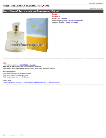 Informacje o produkcie Utworzono 07-03-2017 Fenzi Sea of Sun - woda perfumowana 100 ml Cena : 24,00 zł Producent : Fenzi Stan magazynowy : bardzo wysoki Średnia ocena : brak recenzji Rodzina zapachowa: KWIATOWE - damskie Fenzi Sea of Sun to kwiatowo - wodne perfumy dla kobiet. W kompozycji dominują zmysłowe aromaty, które podkreślają wrażliwość kobiety. Piramida zapachu: - Nuta głowy: mandarynka, mango i gruszka - Nuta serca: fiołek, orchidea i konwalia - Nuta podstawowa: piżmo i nuty drzewne Zobacz także : Gabriela Sabatini [damskie] Linia Gabriela Sabatini Ocean Sun Wygenerowano w programie www.oscGold.com Gabriela Sabatini