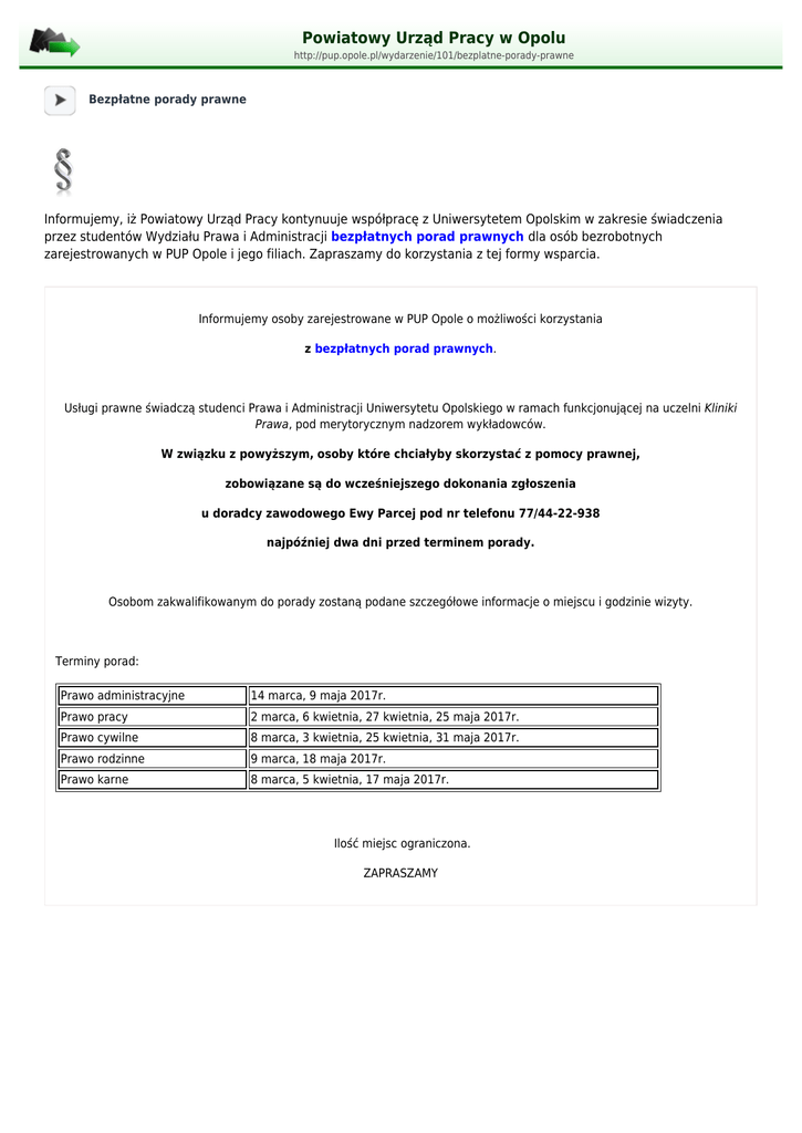 Powiatowy Urząd Pracy w Opolu http://pup.opole.pl/wydarzenie/101/bezplatne-porady-prawne Bezpłatne porady prawne Informujemy, iż Powiatowy Urząd Pracy kontynuuje współpracę z Uniwersytetem Opolskim w zakresie świadczenia przez studentów Wydziału Prawa i Administracji bezpłatnych porad prawnych dla osób bezrobotnych zarejestrowanych w PUP Opole i jego filiach. Zapraszamy do korzystania z tej formy wsparcia. Informujemy osoby zarejestrowane w PUP Opole o możliwości korzystania z bezpłatnych porad prawnych. Usługi prawne świadczą studenci Prawa i Administracji Uniwersytetu Opolskiego w ramach funkcjonującej na uczelni Kliniki Prawa, pod merytorycznym nadzorem wykładowców. W związku z powyższym, osoby które chciałyby skorzystać z pomocy prawnej, zobowiązane są do wcześniejszego dokonania zgłoszenia u doradcy zawodowego Ewy Parcej pod nr telefonu 77/44-22-938 najpóźniej dwa dni przed terminem porady. Osobom zakwalifikowanym do porady zostaną podane szczegółowe informacje o miejscu i godzinie wizyty. Terminy porad: Prawo administracyjne 14 marca, 9 maja 2017r. Prawo pracy 2 marca, 6 kwietnia, 27 kwietnia, 25 maja 2017r. Prawo cywilne 8 marca, 3 kwietnia, 25 kwietnia, 31 maja 2017r. Prawo rodzinne 9 marca, 18 maja 2017r. Prawo karne 8 marca, 5 kwietnia, 17 maja 2017r. Ilość miejsc ograniczona. ZAPRASZAMY