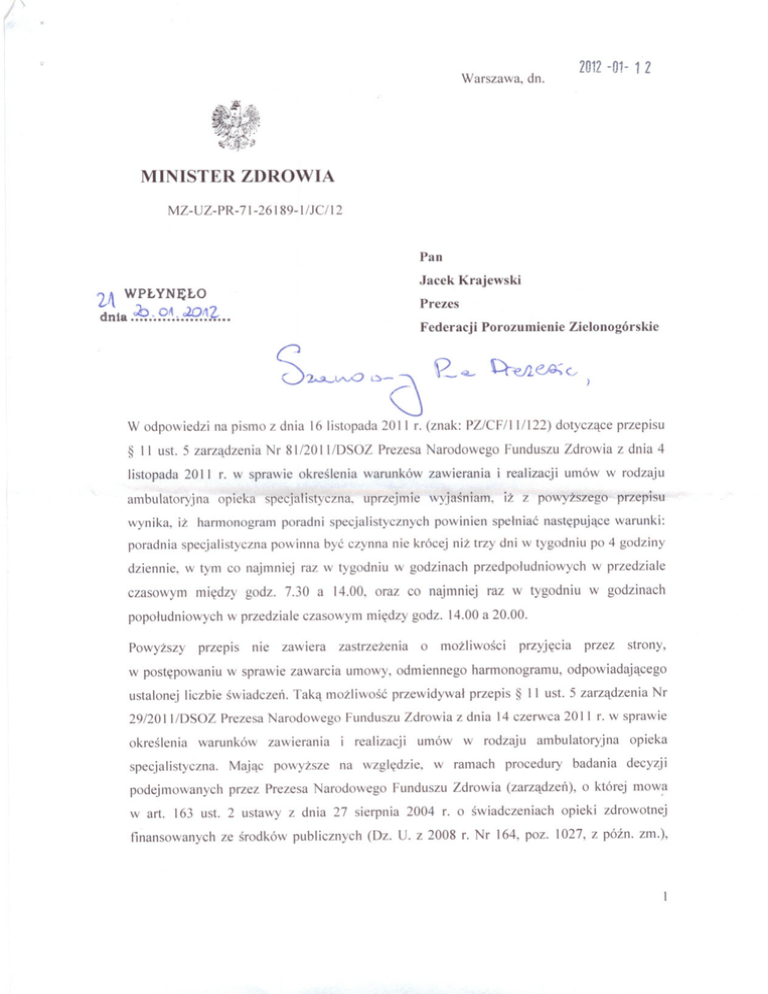 2012 -01- 1 Z Warszawa, dn. MINISTER ZDROWIA MZ-UZ-PR-71-26189-I/JC/12 Pan Jacek Krajewski '2A WPL YNELO Prezes dnia .~.·.9.~~.c?Q'~k ... Federacji S2..>o..-lA-O 0- (j 2..~ W odpowiedzi na pismo z dnia 16 listopada 20 II r. (znak: § II ust. 5 zarzadzenia Nr Porozumienie Cl-Vl e,g.; (.. ) opieka specjalistyczna. wynika, iz harmonogram poradnia specjalistyczna uprzejmie Funduszu Zdrowia z dnia 4 i realizacji listopada 20 II r. w sprawie okreslenia warunków zawierania ambulatoryjna wyjasniam, poradni specjalistycznych dotyczace przepisu PZ/CF/III122) Prezesa Narodowego 81/2011/DSOZ Zielonogórskie umów w rodzaju iz z powyzszego przepisu powinien spelniac nastepujace warunki: powinna byc czynna nie krócej niz trzy dni w tygodniu po 4 godziny dziennie, w tym co najmniej raz w tygodniu w godzinach przedpoludniowych w przedziale czasowym w godzinach miedzy godz. 7.30 a 14.00, oraz co najmniej popoludniowych Powyzszy w przedziale czasowym miedzy godz. 14.00 a 20.00. przepis w postepowaniu raz w tygodniu nie zawiera zastrzezenia o mozliwosci w sprawie zawarcia umowy, odmiennego przyjecia harmonogramu, przez strony, odpowiadajacego ustalonej liczbie swiadczei1. Taka mozliwosc przewidywal przepis § II ust. 5 zarzadzenia Nr 29/20 II/DSOZ okreslenia Prezesa Narodowego warunków zawierania i realizacji specjalistyczna. Majac podejmowanych przez Prezesa Narodowego wart. powyzsze Funduszu Zdrowia z dnia 14 czerwca 20 II r. w sprawie umów na wzgledzie, w rodzaju w ramach ambulatoryjna procedury ze srodków publicznych decyzji Funduszu Zdrowia (zarzadzei1), o której mow~ 163 ust. 2 ustawy z dnia 27 sierpnia 2004 r. o swiadczeniach finansowanych badania opieka opieki zdrowotnej (Dz. U. z 2008 r. Nr 164, poz. 1027, z pózno zm.), Minister Zdrowia wystapil do Prezesa Funduszu o przedstawienie stosownych wyjasnien w sprawie. Zgodnie z brzmieniem § 11 ust. 5 zarzadzenia Nr 81/2011/DSQZ, warunek czasu pracy poradni (minimalny warunek) bedzie obowiazywal wszystkich swiadczeniodawców w 2012 roku. Umowy o udzielanie swiadczen opieki zdrowotnej w rodzaju ambulatoryjna opieka specjalistyczna zawieraja liczbe i cene jednostek rozliczeniowych (punktu) oraz kwote zobowiazania, a nie liczbe swiadczen, w zwiazku z czym liczba swiadczen nie moglaby stanowic kryterium dla zmniejszenia wymiaru czasu pracy poradni. W nastepstwie nowego brzmienia przepisu § 11 ust. 5, organizacja pracy poradni powinna spelniac wymagany, wskazany w ww. zarzadzeniu warunek. Jako uzasadnienie eliminacji dotychczasowej mozliwosci okreslania odmiennego harmonogramu pracy poradni specjalistycznych wskazano koniecznosc zagwarantowania swiadczeniobiorcom minimalnego (12-godzinnego) dostepu do poradni specjalistycznych, rodzaju wykonywanej w poprzednich niezaleznie pracy od regionu kraju przez nich zamieszkanego, (praca zmianowa). latach, w prowadzonych Jednoczesnie, postepowaniach analogicznie konkursowych, czy jak premIOwane sa poradnie oferujace dluzszy niz minimalny czas pracy poradni. Nalezy podkreslic, iz instrumenty ingerencji Ministra Zdrowia w tresc zarzadzen Prezesa Narodowego Funduszu Zdrowia, realizowane w ramach sprawowanego nadzoru, okreslone sa w art. 163 ustawy o swiadczeniach opieki zdrowotnej finansowanych ze srodków publicznych. Zgodnie z tym przepisem, Minister Zdrowia bada decyzje podejmowane przez Prezesa Funduszu i stwierdza niewaznosc decyzji w calosci lub w czesci, w przypadku gdy: l) narusza ona prawo lub 2) prowadzi do niewlasciwego zabezpieczenia swiadczen opieki zdrowotnej lub 3) prowadzi do niezrównowazenia przychodów i kosztów Funduszu. Zgodnie natomiast z art. 165 ust. 3 ww. ustawy, przeslanka wydania zalecen Prezesowi Funduszu jest ustalenie, iz jego dzialalnosc narusza prawo lub interes swiadczeniobiorców. Naruszenie interesu swiadczeniobiorców oraz niewlasciwe zabezpieczenie swiadczen opieki zdrowotnej moga byc zatem podstawa do zastosowania przez Ministra Zdrowia instrumentów nadzoru. Przeslanki te jednakze powinny miec wymierny i rzeczywisty charakter, a przede wszystkim rozstrzygniecia nadzorcze faktycznym. Do postepowania bowiem przepisy Kodeksu powinny byc wydawane w jednoznacznym stanie przed Ministrem Zdrowia w zakresie nadzoru stosuje sie postepowania administracyjnego (art. 181 ust. 1 ustawy o swiadczeniach opieki zdrowotnej finansowanych ze srodków publicznych), a przepisy te wymagaja oparcia rozstrzygniecia w postaci decyzji administracyjnej na odpowiednim 2 materiale dowodowym. Tymczasem Minister Zdrowia nie posiada informacji, azeby interes swiadczeniobiorców byl naruszony kwestionowanym przepisem zarzadzenia, a takze azeby wskutek ww. brzmienia przepisu, zagrozone bylo zabezpieczenie dostepu do swiadczen. W przypadku zakontraktowania swiadczen w rodzaju ambulatoryjna opieka specjalistyczna ze swiadczeniodawcami spelniajacymi wskazany o zmniejszeniu dostepnosci do swiadczen. wymóg, nie bedzie mozna mówic 2 Jakuh Szulr 3