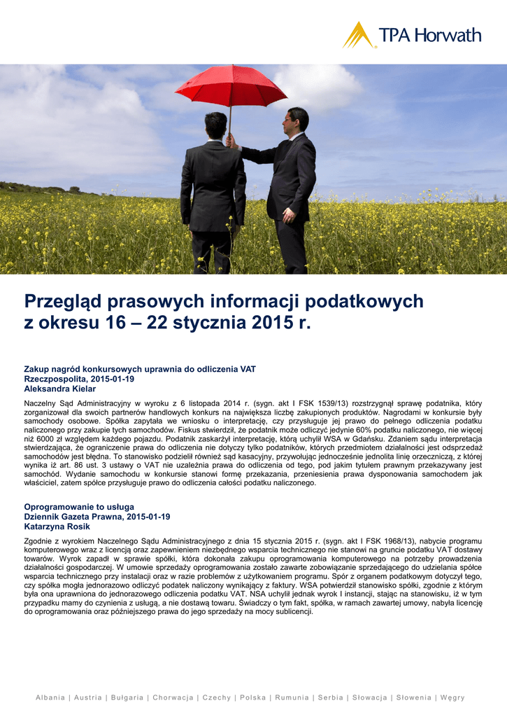 Przegląd prasowych informacji podatkowych z okresu 16 – 22 stycznia 2015 r. Zakup nagród konkursowych uprawnia do odliczenia VAT Rzeczpospolita, 2015-01-19 Aleksandra Kielar Naczelny Sąd Administracyjny w wyroku z 6 listopada 2014 r. (sygn. akt I FSK 1539/13) rozstrzygnął sprawę podatnika, który zorganizował dla swoich partnerów handlowych konkurs na największa liczbę zakupionych produktów. Nagrodami w konkursie były samochody osobowe. Spółka zapytała we wniosku o interpretację, czy przysługuje jej prawo do pełnego odliczenia podatku naliczonego przy zakupie tych samochodów. Fiskus stwierdził, że podatnik może odliczyć jedynie 60% podatku naliczonego, nie więcej niż 6000 zł względem każdego pojazdu. Podatnik zaskarżył interpretację, którą uchylił WSA w Gdańsku. Zdaniem sądu interpretacja stwierdzająca, że ograniczenie prawa do odliczenia nie dotyczy tylko podatników, których przedmiotem działalności jest odsprzedaż samochodów jest błędna. To stanowisko podzielił również sąd kasacyjny, przywołując jednocześnie jednolita linię orzeczniczą, z której wynika iż art. 86 ust. 3 ustawy o VAT nie uzależnia prawa do odliczenia od tego, pod jakim tytułem prawnym przekazywany jest samochód. Wydanie samochodu w konkursie stanowi formę przekazania, przeniesienia prawa dysponowania samochodem jak właściciel, zatem spółce przysługuje prawo do odliczenia całości podatku naliczonego. Oprogramowanie to usługa Dziennik Gazeta Prawna, 2015-01-19 Katarzyna Rosik Zgodnie z wyrokiem Naczelnego Sądu Administracyjnego z dnia 15 stycznia 2015 r. (sygn. akt I FSK 1968/13), nabycie programu komputerowego wraz z licencją oraz zapewnieniem niezbędnego wsparcia technicznego nie stanowi na gruncie podatku VAT dostawy towarów. Wyrok zapadł w sprawie spółki, która dokonała zakupu oprogramowania komputerowego na potrzeby prowadzenia działalności gospodarczej. W umowie sprzedaży oprogramowania zostało zawarte zobowiązanie sprzedającego do udzielania spółce wsparcia technicznego przy instalacji oraz w razie problemów z użytkowaniem programu. Spór z organem podatkowym dotyczył tego, czy spółka mogła jednorazowo odliczyć podatek naliczony wynikający z faktury. WSA potwierdził stanowisko spółki, zgodnie z którym była ona uprawniona do jednorazowego odliczenia podatku VAT. NSA uchylił jednak wyrok I instancji, stając na stanowisku, iż w tym przypadku mamy do czynienia z usługą, a nie dostawą towaru. Świadczy o tym fakt, spółka, w ramach zawartej umowy, nabyła licencję do oprogramowania oraz późniejszego prawa do jego sprzedaży na mocy sublicencji. Albania | Austria | Bułgaria | Chorwacja | Czechy | Polska | Rumunia | Serbia | Słowacja | Słowenia | Węgry Nie każda wpłata przed dostawą towaru to zaliczka Dziennik Gazeta Prawna, 2015-01-20 Lidia Jarmołowicz Zgodnie z wyrokiem WSA w Gliwicach z dnia 5 listopada 2014 r. (sygn. akt III SA/Gl 894/14) omyłkowe dokonanie przelewu na konto złotówkowe zamiast na konto walutowe nie stanowi zdarzenia gospodarczego. Sprawa dotyczyła spółki, która miała otrzymać na rachunek walutowy przedpłatę całości ceny wyrażonej w euro, jednakże w wyniku błędu kontrahenta środki pieniężne zostały przelane na rachunek złotówkowy. Obie strony umowy, po stwierdzeniu omyłki, złożyły w banku reklamację oraz wniosek o przekazanie całej kwoty w euro na rachunek walutowy spółki lub o zwrot na rachunek bankowy kontrahenta. Organ podatkowy uznał jednak, że ani przewalutowanie otrzymanej kwoty ani złożenie reklamacji w banku nie są podstawą do uznania, że otrzymana kwota nie była w istocie zaliczką. WSA orzekł jednak, że mylne przelanie umownej kwoty nie stanowi zdarzenia gospodarczego. WSA wskazał na fakt, iż obie strony umowy nie uznały przedmiotowej kwoty za zaliczkę, ponieważ miała ona być przekazana w euro, a nie w złotych. Brak umowy nie wyklucza kosztów Rzeczpospolita, 2015-01-20 Mateusz Maj Zgodnie z wyrokiem z dnia 9 stycznia 2015 r. przez Wojewódzki Sąd Administracyjny w Warszawie (sygn. akt III SA/Wa 1693/14), inwestor może zaliczyć do kosztów uzyskania przychodu wynagrodzenie podwykonawcy, który nie otrzymał należności od firmy, która zaangażowała go w budowę. Spór dotyczył inwestora, który na podstawie przepisów kodeksu cywilnego, ponosi solidarną odpowiedzialność z wykonawcą za wypłatę wynagrodzenia należnego podwykonawcy z tytułu świadczonych usług. Sąd Apelacyjny zasądził na rzecz podwykonawcy kwoty z wystawionych przez niego faktur wraz z należnymi odsetkami, które po zawarciu dodatkowego porozumienia z inwestorem ustalono na ok. 2,7 mln zł. Inwestor we wniosku o interpretację indywidualną zapytał, czy kwoty te mogą stanowić u niego koszt uzyskania przychodu. Dyrektor Izby Skarbowej stwierdził, że inwestora nie łączyła z podwykonawcą żadna umowa, a ponadto, ze względu na łańcuch podmiotów uczestniczących w inwestycji, istnieje obawa dwukrotnego rozliczenia tego kosztu. W konsekwencji podatnik nie jest uprawniony do zaliczenia do kosztów podatkowych wydatków na wynagrodzenie i odsetki za zwłokę należne dalszemu podwykonawcy, ponoszonych z tytułu odpowiedzialności solidarnej. Sprawa trafiła do sądu, który uchylił zaskarżoną interpretację twierdząc, że taki wydatek ma związek z przychodem, nie jest wyłączony z katalogu kosztów oraz wynika z ustawy i w związku z tym może zostać zaliczony do kosztów uzyskania przychodu. Pieniądze wydane na spółkę celową dają korzyści Rzeczpospolita, 2015-01-21 Konrad Filip Turzyński Naczelny Sąd Administracyjny w wyroku z 2 grudnia 2014 r. (sygn. akt II FSK 2725/12) stwierdził, że podatnik może zaliczyć do kosztów uzyskania przychodu wydatki poniesione na nabycie usług poprzedzających utworzenie nowego podmiotu. Sprawa dotyczyła spółki z branży górniczej, która tworzyła spółki prawa handlowego w celu p