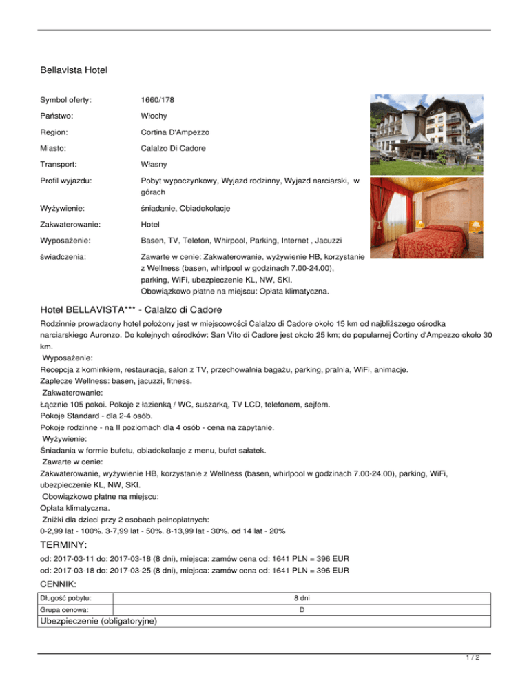Bellavista Hotel Symbol oferty: 1660/178 Państwo: Włochy Region: Cortina D'Ampezzo Miasto: Calalzo Di Cadore Transport: Własny Profil wyjazdu: Pobyt wypoczynkowy, Wyjazd rodzinny, Wyjazd narciarski, w Wyżywienie: śniadanie, Obiadokolacje Zakwaterowanie: Hotel Wyposażenie: Basen, TV, Telefon, Whirpool, Parking, Internet , Jacuzzi świadczenia: Zawarte w cenie: Zakwaterowanie, wyżywienie HB, korzystanie górach z Wellness (basen, whirlpool w godzinach 7.00-24.00), parking, WiFi, ubezpieczenie KL, NW, SKI. Obowiązkowo płatne na miejscu: Opłata klimatyczna. Hotel BELLAVISTA*** - Calalzo di Cadore Rodzinnie prowadzony hotel położony jest w miejscowości Calalzo di Cadore około 15 km od najbliższego ośrodka narciarskiego Auronzo. Do kolejnych ośrodków: San Vito di Cadore jest około 25 km; do popularnej Cortiny d'Ampezzo około 30 km. Wyposażenie: Recepcja z kominkiem, restauracja, salon z TV, przechowalnia bagażu, parking, pralnia, WiFi, animacje. Zaplecze Wellness: basen, jacuzzi, fitness. Zakwaterowanie: Łącznie 105 pokoi. Pokoje z łazienką / WC, suszarką, TV LCD, telefonem, sejfem. Pokoje Standard - dla 2-4 osób. Pokoje rodzinne - na II poziomach dla 4 osób - cena na zapytanie. Wyżywienie: Śniadania w formie bufetu, obiadokolacje z menu, bufet sałatek. Zawarte w cenie: Zakwaterowanie, wyżywienie HB, korzystanie z Wellness (basen, whirlpool w godzinach 7.00-24.00), parking, WiFi, ubezpieczenie KL, NW, SKI. Obowiązkowo płatne na miejscu: Opłata klimatyczna. Zniżki dla dzieci przy 2 osobach pełnopłatnych: 0-2,99 lat - 100%. 3-7,99 lat - 50%. 8-13,99 lat - 30%. od 14 lat - 20% TERMINY: od: 2017-03-11 do: 2017-03-18 (8 dni), miejsca: zamów cena od: 1641 PLN = 396 EUR od: 2017-03-18 do: 2017-03-25 (8 dni), miejsca: zamów cena od: 1641 PLN = 396 EUR CENNIK: Długość pobytu: 8 dni Grupa cenowa: D Ubezpieczenie (obligatoryjne) 1/2 (*) Ubezpieczenie KL, NW, SKI 14 (*) Turystyczny Fundusz Gwarancyjny Pobyt w obiekcie (do wyboru) 2.5 (*) Pokój Standard standardowo dla osób: 4 minimalnie: 2 Rodzaj osoby (do wyboru) Dziecko 0-2 Dziecko 3-7 (*) Osoba dorosła 3 lub 4 osoba dorosła na dostawce Dziecko 8-13 lat (-) (-) 191 382 306 267 Waluta: EUR Aktualne ceny z systemu S.A.R.T. (-) - cena usługi, podatku kalkulowana przy osobie lub gratis (*) - kwota wliczona w cenę standardową 2/2