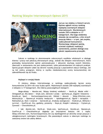 Ranking Sklepów Internetowych Opineo 2015 Już po raz siódmy w historii serwis Opineo ogłosił roczny ranking najlepiej ocenianych sklepów internetowych. Wyróżnionych zostało 250 e-sklepów w 17 kategoriach. Dla kogo siódemka okazała się szczęśliwa, a kto stracił pozycję lidera — o tym, jak zwykle, zadecydowali konsumenci. Wystawiając sklepowi opinię, oceniali szybkość realizacji zamówienia, poziom obsługi oraz jakość zapakowania przesyłki. Sukces w rankingu to ukoronowanie całorocznych wysiłków włożonych w obsługę klienta i pracę nad jakością oferowanych usług. Jednak dla sklepów internetowych, które gromadzą konsumenckie opinie potransakcyjne i aktywnie słuchają swoich klientów, obecność w zestawieniu nie jest zaskoczeniem, tylko potwierdzeniem ich dobrych praktyk. Sporej grupie sklepów udało się obronić wysoką pozycję z poprzednich edycji rankingu, ale są też wielcy przegrani, którzy w wyniku niedostatecznej oceny konsumenckiej nie zakwalifikowali się do finału. Najlepsi w swojej klasie O miejscu sklepu internetowego w rankingu zadecydowały łączne oceny konsumenckie za 2014 rok oraz liczba opinii. Wyłonionych zostało 250 najlepiej ocenianych e-sklepów w 17 kategoriach. Oto liderzy poszczególnych kategorii: Mega-sklepy — Morele.net, Sklepy średniej wielkości — North.pl, Młode wilki — Omegasoft.pl, Dla dzieci — Smyk.com, Zdrowie i uroda — Iperfumy.pl, Zegarki i biżuteria — Korallo.pl, Sport — Hurtowniasportowa.net, Odzież i obuwie — Sklep.Wittchen.com, Motoryzacja — Oponeo.pl Artykuły medyczne — Aptekagemini.pl, Ogród i narzędzia — Rolmarket.pl, Dom i wnętrze — Garneczki.pl, Artykuły zoologiczne — Krakvet.pl, Militaria i survival — GunFire.pl, Gry, gadżety, prezenty — Keye.pl, Książki i edukacja — Czytam.pl, Żywność — Chocolissimo.pl. I tak: Morele.net, North.pl, Smyk.com, Iperfumy.pl, Korallo.pl, Oponeo.pl, GunFire.pl i Chocolissimo.pl sięgnęły po zwycięstwo kolejny rok z rzędu. Sklep.wittchen.com, Hurtowniasportowa.net czy Aptekagemini.pl obroniły swoje pozycje z ubiegłorocznych rankingów branżowych. Dla pozostałych sukces w obecnym rankingu to zasłużony awans lub udany debiut. Najwięksi w zestawieniu W sporcie obowiązuje zasada: im większy gracz, tym więcej musi udowadniać. Nie inaczej jest w lidze Mega-sklepów. To szczególna kategoria, bo stanowią ją weterani internetowego biznesu. To sklepy sprawdzone przez miliony: działają od wielu lat, od dawna gromadzą opinie, obsługują mnóstwo klientów i realizują tysiące zamówień. Oferują przebogaty asortyment: od komputerów, sprzętu AGD/RTV i foto, po multimedia, rozrywkę i kulturę. Jak co roku, zestawienie Mega-sklepów budzi najwięcej emocji. Tym razem, żeby dostać się do finału, Mega-sklepy musiały spełnić następujące warunki: łączna ocena nie mogła być niższa niż 11,0 pkt, ocena za ubiegły rok — powyżej 8,0, liczba opinii zgromadzonych w 2014 r. musiała wynosić powyżej 2000, a liczba opinii w całej historii istnienia w Opineo — powyżej 10.000. W efekcie powstało zestawienie dziesięciu najmocniejszych graczy: Obsługa ważniejsza niż cena Ale jeśli chodzi o ranking — wielkość nie ma znaczenia. Paweł Kucharzak, prezes zarządu Opineo przekonuje: — Laury zdobywają sprzedawcy najlepiej oceniani przez klientów, bez względu na wielkość, obroty czy zasięg działania. Dlatego na uwagę zasługuje każdy z 250 wyróżnionych e-sklepów. Wszystkie one udowadniają, że zwrot z inwestycji w obsługę klienta i Customer Experience w branży e-commerce jest zarówno możliwy, jak i satysfakcjonujący. W ubiegłym roku konsumenci wystawili 1.080.418 opinii o sklepach internetowych. To niemal cztery razy więcej niż w 2010 r. i ponad 43 razy więcej niż 2007 roku. Rośnie już nie tylko liczba osób kupujących Internecie, ale też świadomość samych klientów, którzy rozumieją, że wystawiając sklepowi opinię, mogą aktywnie uczestniczyć w rozwoju rynku e-commerce w Polsce. Jak wynika z analizy treści ubiegłorocznych opinii o sklepach internetowych — najczęściej komentowaną i ocenianą przez konsumentów kwestią była „obsługa klienta” (ten temat został poruszony 404 704 razy). Nieco mniej, bo jedna trzecia opinii, dotyczyła „kontaktu” (340 405 razy), a w zaledwie jednej czwartej wszystkich opinii poruszany został temat „cen” oferowanych przez sklep internetowy (275 561). Cena zresztą przestaje być czynnikiem warunkującym zakupy w danym sklepie internetowym. Dużo ważniejsze są: profesjonalna obsługa, szybka wysyłka i szybkie płatności: „Najszybszy sklep internetowy, jaki znam. Z szybszą dostawą się jeszcze nie spotkałam, a przy okazji, wspaniałe produkty, dobrze zabezpieczone w paczce i dobry kontakt. Robię tu duże zakupy co najmniej raz w miesiącu. Polecam”* 1— pisze Domi w opinii o sklepie z listopada 2014. „Bardzo dobry sklep z profesjonalnym podejściem do klienta. Świetna opcja livechatu, w razie jakiegokolwiek problemu wszystko rozwiązane momentalnie. Towar super jakości w pełni spełniający moje oczekiwania. Na pewno dokonam tam jeszcze zakupów. Dodatkowym plusem jest, że sklep współpracuje z programem PAYBACK”* — ocenia zakupy w innym sklepie Wiewioor1 (sierpień 2014). Dane Opineo wskazują, że 40% sklepów internetowych ocenionych przez klientów przynajmniej raz otrzymało od nich negatywną opinię. Najniższe oceny sklepy uzyskują za „jakość pakowania przesyłek”, najwyższe — za „szybkość realizacji zamówienia”. — Każda opinia jest czyjąś historią zakupową z dobrym lub złym zakończeniem. Każda jest dla sklepu cenną lekcją i wskazówką. Dlatego dopóki sklepy będą chciały zbierać opinie i słuchać swoich klientów, będę spokojny o przyszłość polskiego e-commerce — podsumowuje Paweł Kucharzak. Pełen ranking Opineo dostępny jest na stro