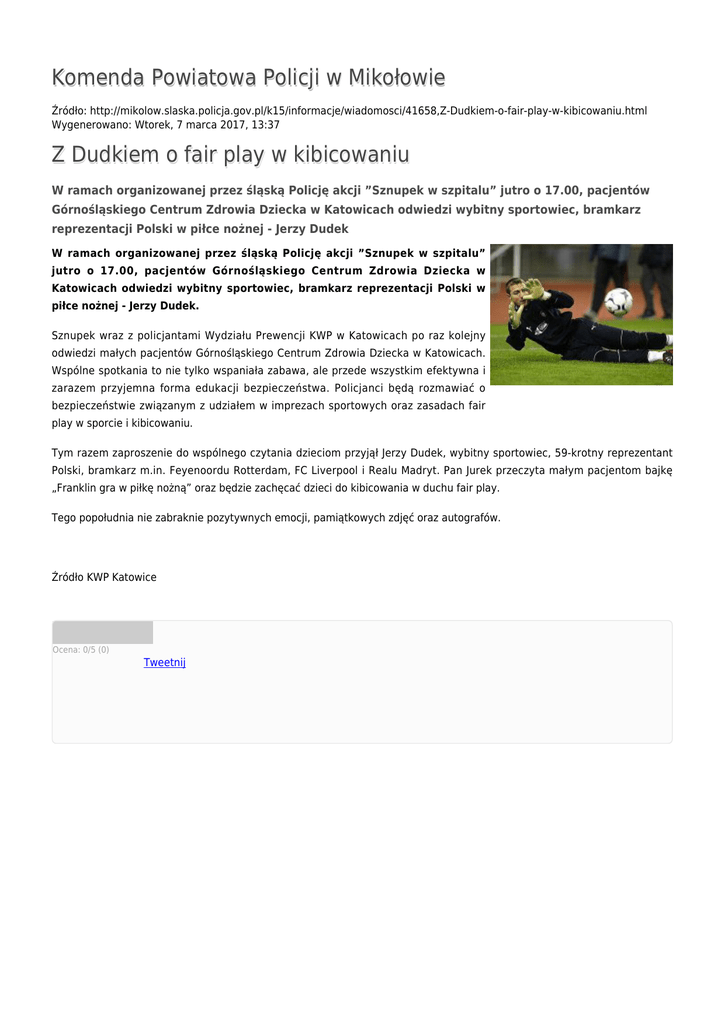 Komenda Powiatowa Policji w Mikołowie Źródło: http://mikolow.slaska.policja.gov.pl/k15/informacje/wiadomosci/41658,Z-Dudkiem-o-fair-play-w-kibicowaniu.html Wygenerowano: Wtorek, 7 marca 2017, 13:37 Z Dudkiem o fair play w kibicowaniu W ramach organizowanej przez śląską Policję akcji ”Sznupek w szpitalu” jutro o 17.00, pacjentów Górnośląskiego Centrum Zdrowia Dziecka w Katowicach odwiedzi wybitny sportowiec, bramkarz reprezentacji Polski w piłce nożnej - Jerzy Dudek W ramach organizowanej przez śląską Policję akcji ”Sznupek w szpitalu” jutro o 17.00, pacjentów Górnośląskiego Centrum Zdrowia Dziecka w Katowicach odwiedzi wybitny sportowiec, bramkarz reprezentacji Polski w piłce nożnej - Jerzy Dudek. Sznupek wraz z policjantami Wydziału Prewencji KWP w Katowicach po raz kolejny odwiedzi małych pacjentów Górnośląskiego Centrum Zdrowia Dziecka w Katowicach. Wspólne spotkania to nie tylko wspaniała zabawa, ale przede wszystkim efektywna i zarazem przyjemna forma edukacji bezpieczeństwa. Policjanci będą rozmawiać o bezpieczeństwie związanym z udziałem w imprezach sportowych oraz zasadach fair play w sporcie i kibicowaniu. Tym razem zaproszenie do wspólnego czytania dzieciom przyjął Jerzy Dudek, wybitny sportowiec, 59-krotny reprezentant Polski, bramkarz m.in. Feyenoordu Rotterdam, FC Liverpool i Realu Madryt. Pan Jurek przeczyta małym pacjentom bajkę „Franklin gra w piłkę nożną” oraz będzie zachęcać dzieci do kibicowania w duchu fair play. Tego popołudnia nie zabraknie pozytywnych emocji, pamiątkowych zdjęć oraz autografów. Źródło KWP Katowice Ocena: 0/5 (0) Tweetnij
