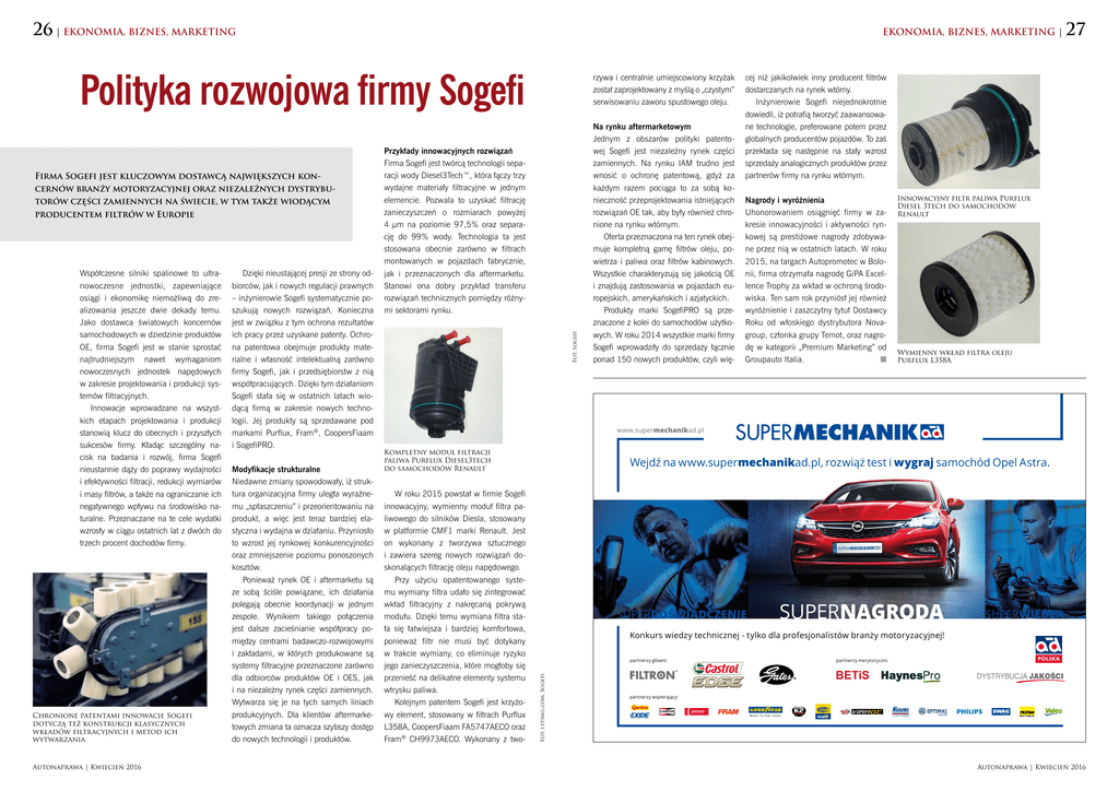 26 | EKONOMIA, BIZNES, MARKETING EKONOMIA, BIZNES, MARKETING | Polityka rozwojowa firmy Sogefi Chronione patentami innowacje Sogefi dotyczą też konstrukcji klasycznych wkładów filtracyjnych i metod ich wytwarzania Autonaprawa | Kwiecień 2016 Dzięki nieustającej presji ze strony od biorców, jak i nowych regulacji prawnych – inżynierowie Sogefi systematycznie po szukują nowych rozwiązań. Konieczna jest w związku z tym ochrona rezultatów ich pracy przez uzyskane patenty. Ochro na patentowa obejmuje produkty mate rialne i własność intelektualną zarówno firmy Sogefi, jak i przedsiębiorstw z nią współpracujących. Dzięki tym działaniom Sogefi stała się w ostatnich latach wio dącą firmą w zakresie nowych techno logii. Jej produkty są sprzedawane pod markami Purflux, Fram®, CoopersFiaam i SogefiPRO. Modyfikacje strukturalne Niedawne zmiany spowodowały, iż struk tura organizacyjna firmy uległa wyraźne mu „spłaszczeniu” i przeorientowaniu na produkt, a więc jest teraz bardziej ela styczna i wydajna w działaniu. Przyniosło to wzrost jej rynkowej konkurencyjności oraz zmniejszenie poziomu ponoszonych kosztów. Ponieważ rynek OE i aftermarketu są ze sobą ściśle powiązane, ich działania polegają obecnie koordynacji w jednym zespole. Wynikiem takiego połączenia jest dalsze zacieśnianie współpracy po między centrami badawczo-rozwojowymi i zakładami, w których produkowane są systemy filtracyjne przeznaczone zarówno dla odbiorców produktów OE i OES, jak i na niezależny rynek części zamiennych. Wytwarza się je na tych samych liniach produkcyjnych. Dla klientów aftermarke towych zmiana ta oznacza szybszy dostęp do nowych technologii i produktów. Fot. Sogefi Współczesne silniki spalinowe to ultra nowoczesne jednostki, zapewniające osiągi i ekonomikę niemożliwą do zre alizowania jeszcze dwie dekady temu. Jako dostawca światowych koncernów samochodowych w dziedzinie produktów OE, firma Sogefi jest w stanie sprostać najtrudniejszym nawet wymaganiom nowoczesnych jednostek napędowych w zakresie projektowania i produkcji sys temów filtracyjnych. Innowacje wprowadzane na wszyst kich etapach projektowania i produkcji stanowią klucz do obecnych i przyszłych sukcesów firmy. Kładąc szczególny na cisk na badania i rozwój, firma Sogefi nieustannie dąży do poprawy wydajności i efektywności filtracji, redukcji wymiarów i masy filtrów, a także na ograniczanie ich negatywnego wpływu na środowisko na turalne. Przeznaczane na te cele wydatki wzrosły w ciągu ostatnich lat z dwóch do trzech procent dochodów firmy. Przykłady innowacyjnych rozwiązań Firma Sogefi jest twórcą technologii sepa racji wody Diesel3Tech™, która łączy trzy wydajne materiały filtracyjne w jednym elemencie. Pozwala to uzyskać filtrację zanieczyszczeń o rozmiarach powyżej 4 μm na poziomie 97,5% oraz separa cję do 99% wody. Technologia ta jest stosowana obecnie zarówno w filtrach montowanych w pojazdach fabrycznie, jak i przeznaczonych dla aftermarketu. Stanowi ona dobry przykład transferu rozwiązań technicznych pomiędzy różny mi sektorami rynku. Na rynku aftermarketowym Jednym z obszarów polityki patento wej Sogefi jest niezależny rynek części zamiennych. Na rynku IAM trudno jest wnosić o ochronę patentową, gdyż za każdym razem pociąga to za sobą ko nieczność przeprojektowania istniejących rozwiązań OE tak, aby były również chro nione na rynku wtórnym. Oferta przeznaczona na ten rynek obej muje kompletną gamę filtrów oleju, po wietrza i paliwa oraz filtrów kabinowych. Wszystkie charakteryzują się jakością OE i znajdują zastosowania w pojazdach eu ropejskich, amerykańskich i azjatyckich. Produkty marki SogefiPRO są prze znaczone z kolei do samochodów użytko wych. W roku 2014 wszystkie marki firmy Sogefi wprowadziły do sprzedaży łącznie ponad 150 nowych produktów, czyli wię cej niż jakikolwiek inny producent filtrów dostarczanych na rynek wtórny. Inżynierowie Sogefi niejednokrotnie dowiedli, iż potrafią tworzyć zaawansowa ne technologie, preferowane potem przez globalnych producentów pojazdów. To zaś przekłada się następnie na stały wzrost sprzedaży analogicznych produktów przez partnerów firmy na rynku wtórnym. Nagrody i wyróżnienia Uhonorowaniem osiągnięć firmy w za kresie innowacyjności i aktywności ryn kowej są prestiżowe nagrody zdobywa ne przez nią w ostatnich latach. W roku 2015, na targach Autopromotec w Bolo nii, firma otrzymała nagrodę GiPA Excel lence Trophy za wkład w ochroną środo wiska. Ten sam rok przyniósł jej również wyróżnienie i zaszczytny tytuł Dostawcy Roku od włoskiego dystrybutora Nova group, członka grupy Temot, oraz nagro dę w kategorii „Premium Marketing” od Groupauto Italia. n Innowacyjny filtr paliwa Purflux Diesel 3tech do samochodów Renault Wymienny wkład filtra oleju Purflux L358A www.supermechanikad.pl Kompletny moduł filtracji paliwa Purflux Diesel3tech do samochodów Renault W roku 2015 powstał w firmie Sogefi innowacyjny, wymienny moduł filtra pa liwowego do silników Diesla, stosowany w platformie CMF1 marki Renault. Jest on wykonany z tworzywa sztucznego i zawiera szereg nowych rozwiązań do skonalących filtrację oleju napędowego. Przy użyciu opatentowanego syste mu wymiany filtra udało się zintegrować wkład filtracyjny z nakręcaną pokrywą modułu. Dzięki temu wymiana filtra sta ła się łatwiejsza i bardziej komfortowa, ponieważ filtr nie musi być dotykany w trakcie wymiany, co eliminuje ryzyko jego zanieczyszczenia, które mogłoby się przenieść na delikatne elementy systemu wtrysku paliwa. Kolejnym patentem Sogefi jest krzyżo wy element, stosowany w filtrach Purflux L358A, CoopersFiaam FA5747AECO oraz Fram® CH9973AECO. Wykonany z two Wejdź na www.supermechanikad.pl, rozwiąż test i wygraj samochód Opel Astra. SUPERDOŚWIADCZENIE SUPERNAGRODA SUPERWIEDZA Konkurs wiedzy technicznej