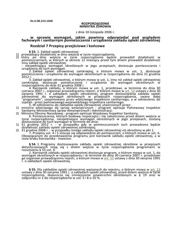 Dz.U.06.213.1568 ROZPORZĄDZENIE MINISTRA ZDROWIA z dnia 10 listopada 2006 r. w sprawie wymagań, jakim powinny odpowiadać pod względem fachowym i sanitarnym pomieszczenia i urządzenia zakładu opieki zdrowotnej Rozdział 7 Przepisy przejściowe i końcowe § 53. 1. Zakład opieki zdrowotnej: 1) prowadzący działalność w dniu wejścia w życie rozporządzenia, 2) który po dniu wejścia w życie rozporządzenia będzie prowadził działalność w pomieszczeniach, w których w okresie 12 miesięcy przed tym dniem prowadził działalność inny zakład opieki zdrowotnej - niespełniający wymagań określonych w jego przepisach, dostosuje pomieszczenia i urządzenia do tych wymagań. 2. Zakład opieki zdrowotnej zamkniętej, o którym mowa w ust. 1, dostosuje pomieszczenia i urządzenia do wymagań określonych w rozporządzeniu do dnia 31 grudnia 2012 r. 3. Zakład opieki zdrowotnej, o którym mowa w ust. 1, inny niż zakład opieki zdrowotnej zamkniętej, dostosuje pomieszczenia i urządzenia do wymagań określonych w rozporządzeniu do dnia 31 grudnia 2008 r. 4. Kierownik zakładu, o którym mowa w ust. 1, przedstawi, w terminie do dnia 30 czerwca 2007 r., organowi prowadzącemu rejestr, o którym mowa w art. 12 ustawy z dnia 30 sierpnia 1991 r. o zakładach opieki zdrowotnej, program dostosowania zakładu opieki zdrowotnej do wymagań określonych w przepisach rozporządzenia, zwany dalej "programem", zaopiniowany przez właściwego inspektora sanitarnego, a w odniesieniu do szpitali - przez państwowego wojewódzkiego inspektora sanitarnego. 5. W odniesieniu do zakładów opieki zdrowotnej utworzonych przez: 1) ministra właściwego do spraw wewnętrznych - program opiniuje Państwowy Inspektor Sanitarny Ministerstwa Spraw Wewnętrznych i Administracji; 2) Ministra Obrony Narodowej - program opiniuje Wojskowy Inspektor Sanitarny. 6. Pomieszczenia, których budowę rozpoczęto i nie zakończono przed dniem wejścia w życie rozporządzenia, niespełniające wymagań określonych w jego przepisach, zostaną dostosowane do tych wymagań w terminie do dnia: 1) 31 grudnia 2012 r. - w przypadku gdy w pomieszczeniach tych prowadzona będzie działalność zakładu opieki zdrowotnej zamkniętej; 2) 31 grudnia 2008 r. - w przypadku innego zakładu opieki zdrowotnej niż określony w pkt 1. 7. Przepisy ust. 4 i 5 stosuje się odpowiednio do pomieszczeń, o których mowa w ust. 6. Obowiązanym do przedstawienia programu jest kierownik zakładu opieki zdrowotnej, a w razie braku kierownika - inwestor. § 54. 1. Programy dostosowania zakładu opieki zdrowotnej określone w przepisach dotychczasowych stają się z dniem wejścia w życie rozporządzenia programami w rozumieniu § 53 ust. 4. 2. Kierownik zakładu opieki zdrowotnej dostosuje program, o którym mowa w ust. 1, do wymagań określonych w rozporządzeniu i w terminie do dnia 30 czerwca 2007 r. przedstawi go organowi prowadzącemu rejestr, o którym mowa w art. 12 ustawy z dnia 30 sierpnia 1991 r. o zakładach opieki zdrowotnej. § 55. Dla zakładów opieki zdrowotnej wpisanych do rejestru, o którym mowa w art. 12 ustawy z dnia 30 sierpnia 1991 r. o zakładach opieki zdrowotnej, przed dniem wejścia w życie rozporządzenia, dopuszcza się zmniejszenie powierzchni określonych w § 19 oraz w załączniku nr 2 do rozporządzenia w ust. 5 i 8 o 10 %. ZAŁĄCZNIK Nr 1 WYMAGANIA SZCZEGÓŁOWE, JAKIM POWINNY ODPOWIADAĆ POD WZGLĘDEM FACHOWYM I SANITARNYM POMIESZCZENIA I URZĄDZENIA SZPITALA III. Oddział anestezjologii i intensywnej terapii 1. Usytuowanie oddziału powinno zapewnić komunikację z zespołem operacyjnym, oddziałem ratunkowym lub oddziałem doraźnej pomocy, oddziałem przyjęć oraz z wszystkimi oddziałami łóżkowymi. Wejście do oddziału powinno prowadzić przez śluzę służącą do przekazania pacjenta, będącą równocześnie śluzą umywalkowo-fartuchową dla pracowników. 2. Stanowisko nadzoru pielęgniarskiego powinno zapewniać personelowi bezpośredni kontakt wzrokowy lub przy użyciu kamer z wszystkimi łóżkami, a w szczególności możliwość obserwacji twarzy pacjentów. 3. W oddziale powinna być urządzona izolatka dostępna z traktów komunikacji oddziału. 4. W oddziale powinien być magazyn sprzętu i aparatury. 5. Liczba łóżek na oddziale anestezjologii i intensywnej terapii powinna stanowić 2-5 % ogólnej liczby łóżek w szpitalu. 6. Oddział powinien być wyposażony w następującą aparaturę i sprzęt medyczny: 1) aparat do pomiaru ciśnienia tętniczego krwi metodą inwazyjną - 1 na 2 stanowiska intensywnej terapii; 2) elektryczne urządzenie do ssania - 1 na 3 stanowiska intensywnej terapii, ale nie mniej niż 2 w oddziale; 3) stymulator zewnętrzny - 1 na oddział oraz dodatkowe wyposażenie stanowiska intensywnej terapii; 4) urządzenie do pomiaru rzutu serca - 1 na 4 stanowiska intensywnej terapii; 5) aparat do hemodializy lub hemofiltracji maszynowej - 1 na oddział liczący co najmniej 8 stanowisk intensywnej terapii, jeżeli w szpitalu nie ma odcinka (stacji) dializ; 6) bronchofiberoskop - 1 na oddział; 7) aparat do monitorowania ciśnienia wewnątrzczaszkowego - 1 na oddział liczący co najmniej 6 stanowisk intensywnej terapii; 8) przyłóżkowy aparat rtg - 1 na oddział; 9) defibrylator z możliwością wykonania kardiowersji - 2 na oddział. 7. Stanowisko intensywnej terapii powinno być wyposażone w: łóżko do intensywnej terapii; respirator z możliwością regulacji stężenia tlenu w zakresie 21-100 %; źródło tlenu, powietrza i próżni; zestaw do intubacji i wentylacji (worek samorozprężalny); sprzęt do szybkich oraz regulowanych przetoczeń płynów, w tym co najmniej 6 pomp infuzyjnych; 6) kardiomonitor; 7) pulsoksymetr; 8) kapnograf; 9) aparat do automatycznego pomiaru ciśnienia krwi metodą nieinwazyjną; 10) respirator transportowy; 11) materac do ogrzewania pacjentów w oddziale pediatrycznym - 2 na oddział; 12) fonendoskop. 1) 2) 3) 4) 5) 8. S
